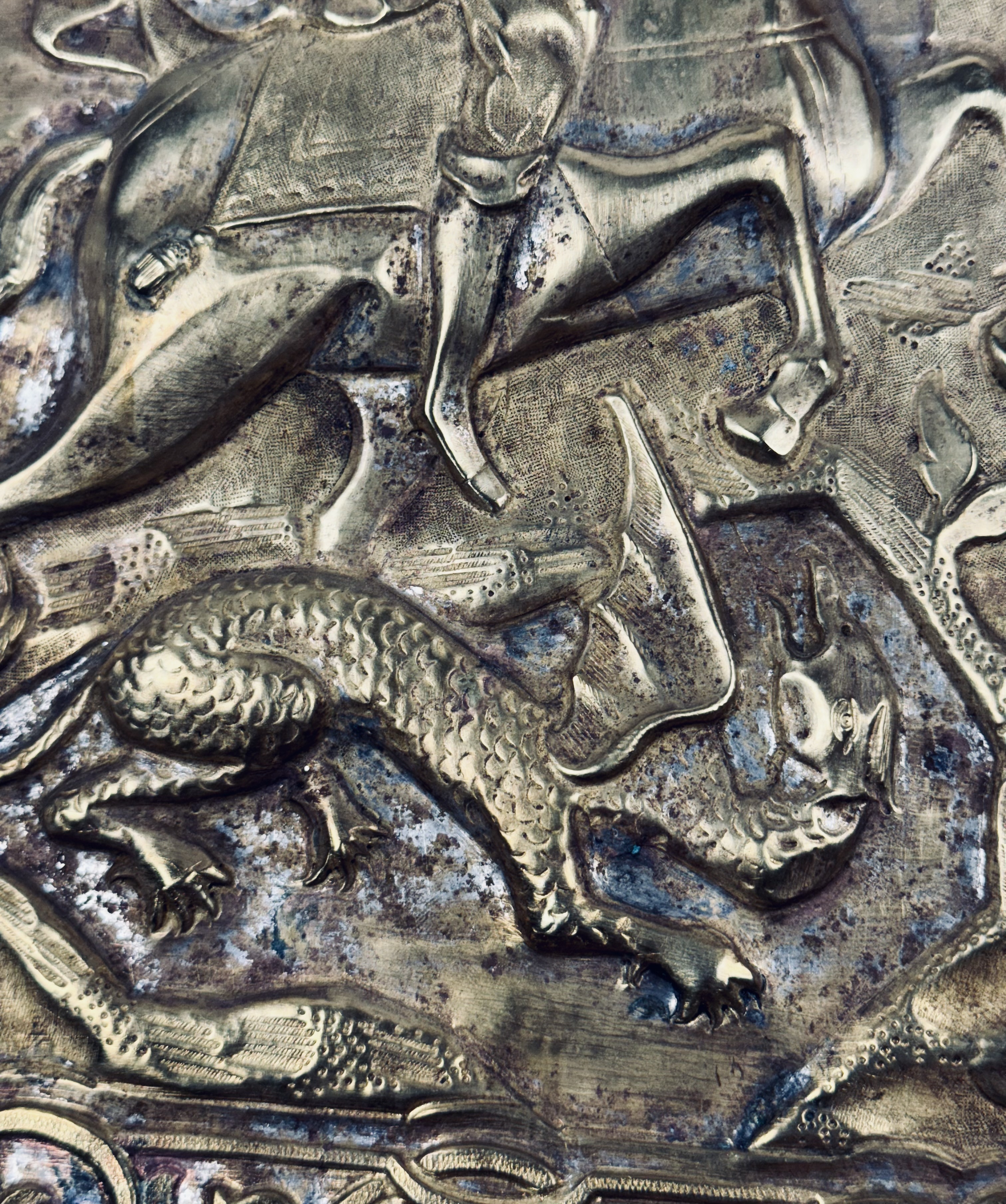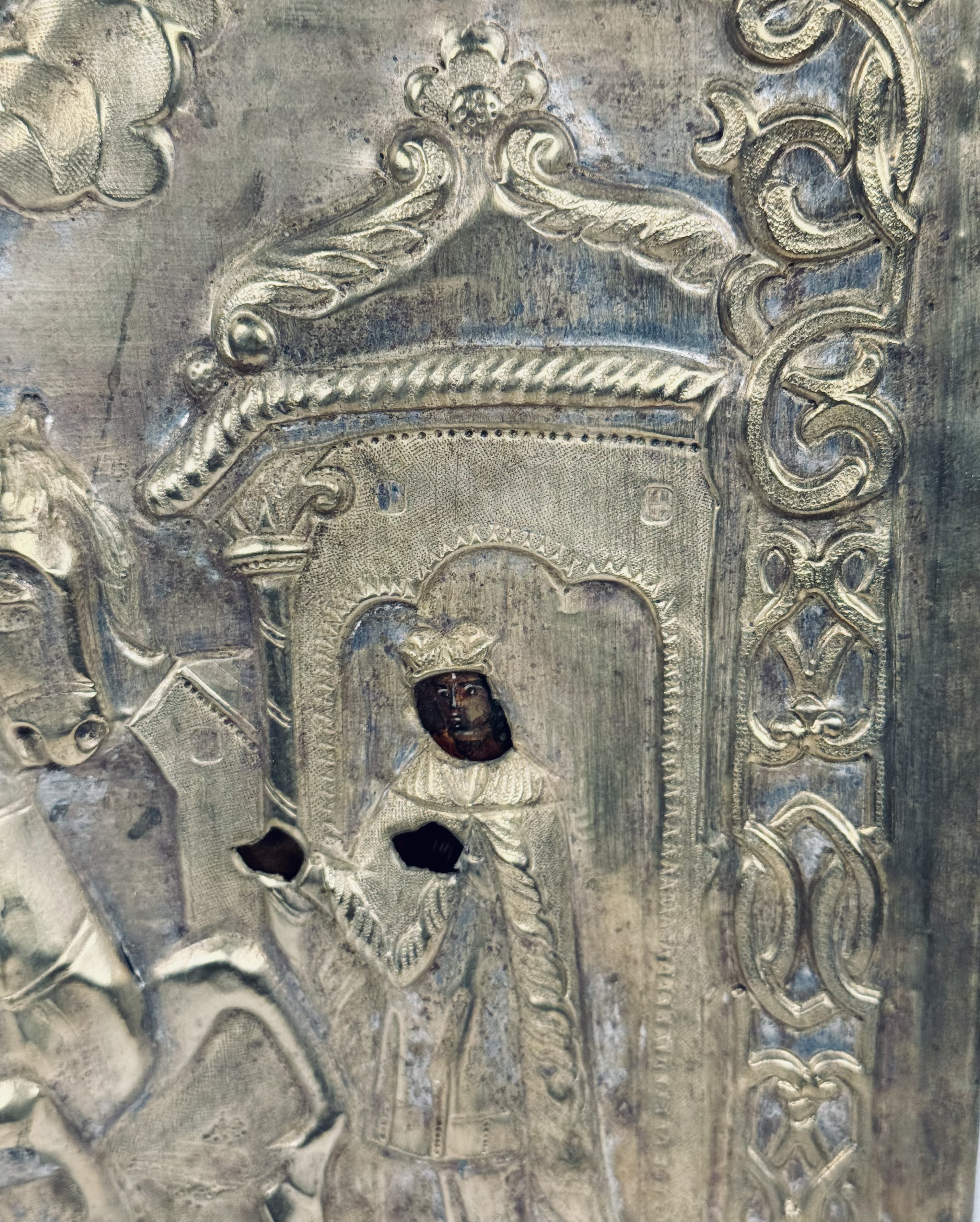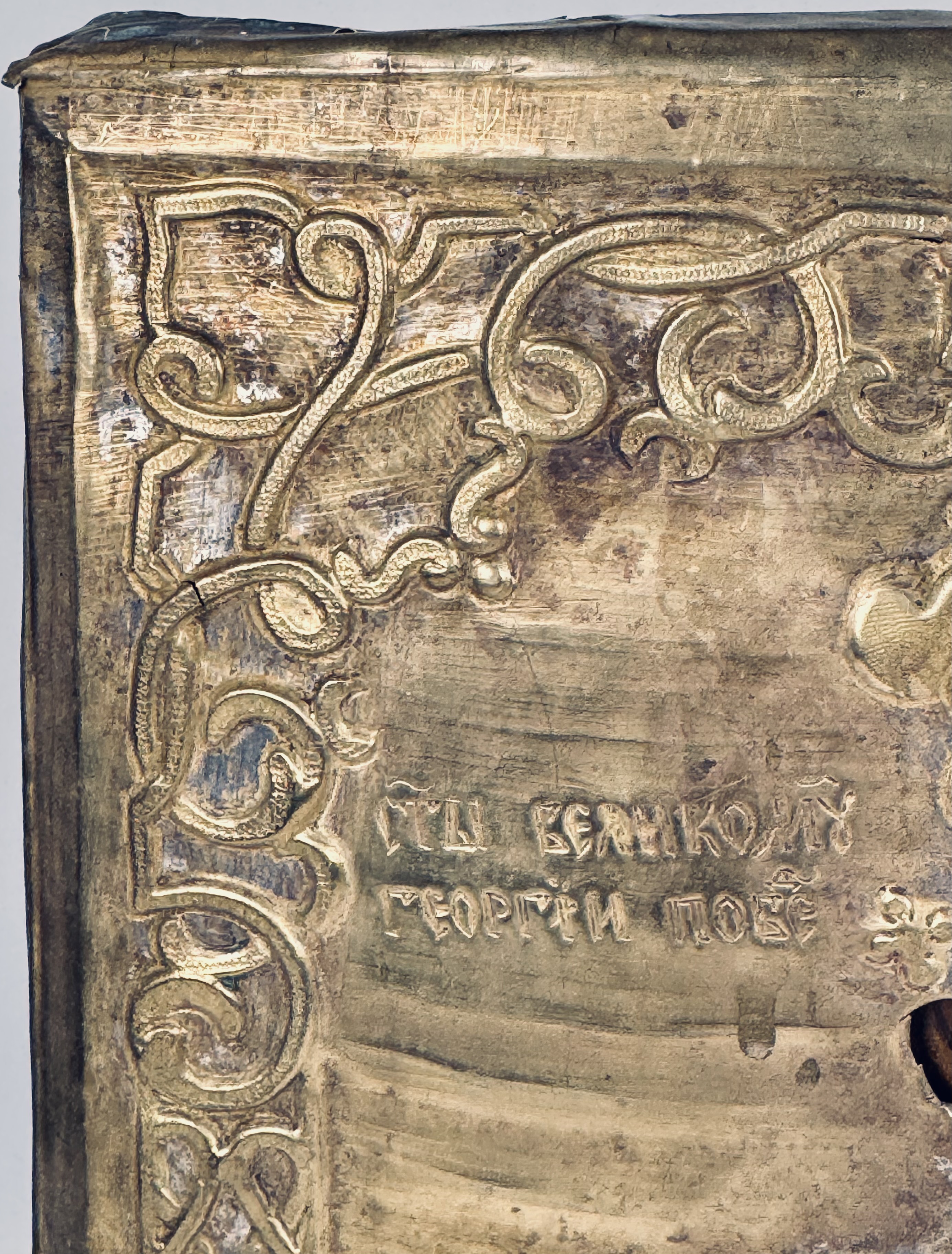 The Great Martyr Saint George is depicted as a mounted soldier striking with a lance a dragon beneath his horse. On the right is the town of Silene with a princess Elisaba, whose fate is in George’s hands, standing at the gate. The scene is titled in Old Slavonic as "Saint George the Victorybearer." The oldest icons depicting Saint George as a horseman killing the dragon date to the 12th century. The motif becomes popular especially in Georgian and Russian traditions, but it is also found in Greek icons.