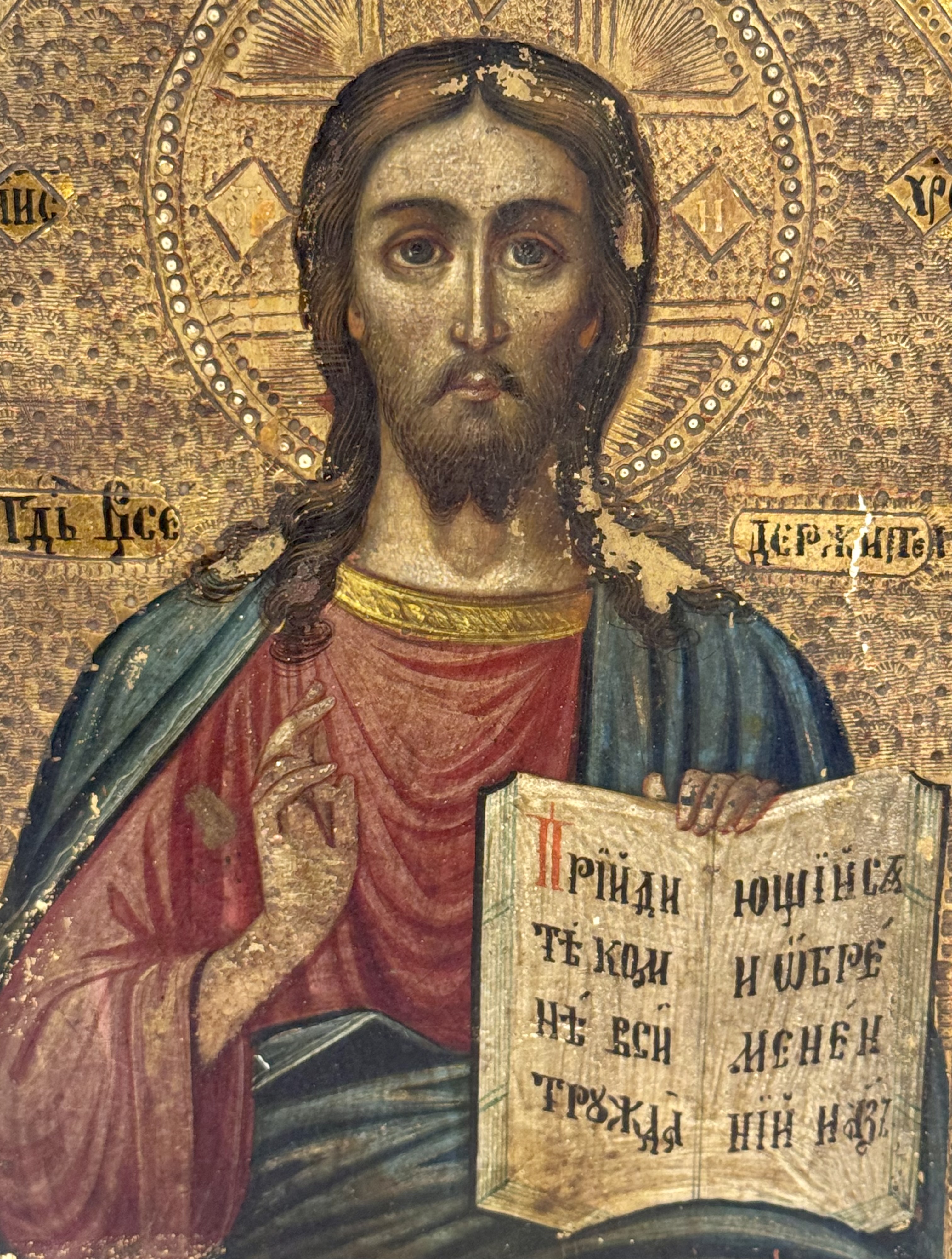Christ Pantocrator is one of the most common subjects in Russian iconography, and its iconography follows a traditional pattern. In these icons, Christ is depicted as a powerful and majestic figure, with his right hand raised in blessing and his left hand holding an open book of the Gospels. The term "Pantocrator" means "Almighty" or "Ruler of All," and the image of Christ in this role conveys his power and authority as the divine judge and ruler of the world. The icon portrays Christ with a stern expression, indicating his righteous judgment and the seriousness of his message. The icon's composition features Christ's head and shoulders in the center of the image, with his body slightly turned to the right. He is shown wearing a red tunic and blue mantle, with his long hair and beard flowing around his face. The Gospels are opened on Matthew 11:28 “Come unto me, all ye that labor and are heavy laden, and I will give you rest.”