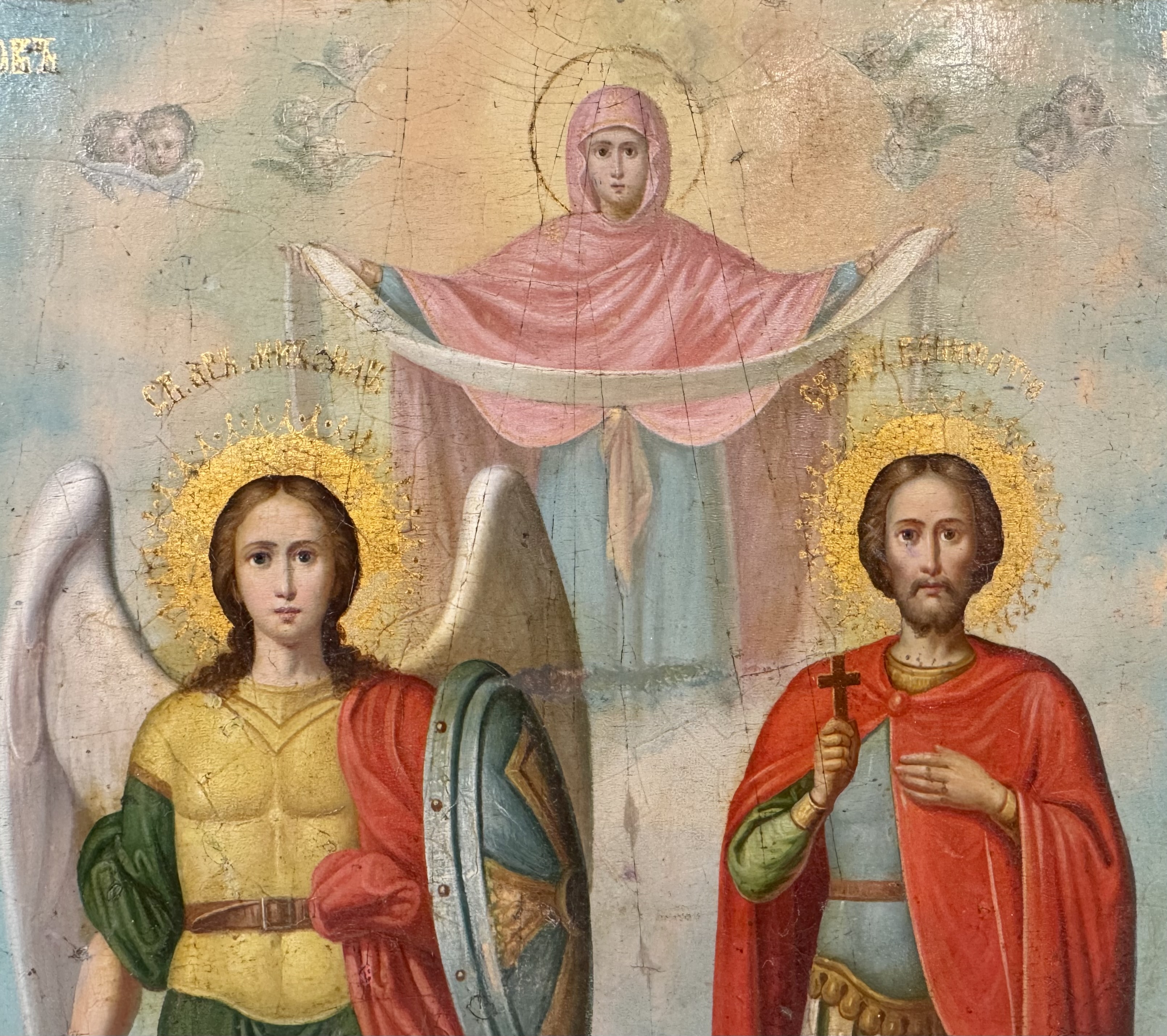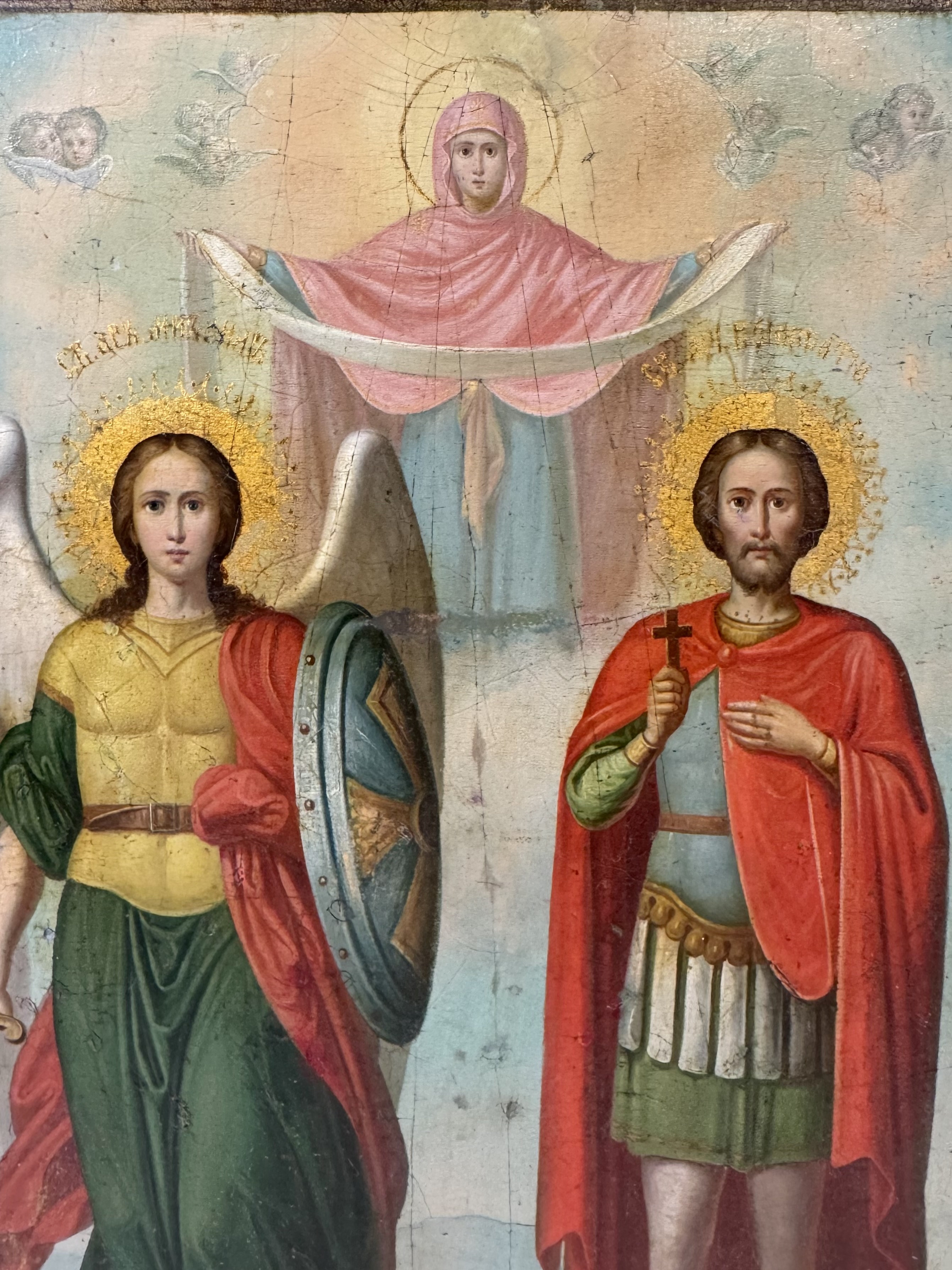 The finely painted icon depicts the Guardian Angel and St. Boniface of Tarsus under the image of Our Lady of Pokrov.