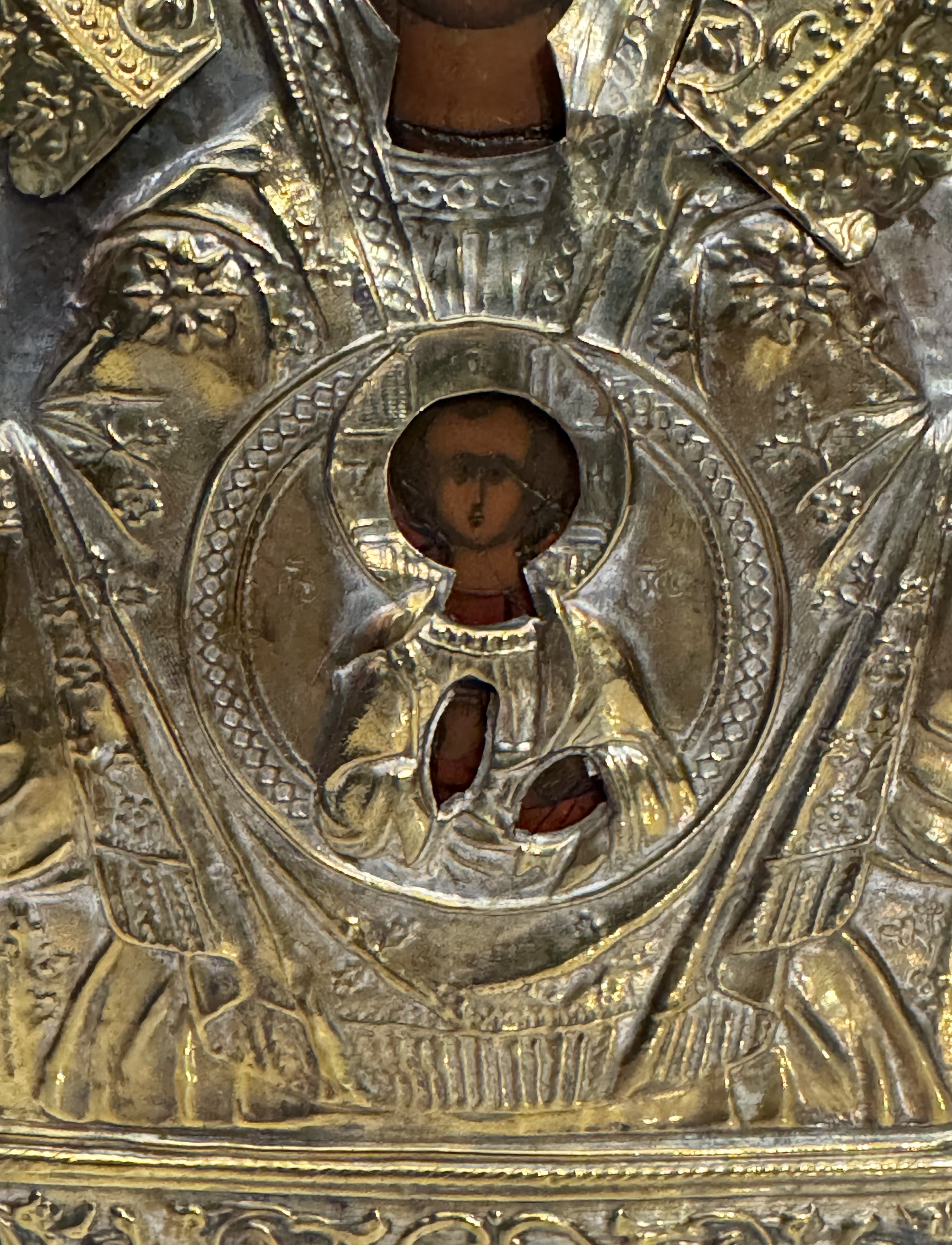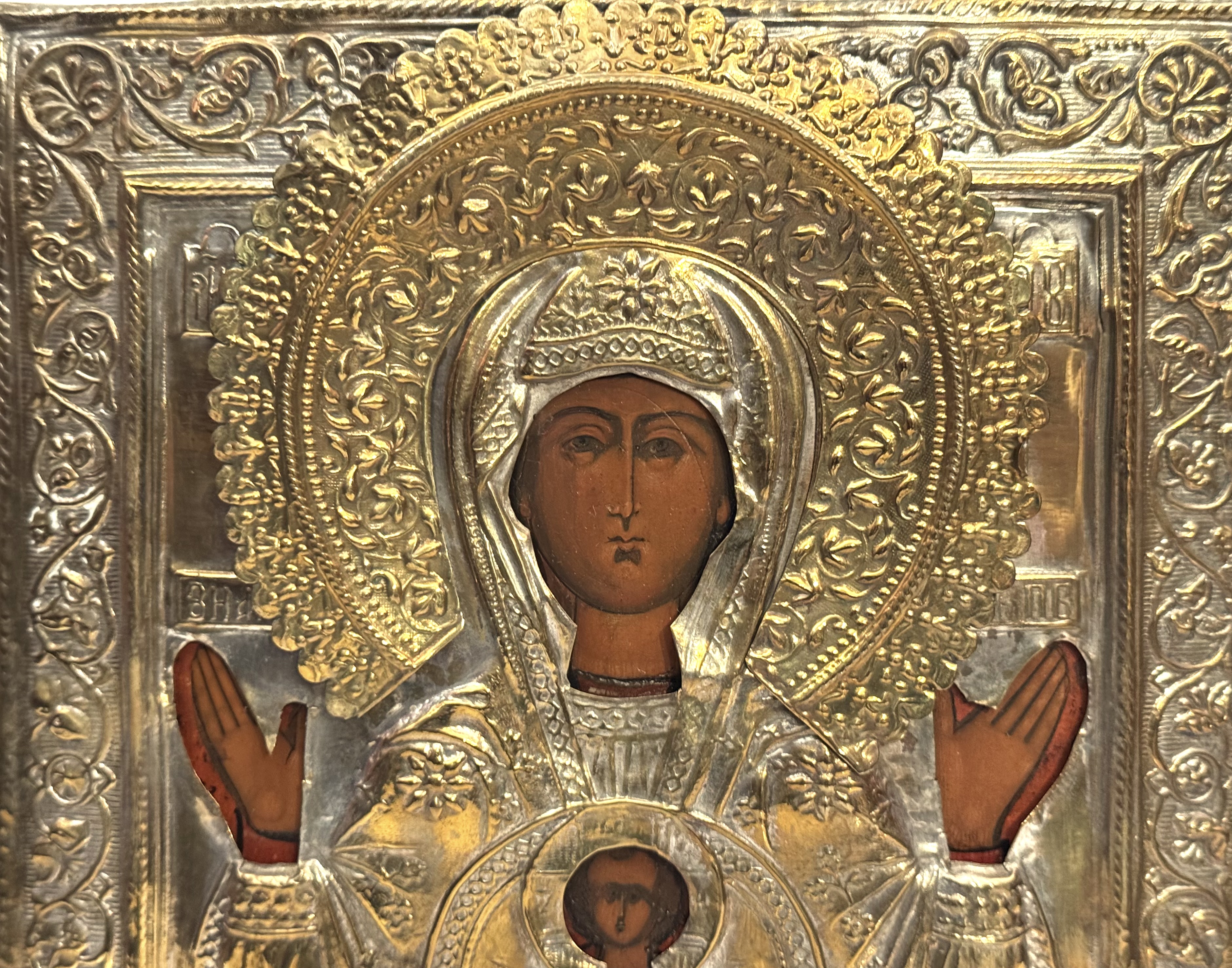 Our Lady of the Sign is one of the most beloved Russian miracle-working icons of Theotokos. The icon depicts Her during the Annunciation at the moment of saying, "May it be done to me according to your word." (Luke 1:38). The Virgin Mary is depicted frontally half-length, with her hands raised in a praying position, and the Child Jesus within a round aureole upon her breast representing him at the moment of his conception. The term Virgin of the Sign is a reference to the prophecy of Isaiah 7:14: "Therefore the Lord himself shall give you a sign; Behold, a virgin shall conceive, and bear a son, and shall call his name Immanuel."