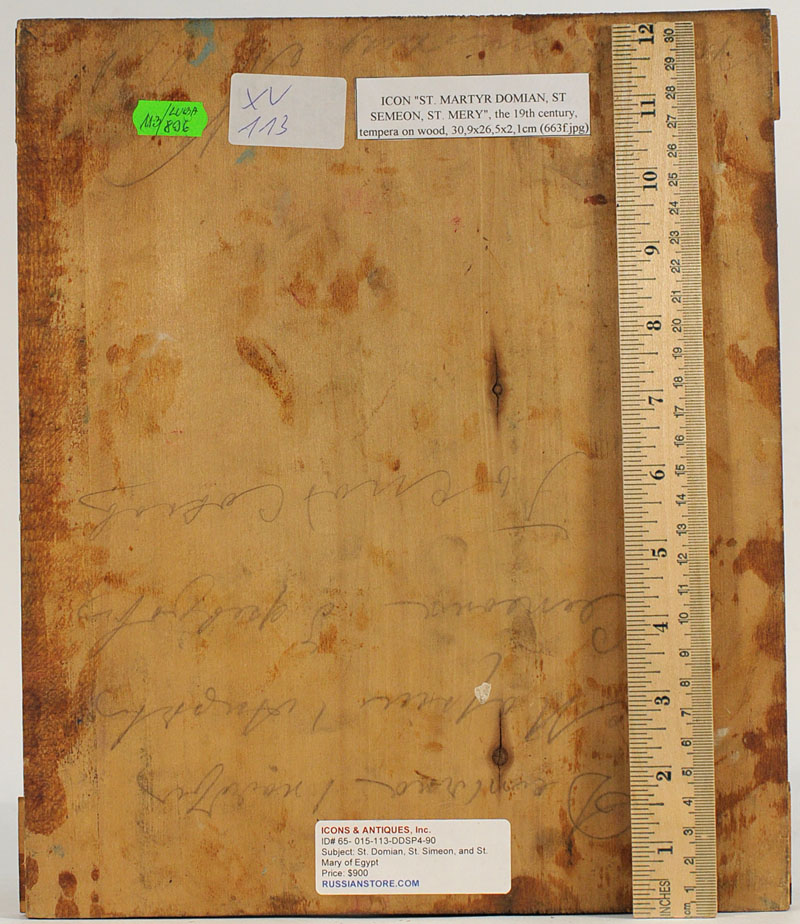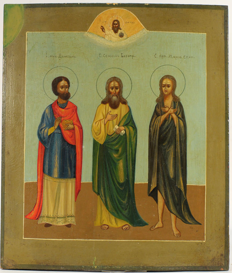 Russian Icon depicting Three Orthodox Saints: St. Martyr Domian, St. Simeon God Receiver, and St. Mary of Egypt