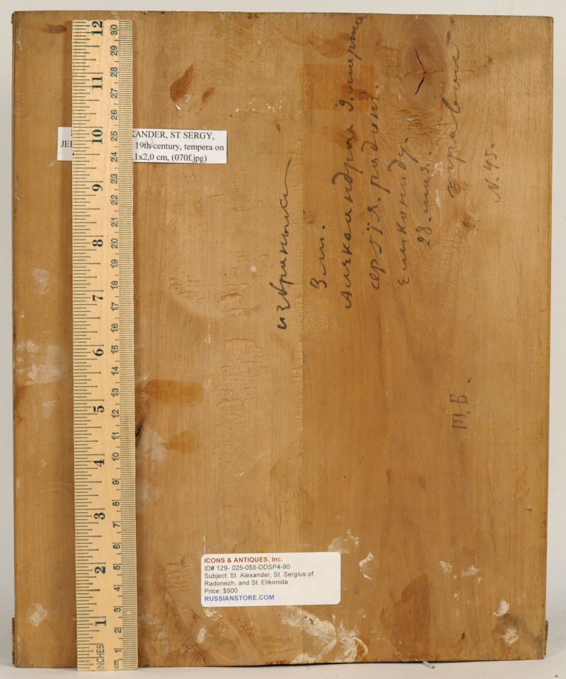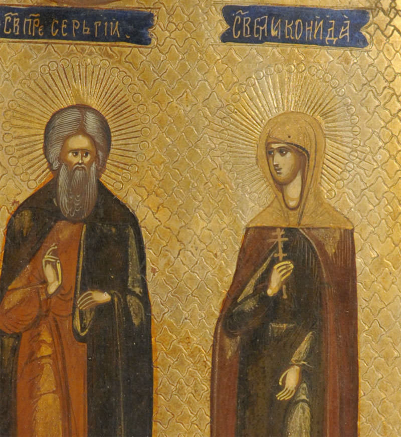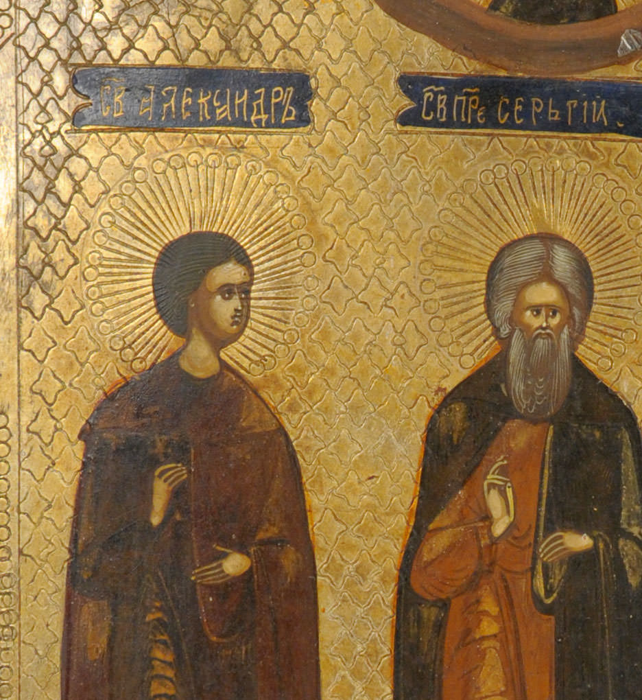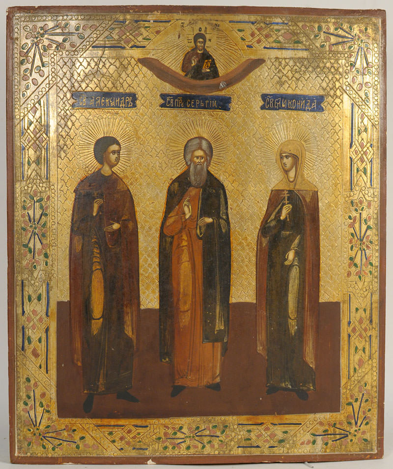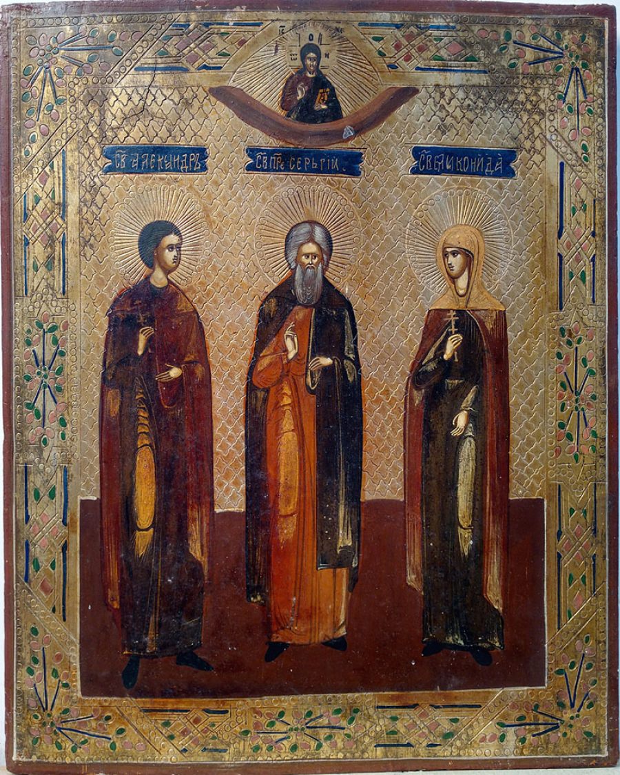 Russian icon depicting three Orthodox Saints: Saint Alexander, Saint Sergius of Radonezh, and Saint Martyr Elikonida