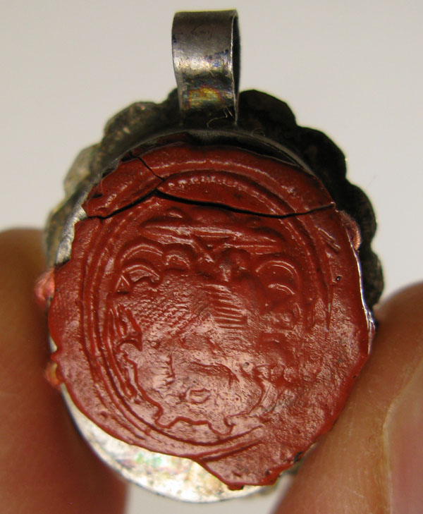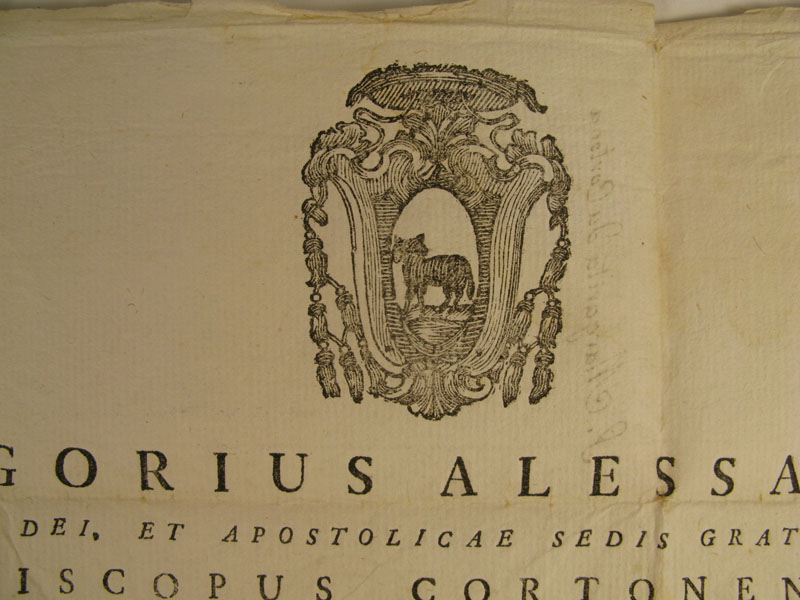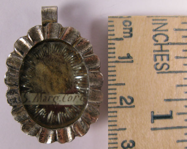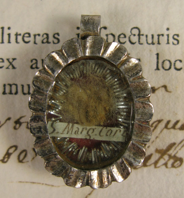18th century small oval glass-fronted silver reliquary theca housing relic of Saint Margaret of Cortona, T.O.S.F.,. The relic is affixed to silk background decorated with silver cord and identified on a manuscript cedulae as S. Marg. Cort. On the back, the theca is secured with perfectly preserved seal of red Spanish wax bearing an imprint of a coat of arms of Fr. GregorioAlessandri (†), Bishop of Cortona (1773-1802). It is accompanied by original matching authentics document issued by Fr. Alessandri in 1786.