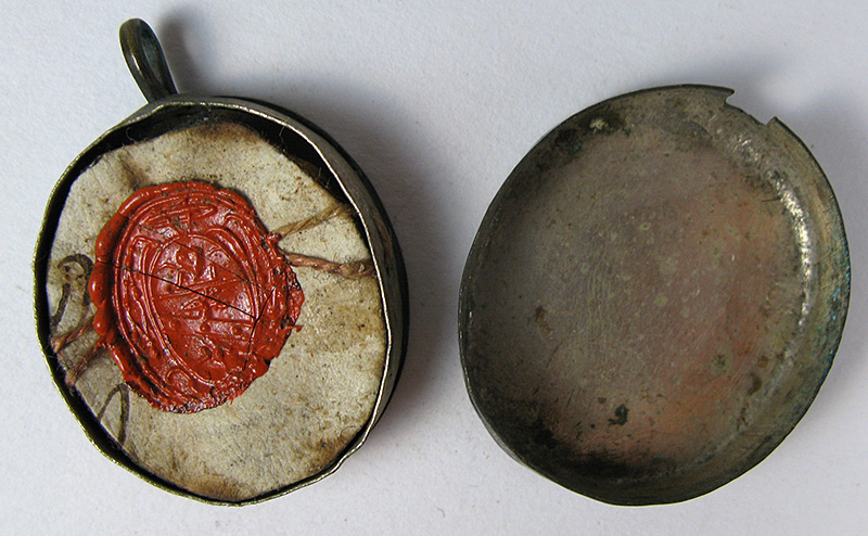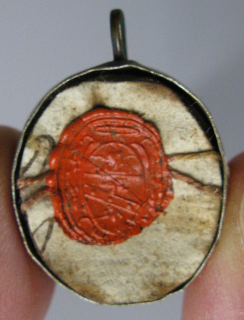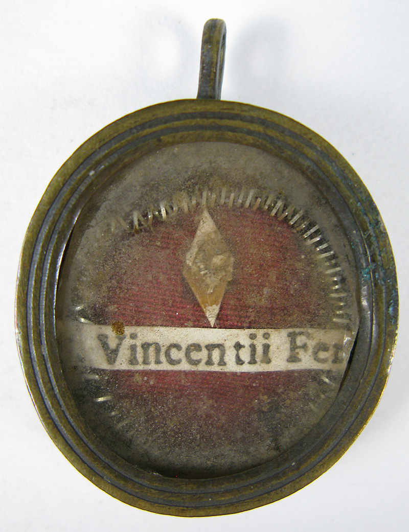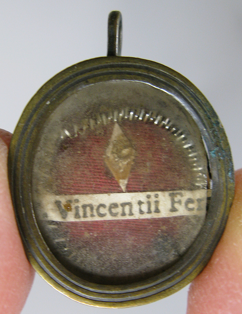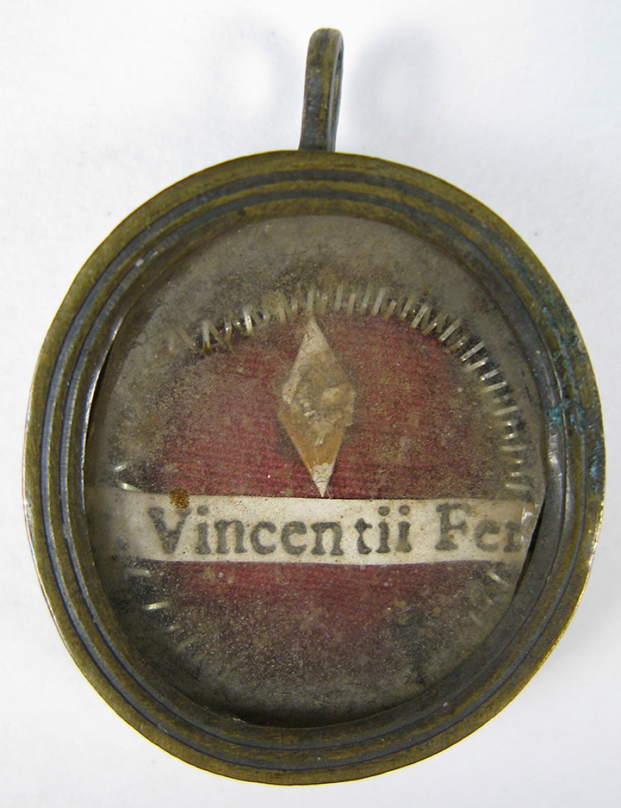Oval glass-fronted brass theca housing the first-class ex ossibus (bone) relic of Saint Vincent Ferrer. The relic is affixed to a red silk background surrounded by silver wire ornamentation and identified on a typeset cedula label as S. Vincentii Fer.. On the back, under a protective cap, the theca is secured by a seal of red Spanish wax with an imprint of a coat of arms of an unidentified Roman Catholic Bishop.