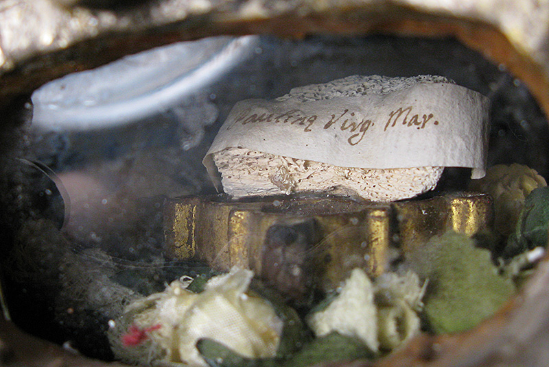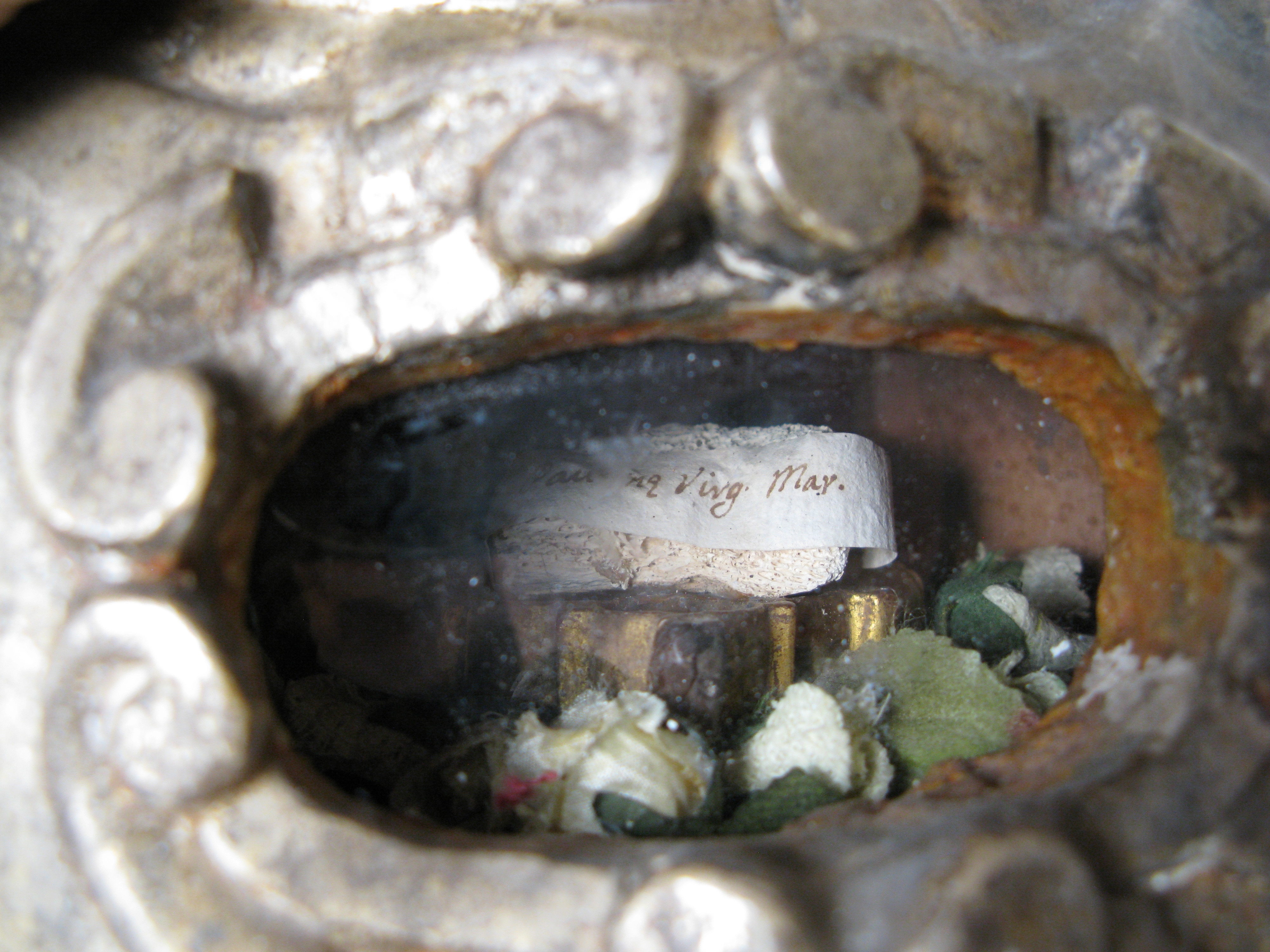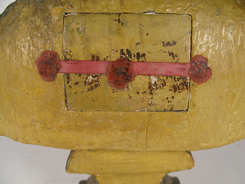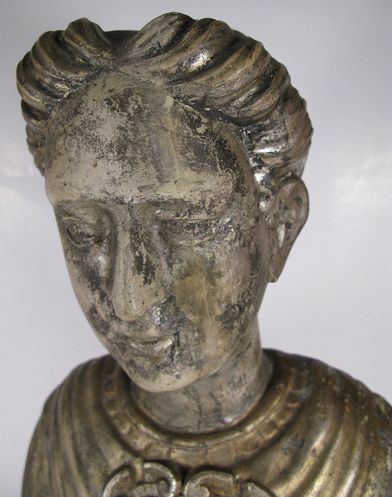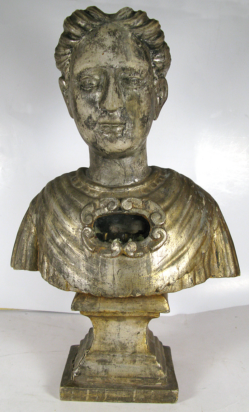 A life-size bust-form reliquary dating to the 18th century made of silvered painted wood housing very large historically important first-class ex ossibus (of the bone) relic of Saint Paulina. The relic is affixed inside an oval glass-fronted opening and identified on paper cedula label in as S. Paulinae, Virg. Mar. (Saint Paulina, Virgin & Martyr). On the back of the reliquary, the opening to access the relic cavity is protected by a red silk ribbon with three seals of red Spanish wax with an imprint of a coat of arms of Cardinal Marcantonio Colonna (†1793), Archpriest of the Basilica di Santa Maria Maggiore and Vicar General of the Roman Curia.