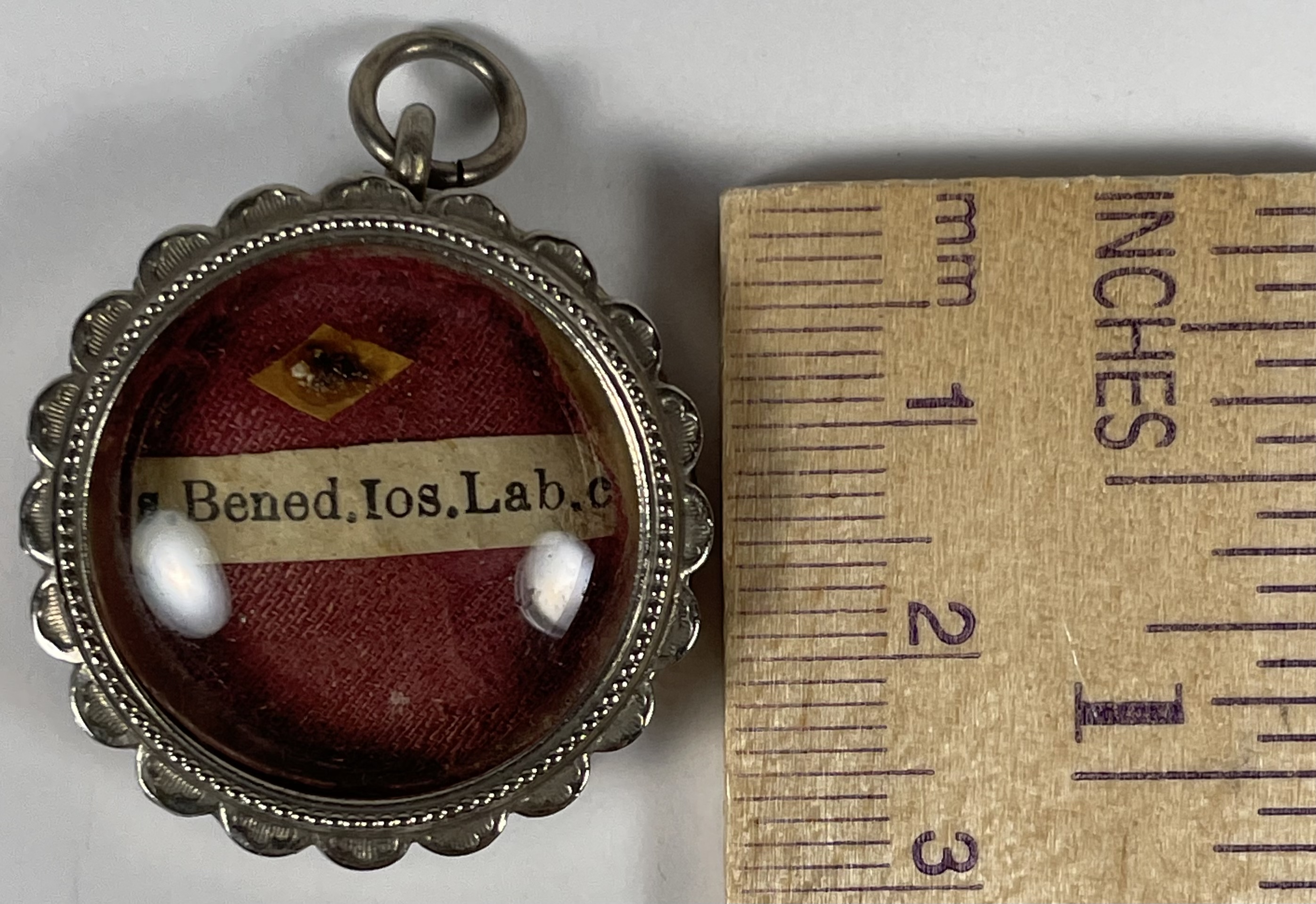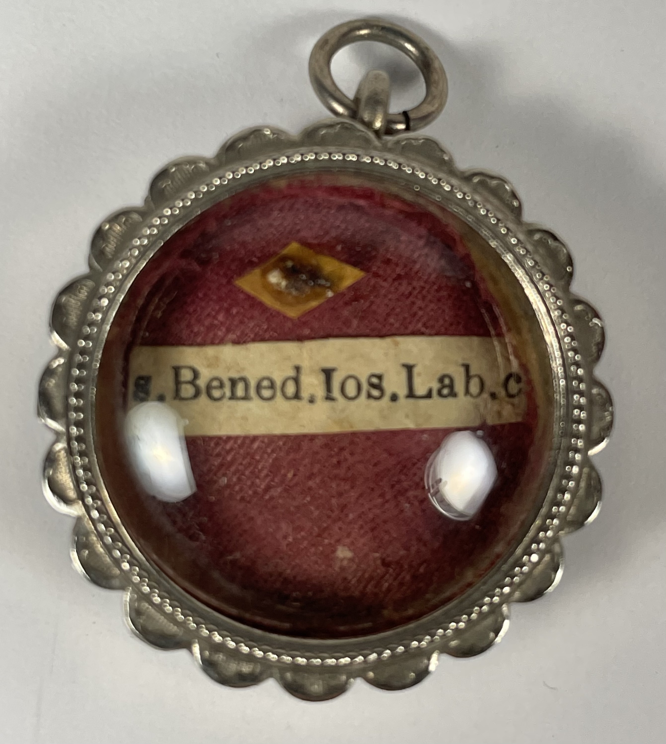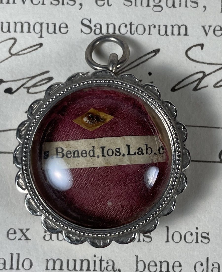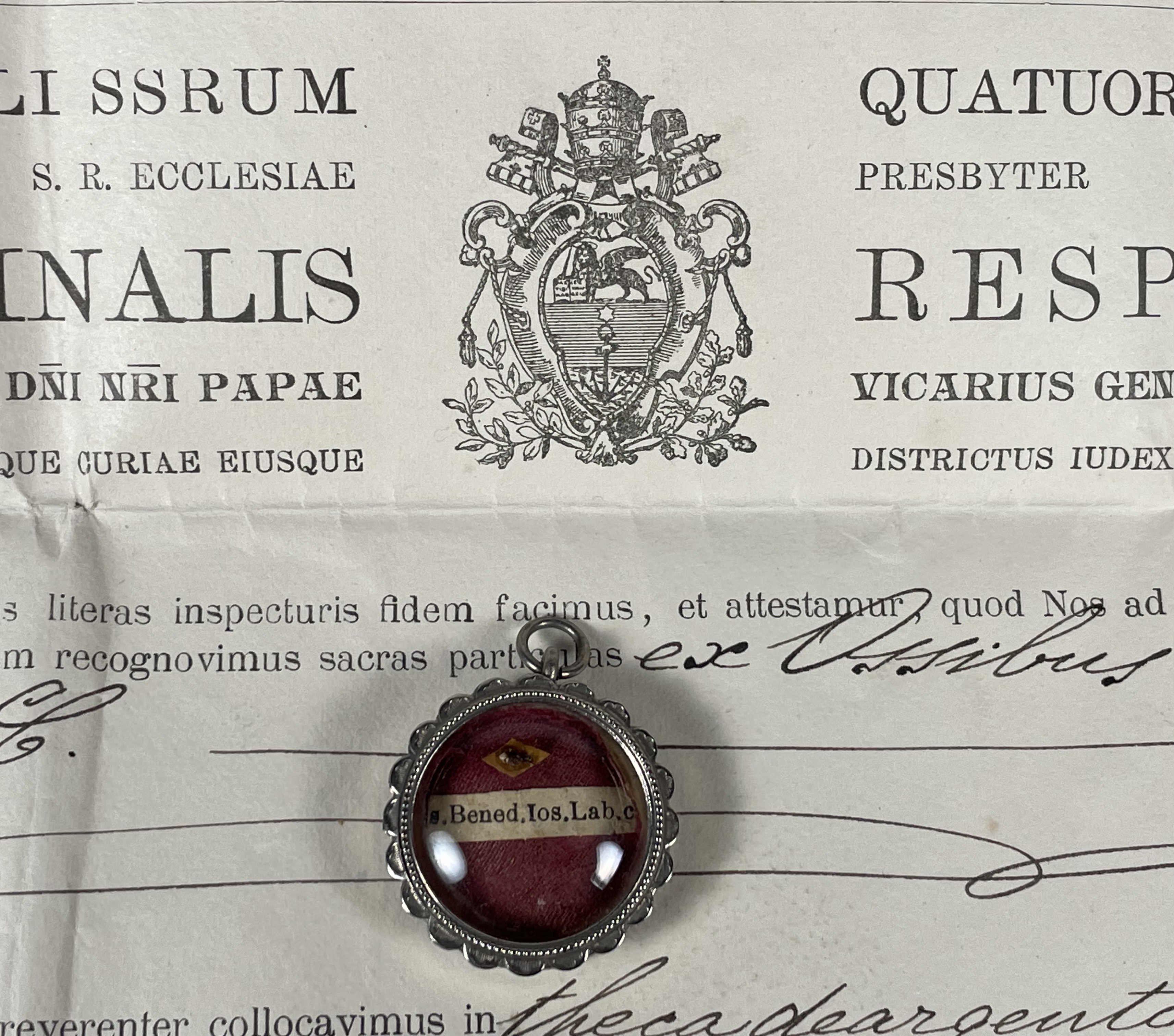 Round glass-fronted metal reliquary theca housing the first-class-class ex ossibus (of the bone) relics of Saint Benedict Joseph Labre, T.O.S.F. The relic is affixed to a red silk ground and identified in Latin on a typeset cedula label as S. Bened. Ios. Lab. C. (Saint Benedict Joseph Labre, Confessor). On the back, under a protective cap, the theca is secured with a seal of red Spanish wax bearing an imprint of a coat of arms of Cardinal Pietro Respighi (†1913), Vicar General of Rome (1900-1913). The relic is accompanied by an original matching authentics document issued and signed in 1908 by MonsignorRespighi.