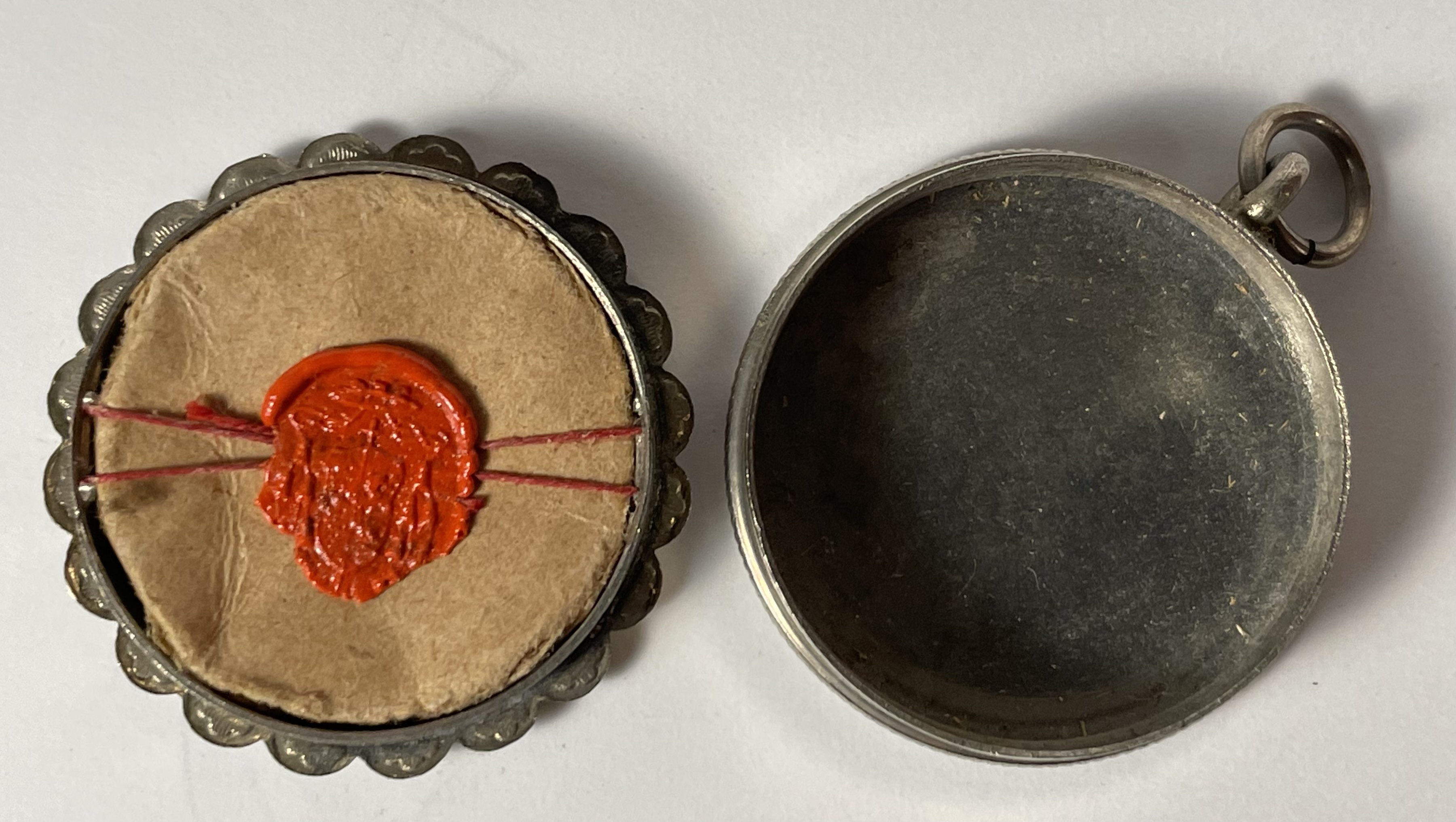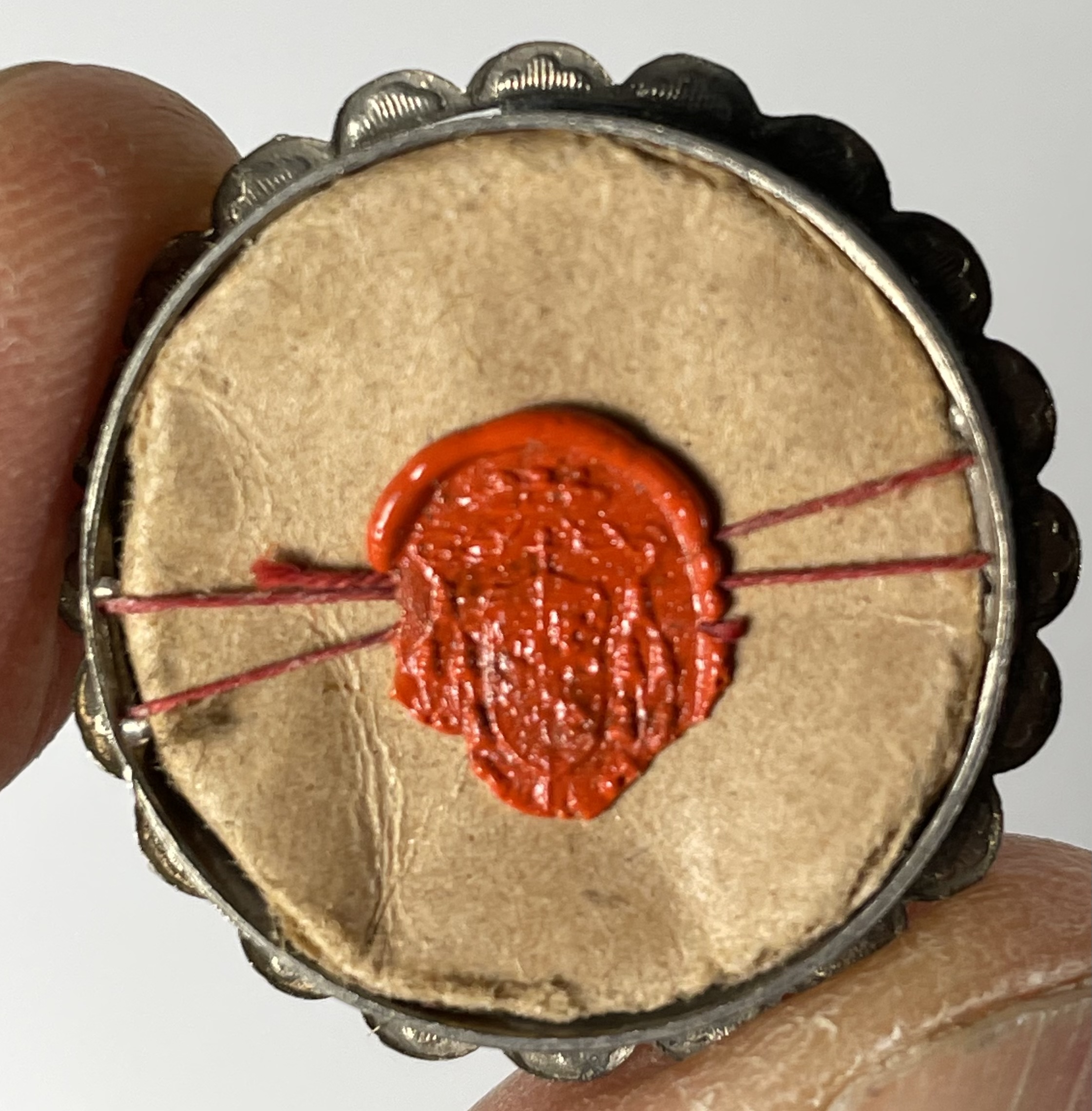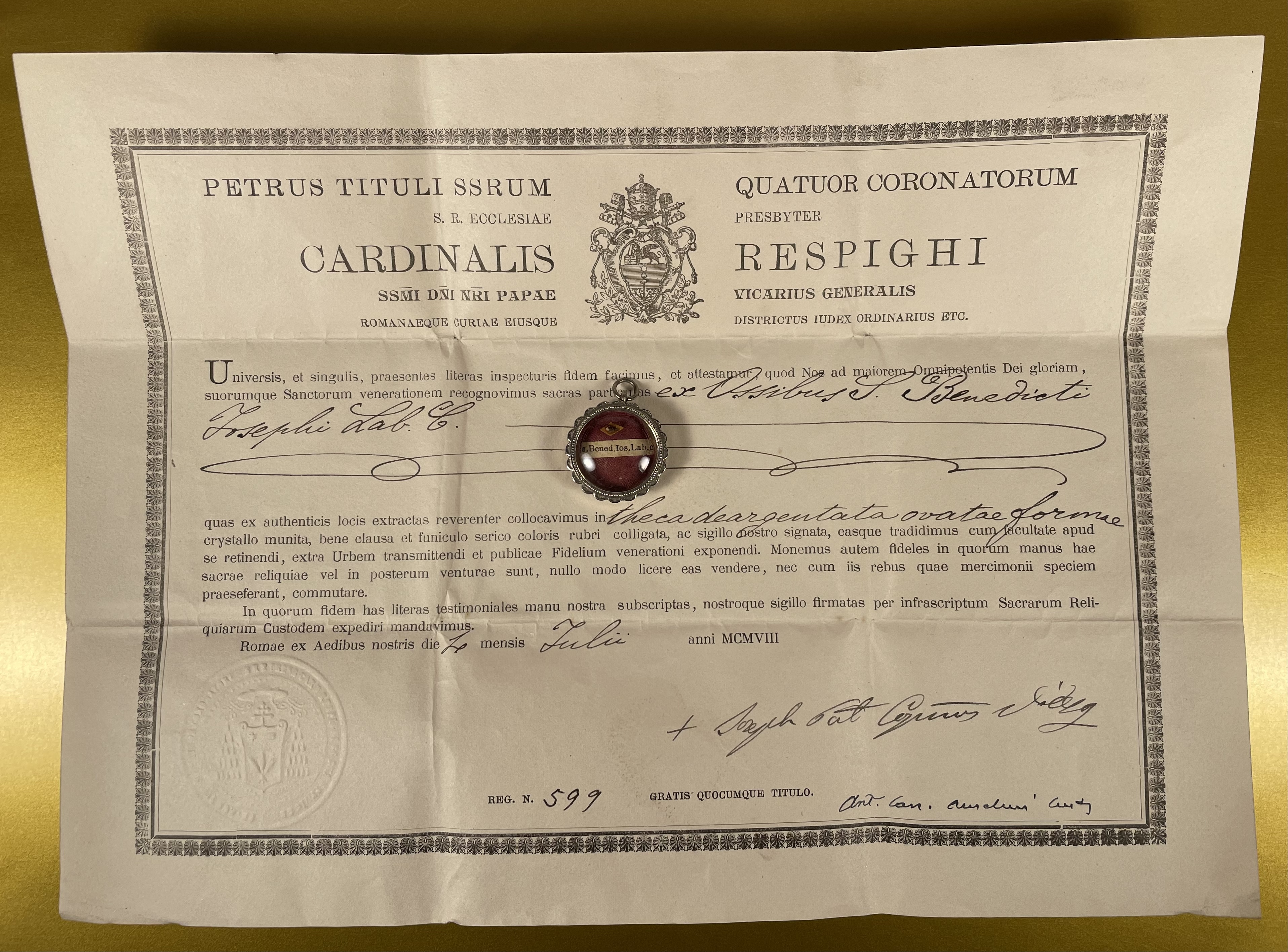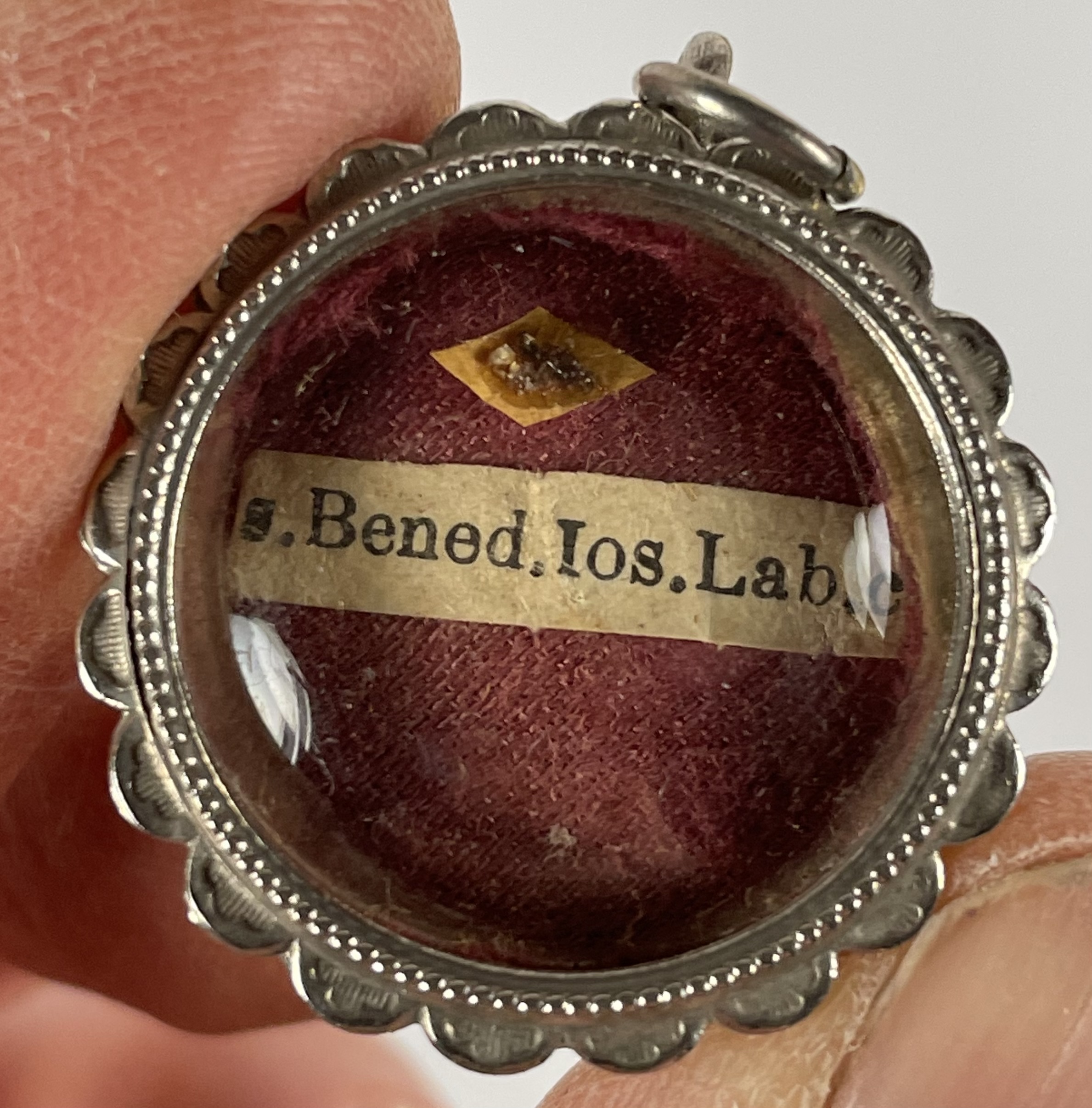 Round glass-fronted metal reliquary theca housing the first-class-class ex ossibus (of the bone) relics of Saint Benedict Joseph Labre, T.O.S.F. The relic is affixed to a red silk ground and identified in Latin on a typeset cedula label as S. Bened. Ios. Lab. C. (Saint Benedict Joseph Labre, Confessor). On the back, under a protective cap, the theca is secured with a seal of red Spanish wax bearing an imprint of a coat of arms of Cardinal Pietro Respighi (†1913), Vicar General of Rome (1900-1913). The relic is accompanied by an original matching authentics document issued and signed in 1908 by MonsignorRespighi.