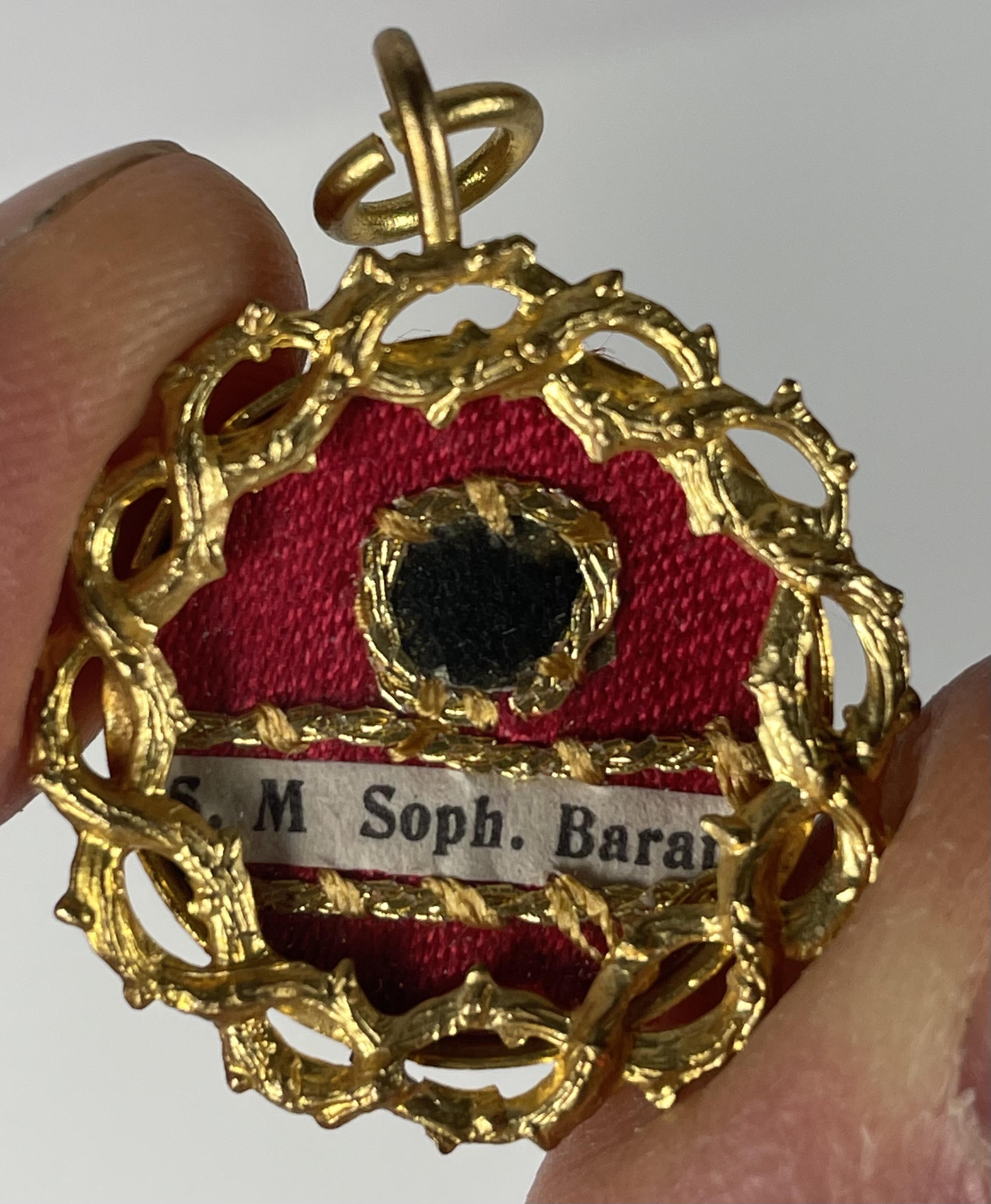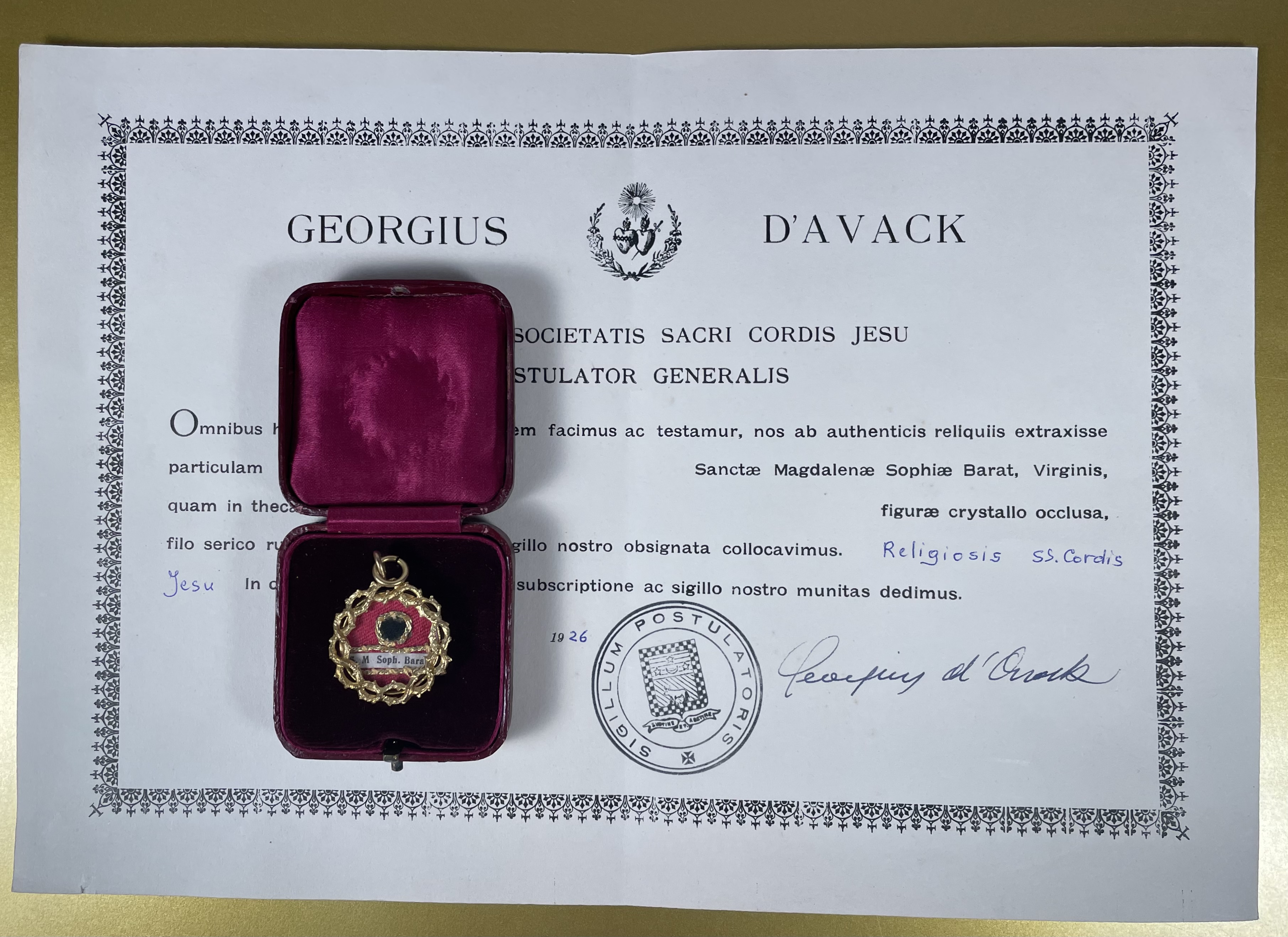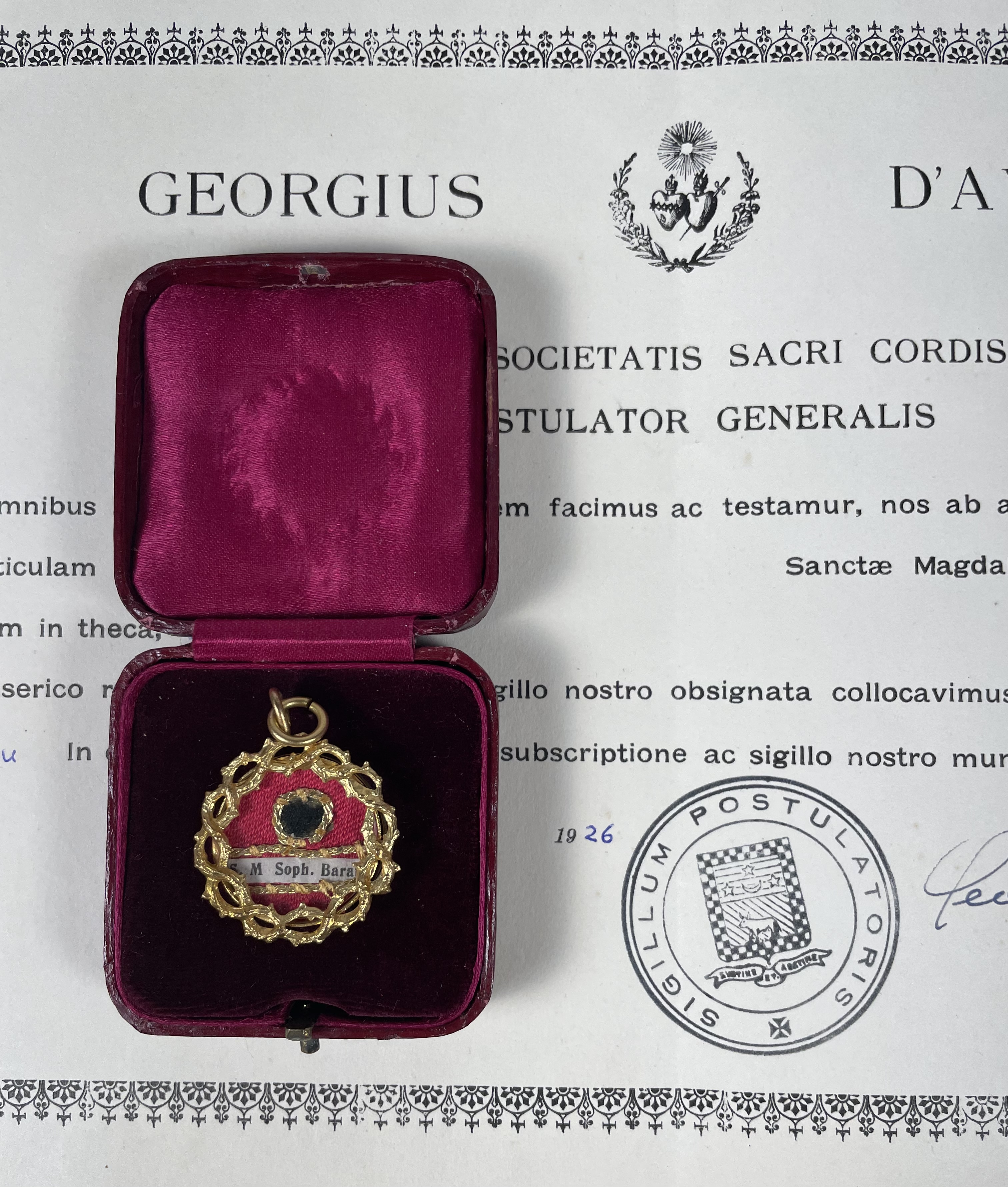 Round yellow-metal glass-fronted reliquary theca housing a second-class ex vestimentis (of the vestments) relic of the St. Madeleine Sophie Barat, R.S.C.J. The relic is affixed to a red silk ground decorated by a gilt-silver cord and identified in Latin on a typeset cedula label as S. M. Soph. Barat. (St. Madeleine Sophie Barat). On the back, under a protective cap, the theca is secured with a seal of red Spanish wax bearing an imprint of a coat of arms of the Society of the Sacred Heart. The relic is accompanied by the original matching authentics document issued and sealed in 1926 by the Postulator General of the Order and comes in the original leather-clad fitted case of issue.