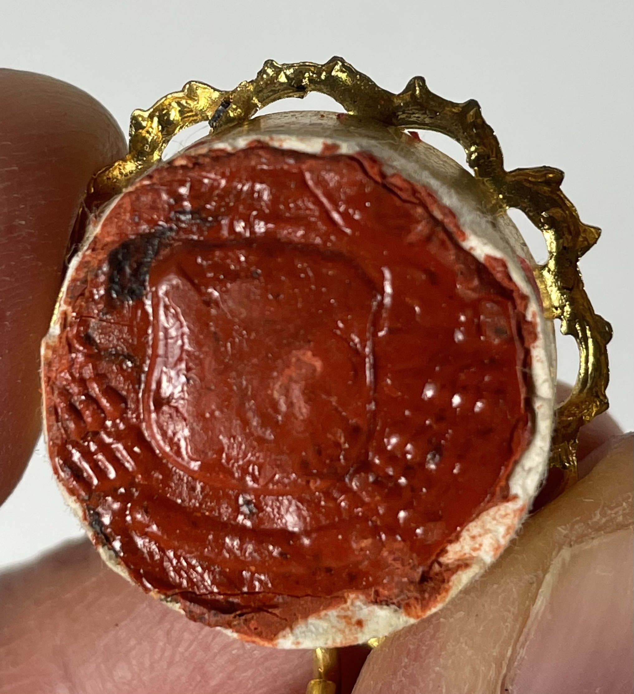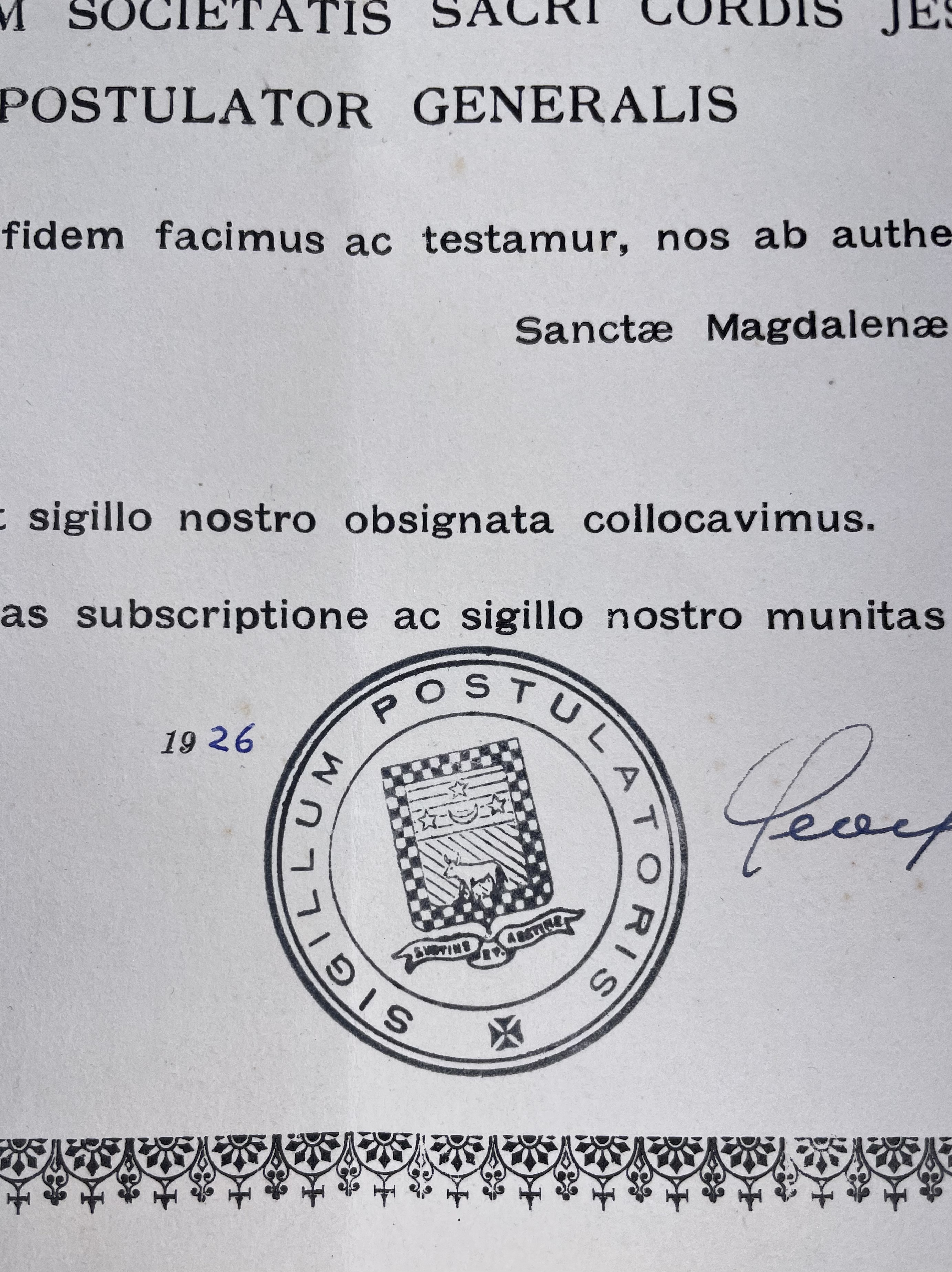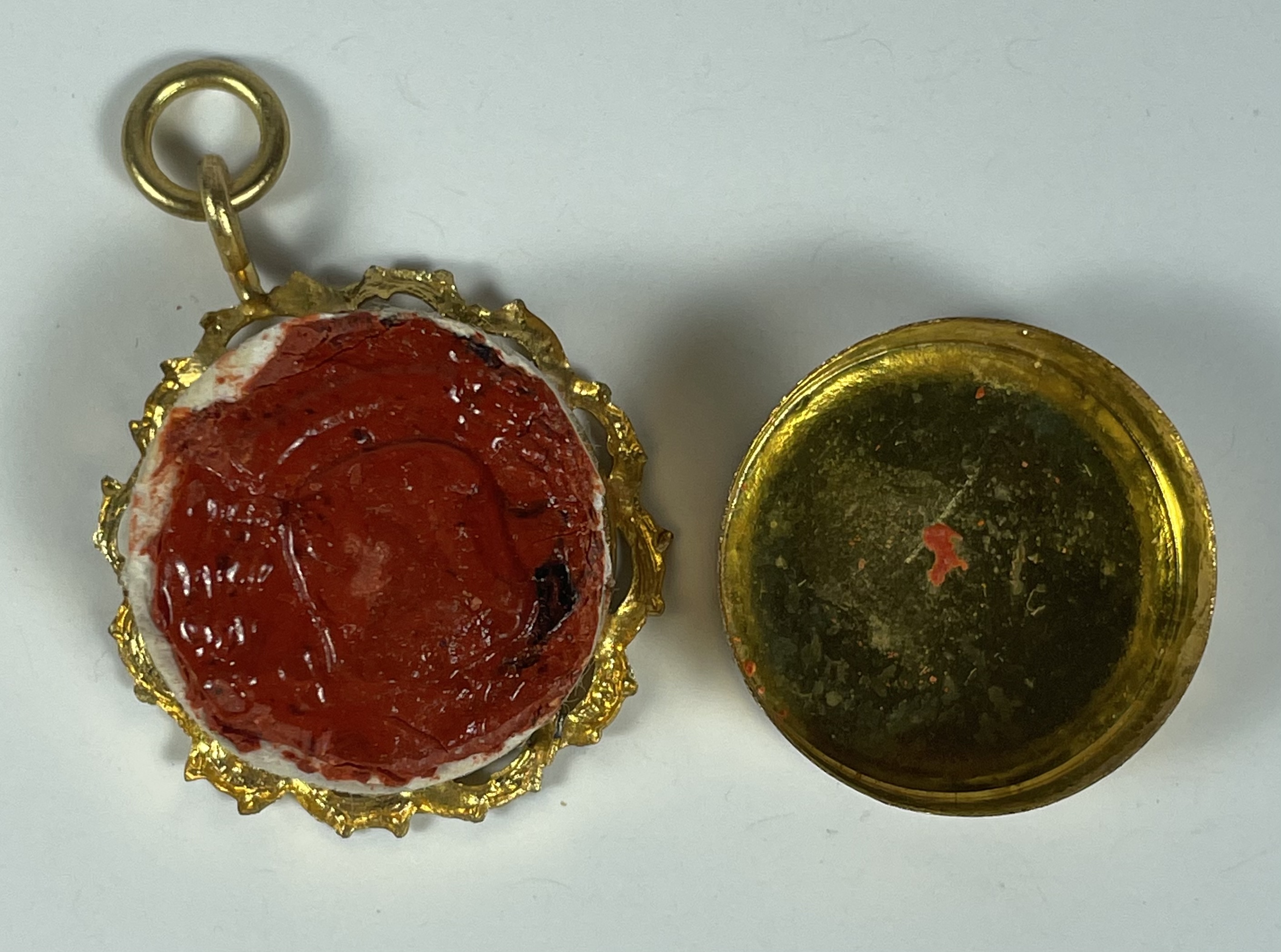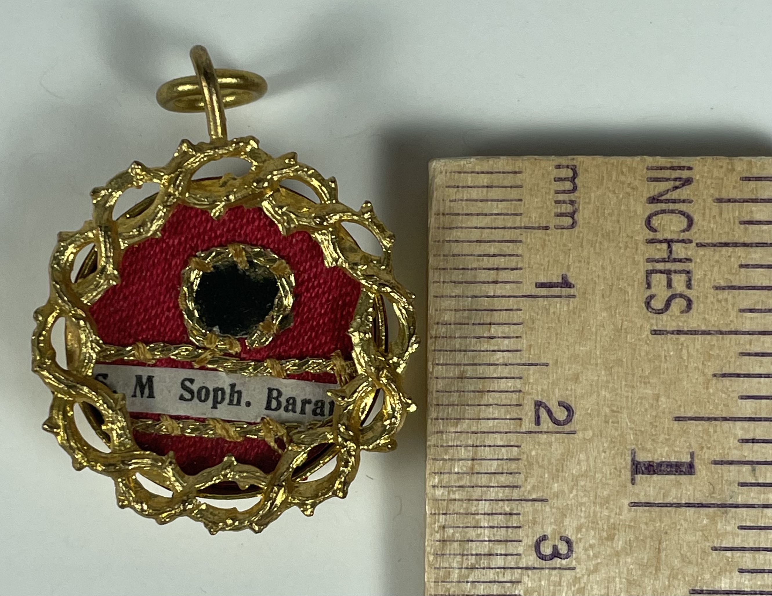 Round yellow-metal glass-fronted reliquary theca housing a second-class ex vestimentis (of the vestments) relic of the St. Madeleine Sophie Barat, R.S.C.J. The relic is affixed to a red silk ground decorated by a gilt-silver cord and identified in Latin on a typeset cedula label as S. M. Soph. Barat. (St. Madeleine Sophie Barat). On the back, under a protective cap, the theca is secured with a seal of red Spanish wax bearing an imprint of a coat of arms of the Society of the Sacred Heart. The relic is accompanied by the original matching authentics document issued and sealed in 1926 by the Postulator General of the Order and comes in the original leather-clad fitted case of issue.