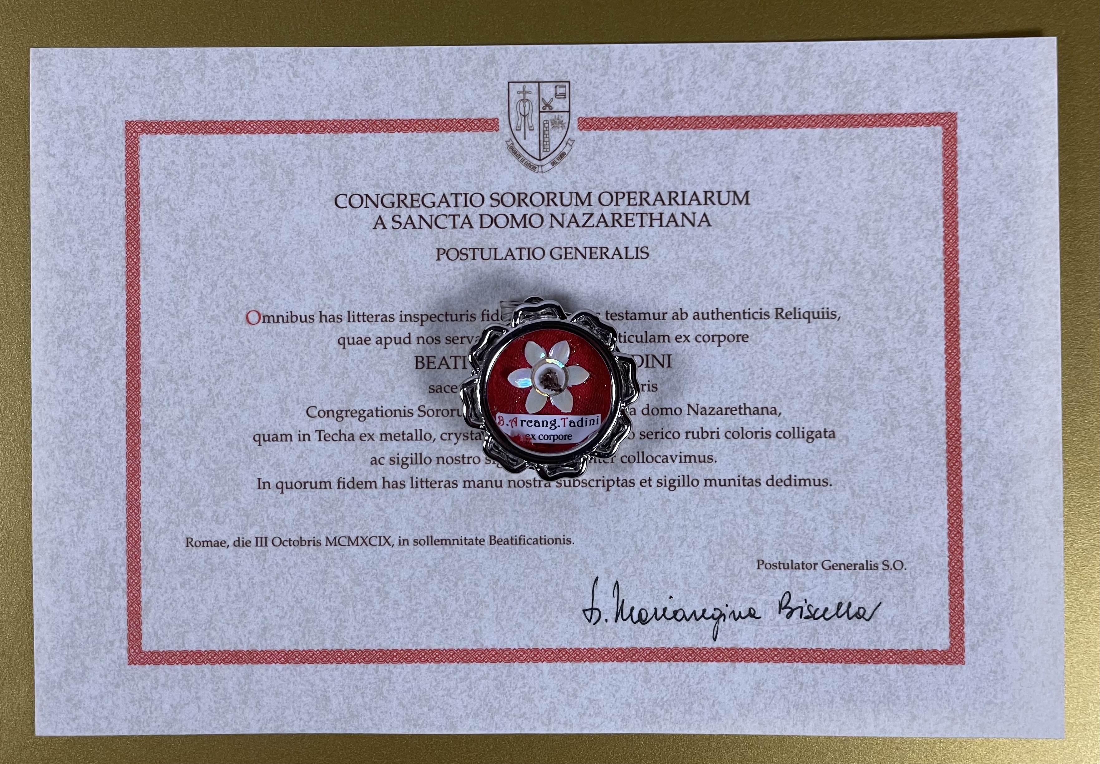 Saint Arcangelo Tadini (†1912) was an Italian Roman Catholic priest who founded the Worker Sisters of the Holy House of Nazareth, a religious congregation dedicated to the poor and ill while taking advantage of the Industrial Revolution to support women in work and education. Tadini was disabled due to a lame leg he had after suffering an accident while he studied for the priesthood. Tadini was beatified on 3 October 1999 and was canonized on 26 April 2009.