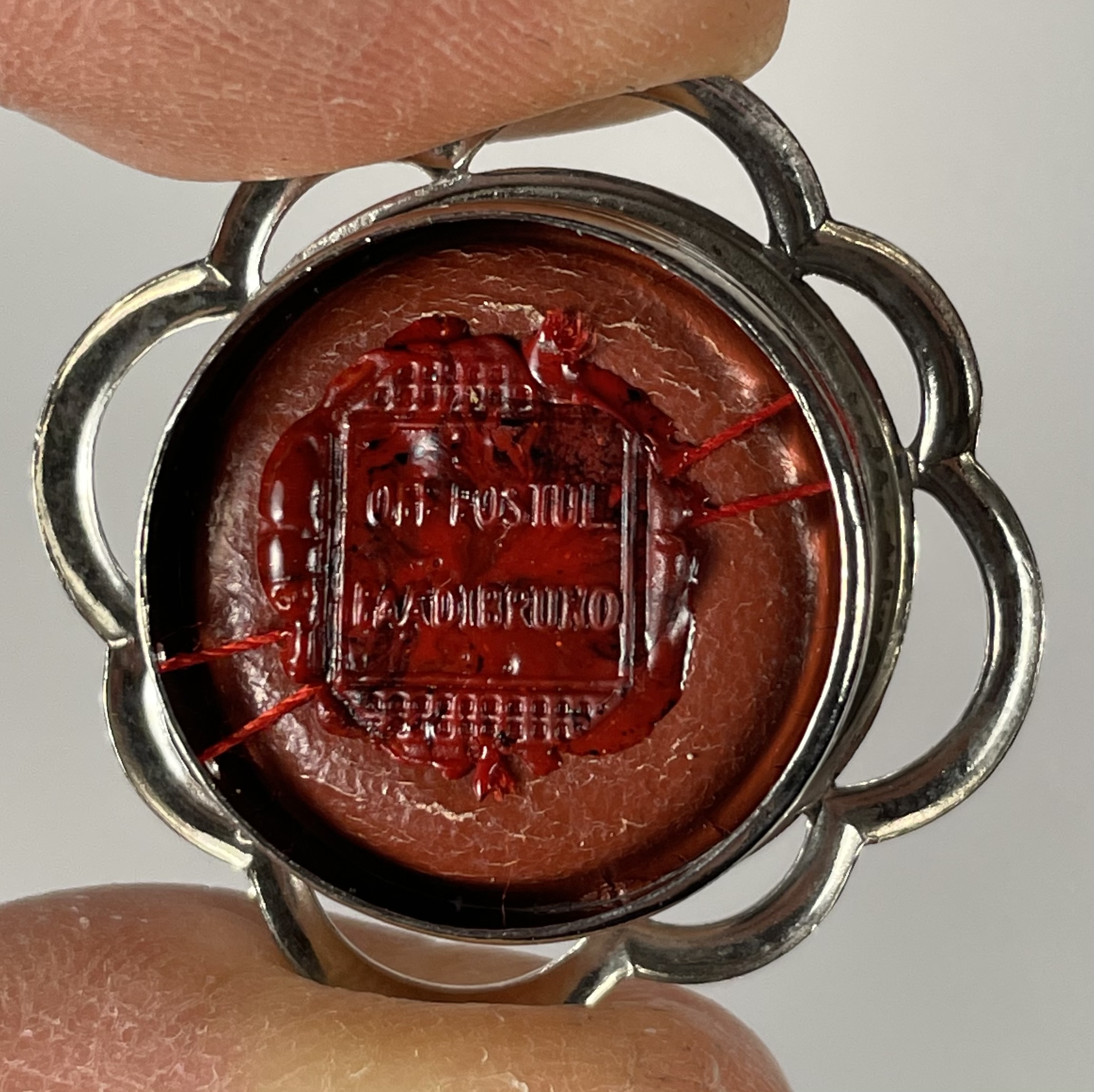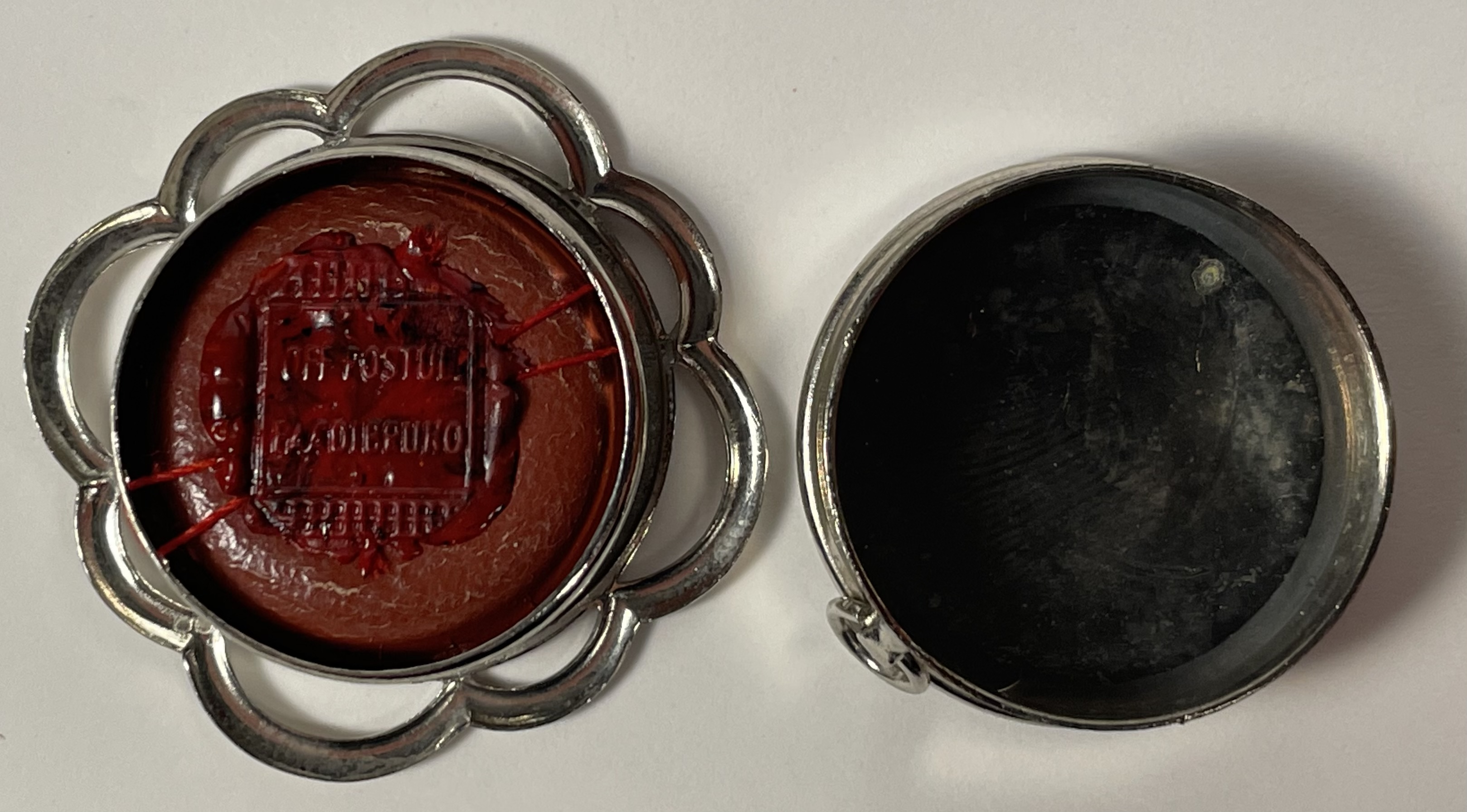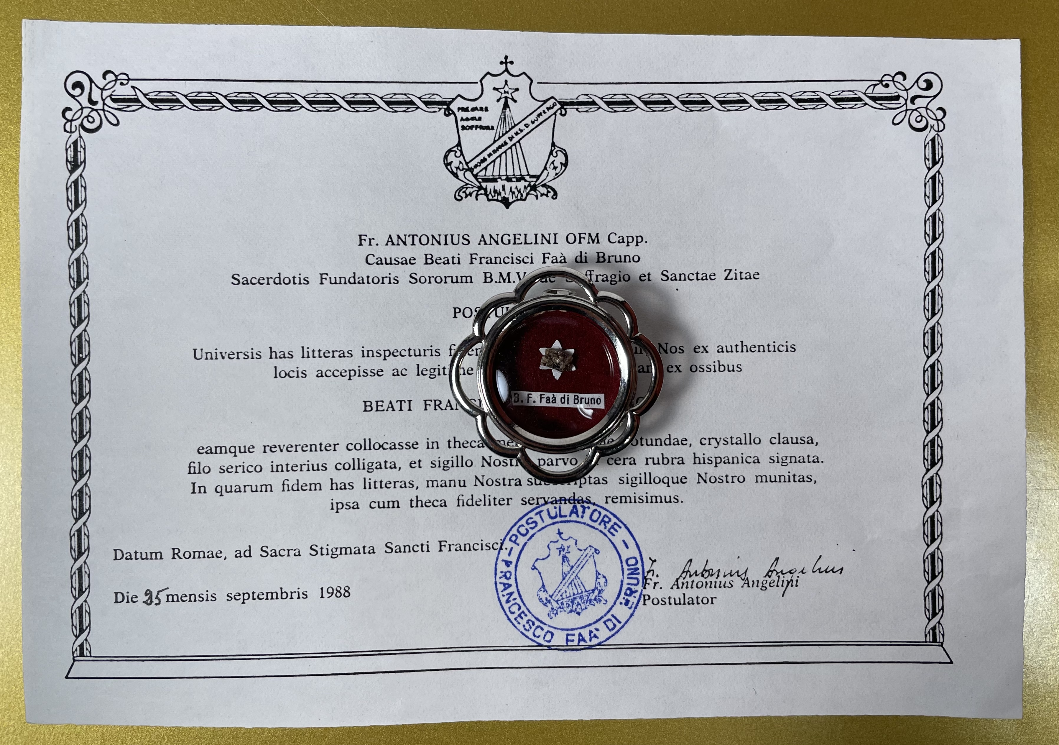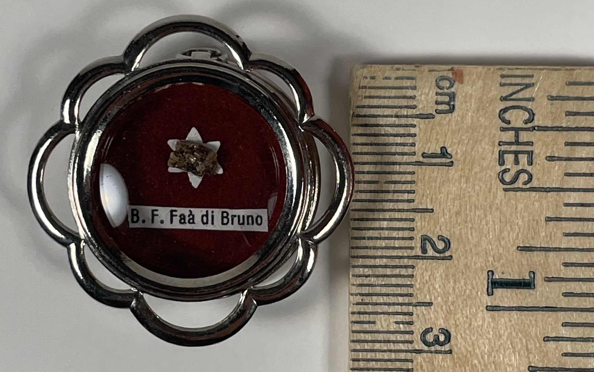 Round glass-fronted white-metal reliquary theca housing the first-class ex ossibus (of the bone) relic of the Blessed Francesco Faà di Bruno. The relic is affixed to a red silk ground and identified in Latin on a typeset cedula label as B. F. Faà di Bruno (the Blessed Fancesco Faà di Bruno). On the back, under the protective cap, the theca is secured with a seal of red Spanish wax bearing an imprint of a coat of arms of the Congregation of Marian Fathers of the Minim Sisters of St. Zita, the Order that he founded. The relic is accompanied by the original matching authentics document issued on 25 September 1988 (on the very day of his beatification) by the Postulator General of the Order.
