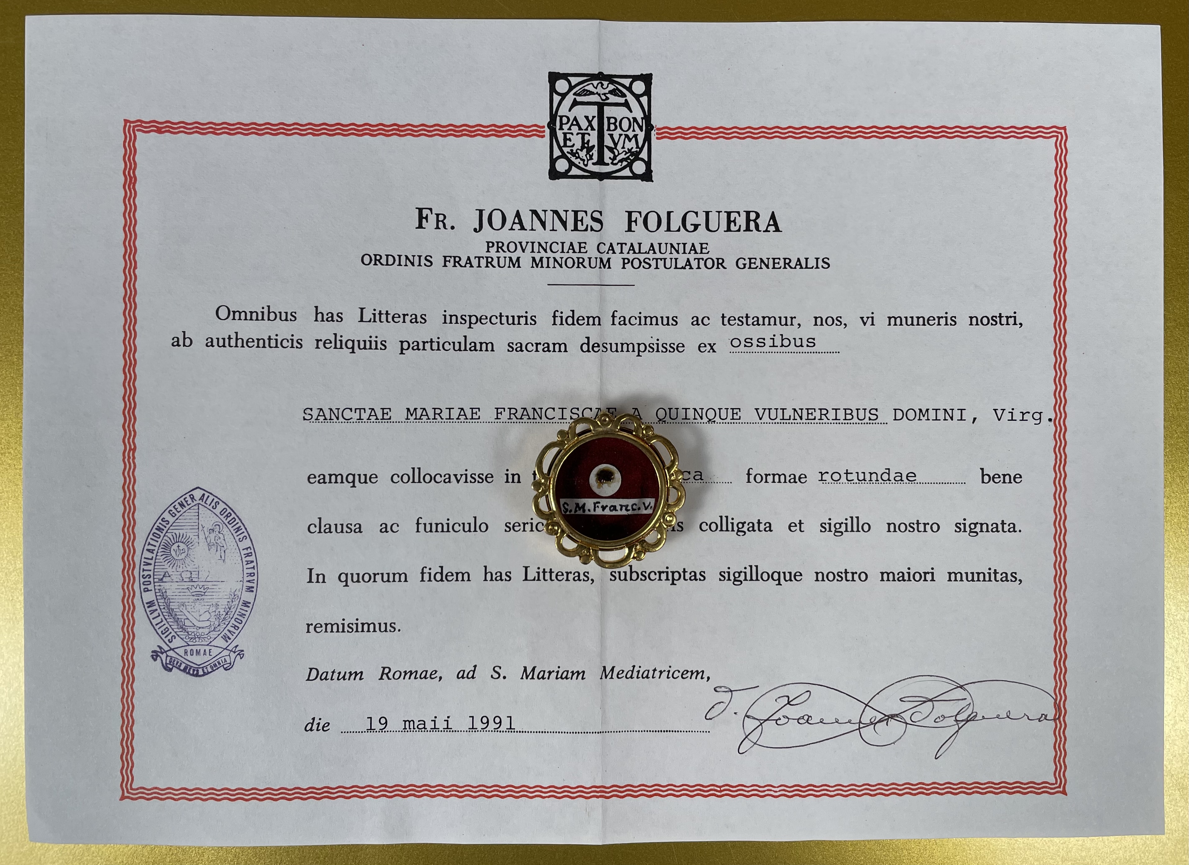 Saint Mary Frances of the Five Wounds, T.O.S.F. (Italian: Maria Francesca delle Cinque Piaghe, (†1791), was an Italian member of the Third Order of St. Francis, who is honored as a saint in the Catholic Church. She is said to have received the wounds of the stigmata and suffered patiently many physical afflictions and spiritual trials. She would wear gloves to cover the marks on her hands, while she did her work. She is also said to have had visions of Saint Raphael the Archangel, who healed her of several afflictions. She was beatified by Pope Gregory XVI in 1843 and soon canonized by Pope Pius IX in 1867. She is a holy patron of Quartieri Spagnoli of Naples (co-patron); Gallo World Family Foundation; expectant mothers; and women seeking to have children. Her feast day is celebrated on 6 October. In 2001, her remains were transferred from the Church of Santa Lucia to the house where she had spent the last half of her life. It is now the Shrine of St. Mary Frances of the Five Wounds. It is still a common practice for expectant mothers to go there to be blessed with her relic. Many votive offerings from mothers who credit her with their successful deliveries are displayed in the sanctuary.