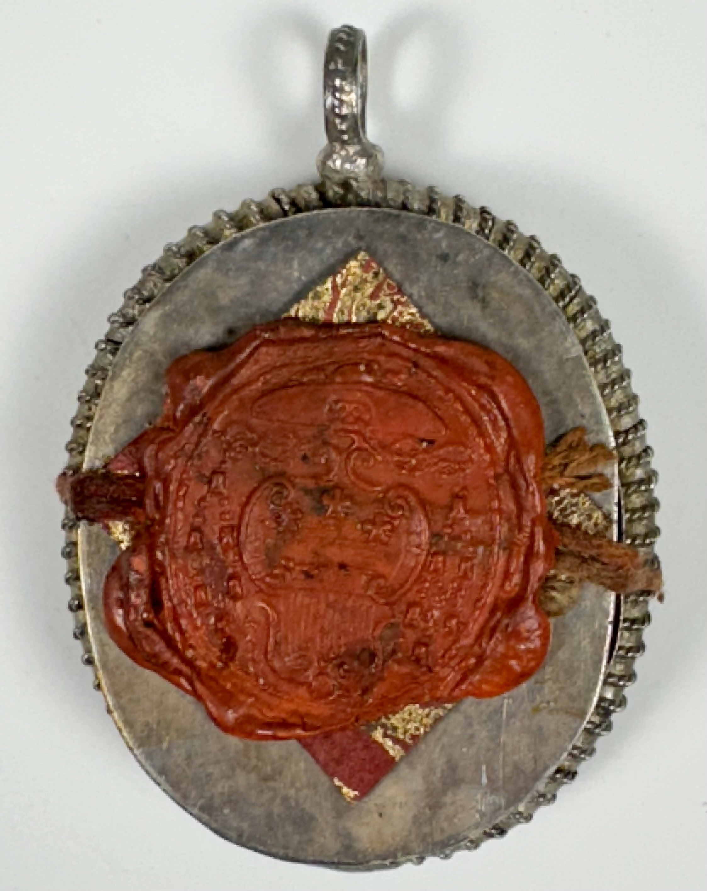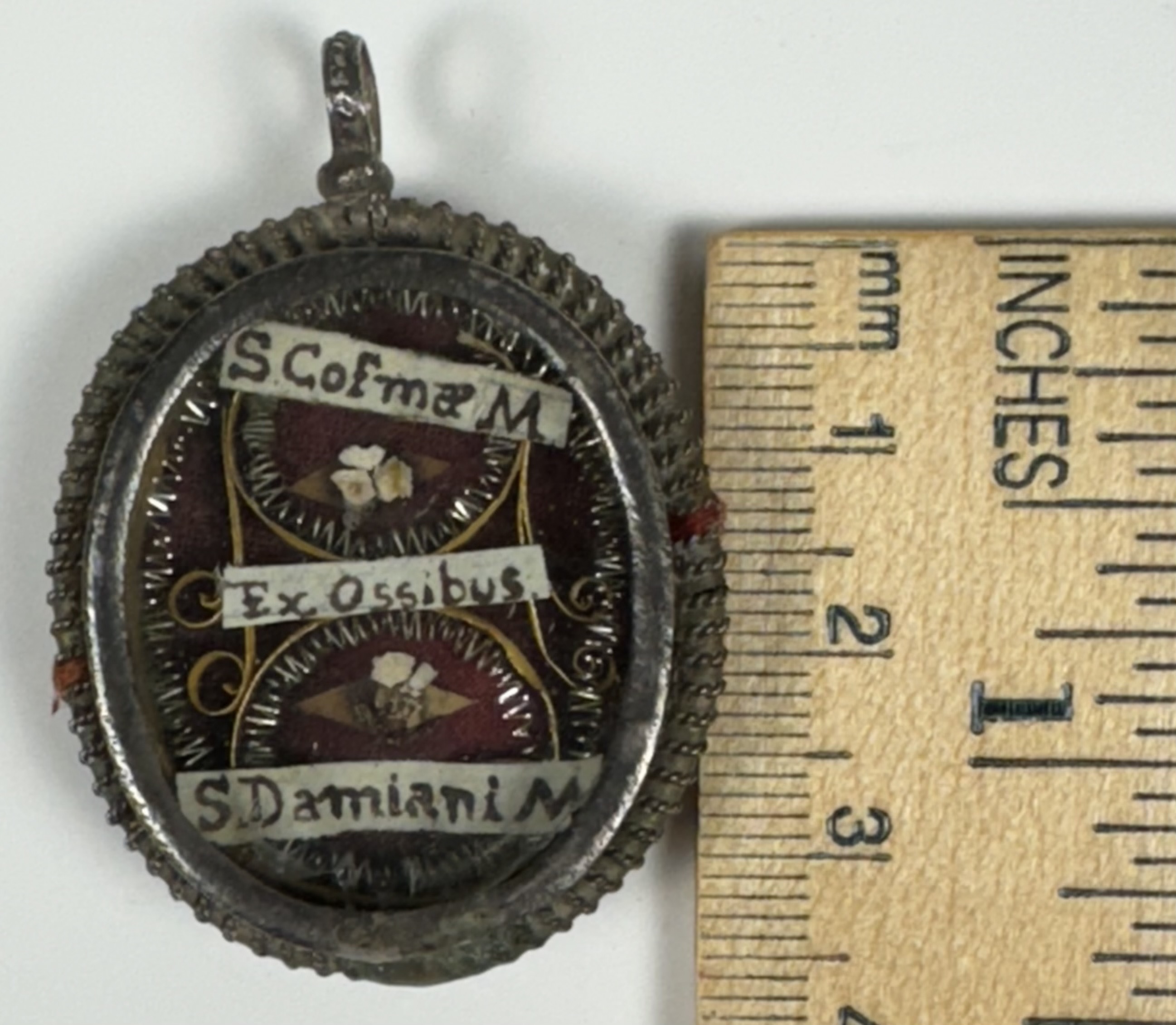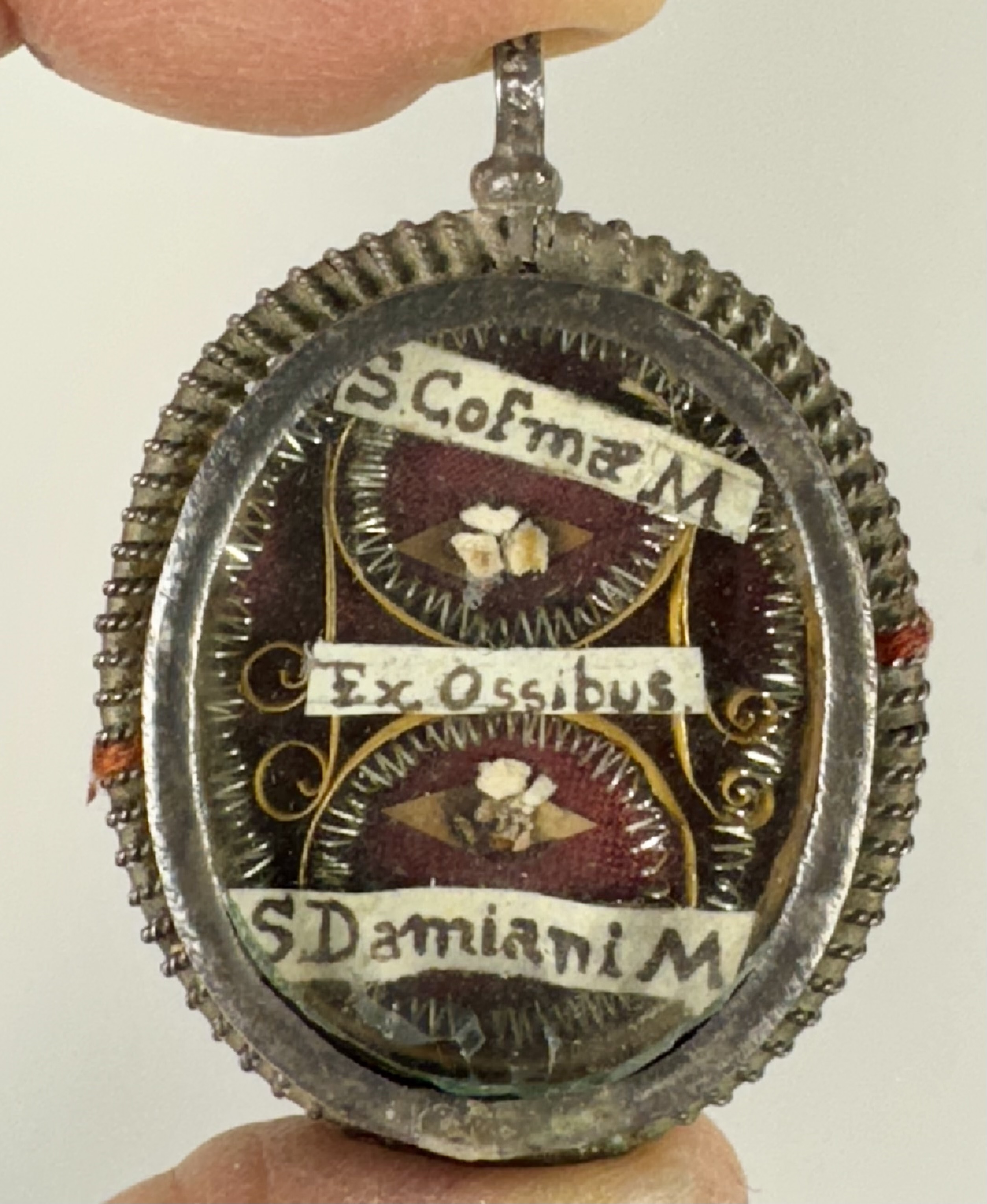 Oval glass-fronted silver reliquary theca housing the first-class ex ossibus (of the bone) relics of Saints Cosmas and Damian.  The relics are affixed to the ground of red silk, surrounded by gilt paperolle and silver wire ornamentation and identified in Latin on manuscript cedula label as Ex Ossibus S. Cosmae M. // S. Domiani M. (of the bone of St. Cosmas Martyr // St. Damian, Martyr). On the back, the theca is secured with a seal of red Spanish wax bearing an imprint of a coat of arms of Fr. Pietro Maria Vannucci (†1793), Bishop of Massa Marittima, Italy (1770-1793).