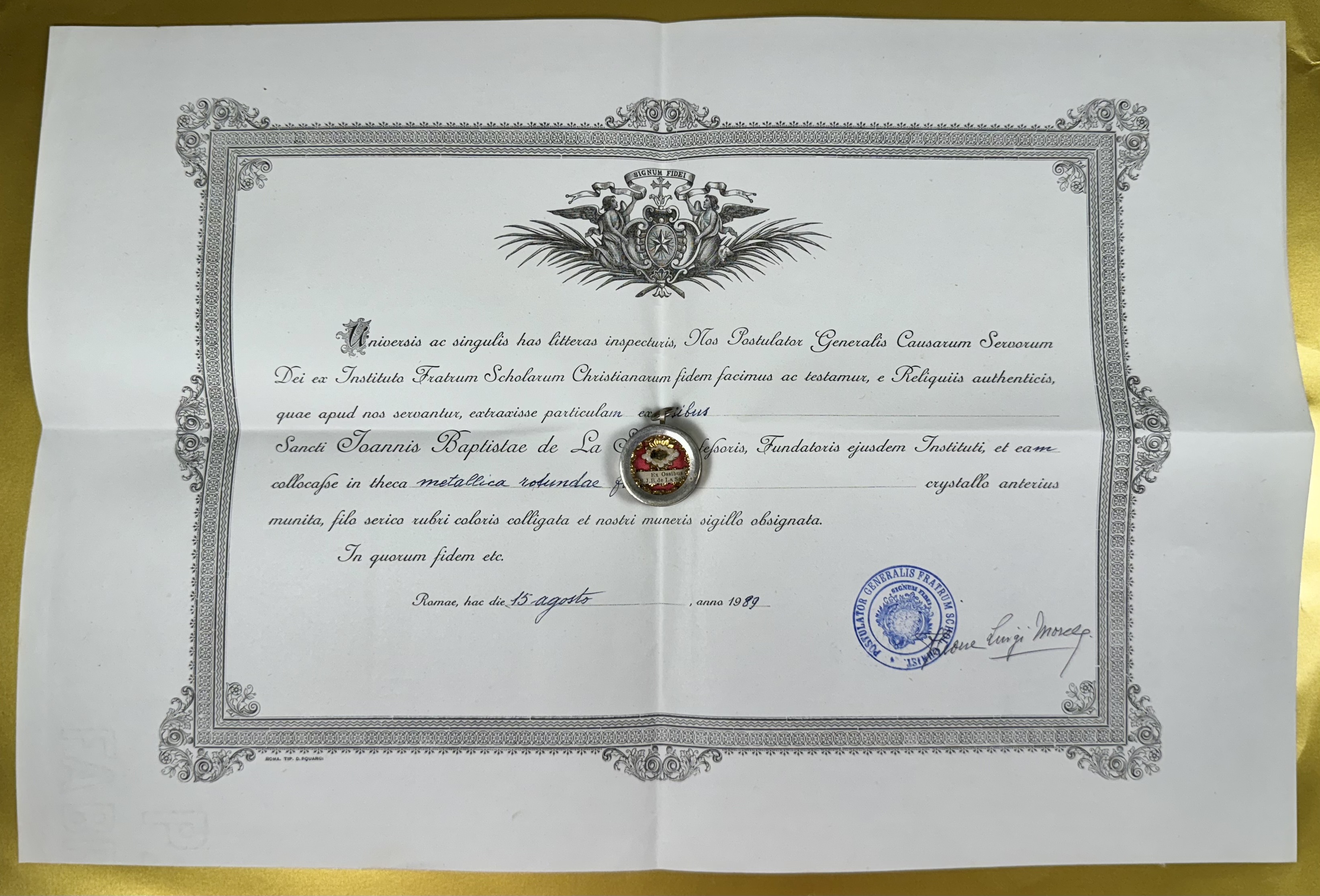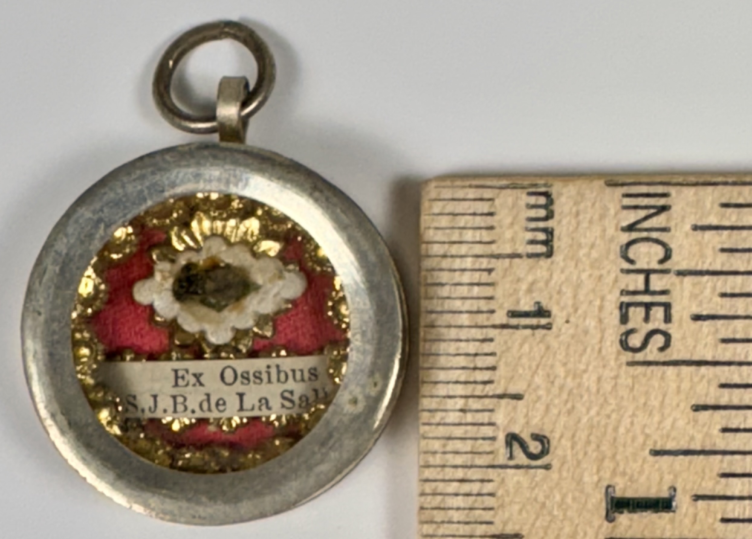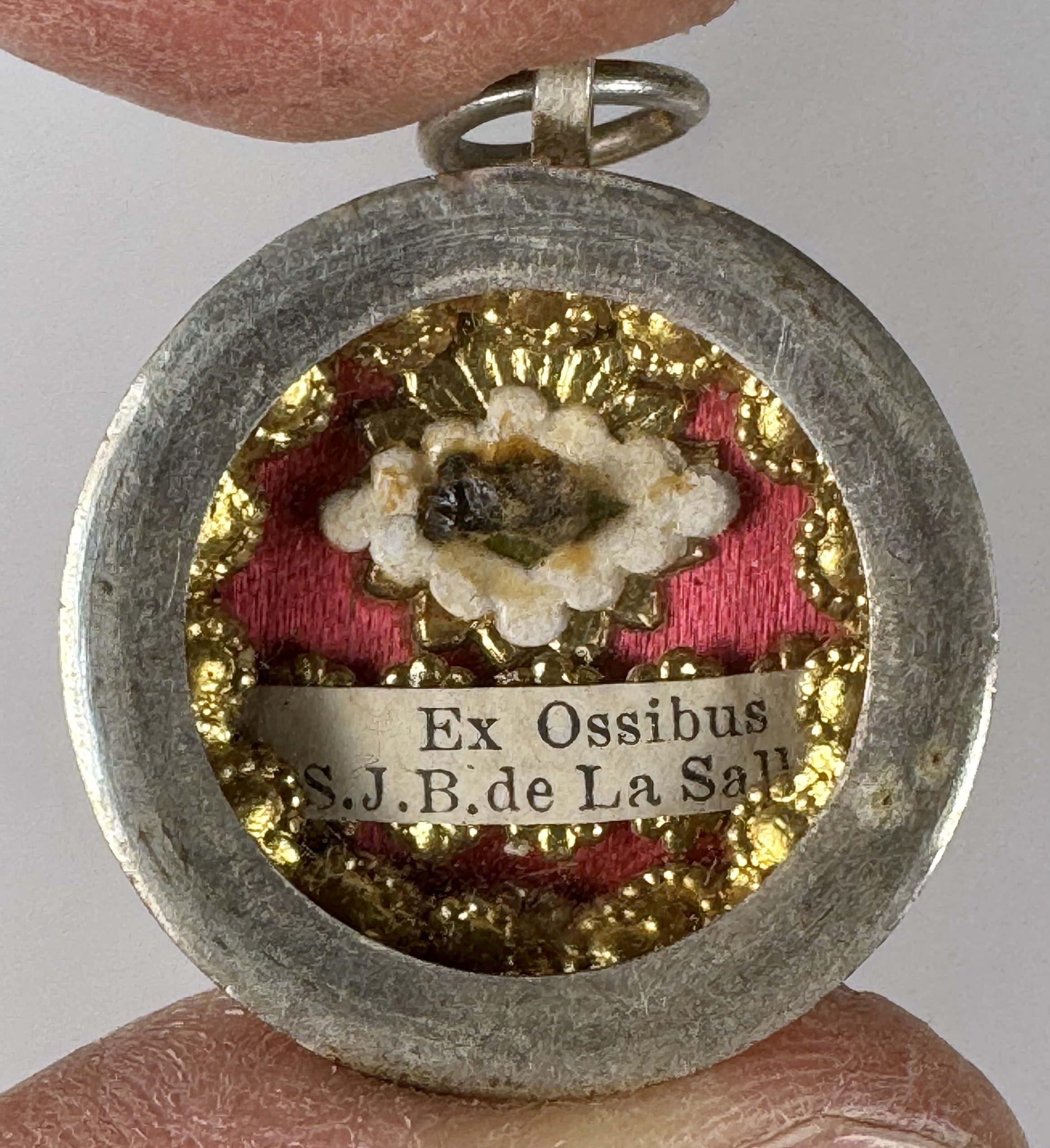 Small round white-metal glass-fronted reliquary theca housing first-class ex ossibus (of the bone) relic of Saint Jean-Baptiste de La Salle. The relic is affixed to a red silk ground and identified in Latin on a typeset cedula label as Ex Ossibus // S. J. B. de La Sall[e] (of the bone of Saint Jean-Baptiste de La Salle). On the back, under a protective cap, the theca is secured with a seal of red Spanish wax bearing an imprint of a coat of arms of the Institute of the Brothers of the Christian Schools. The reliquary is accompanied by an impressive original matching authentics document issued by the Postulator General in 1989.
