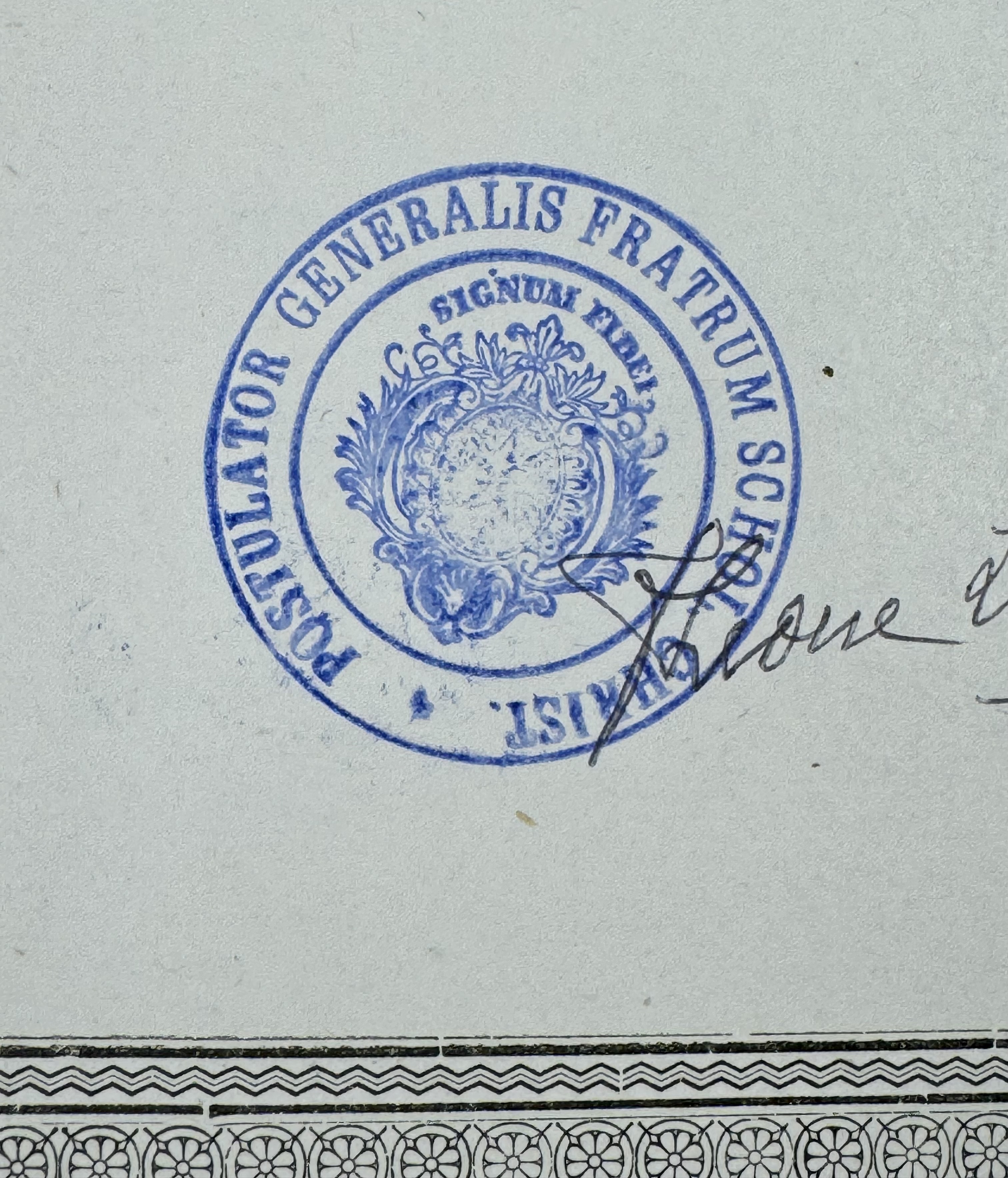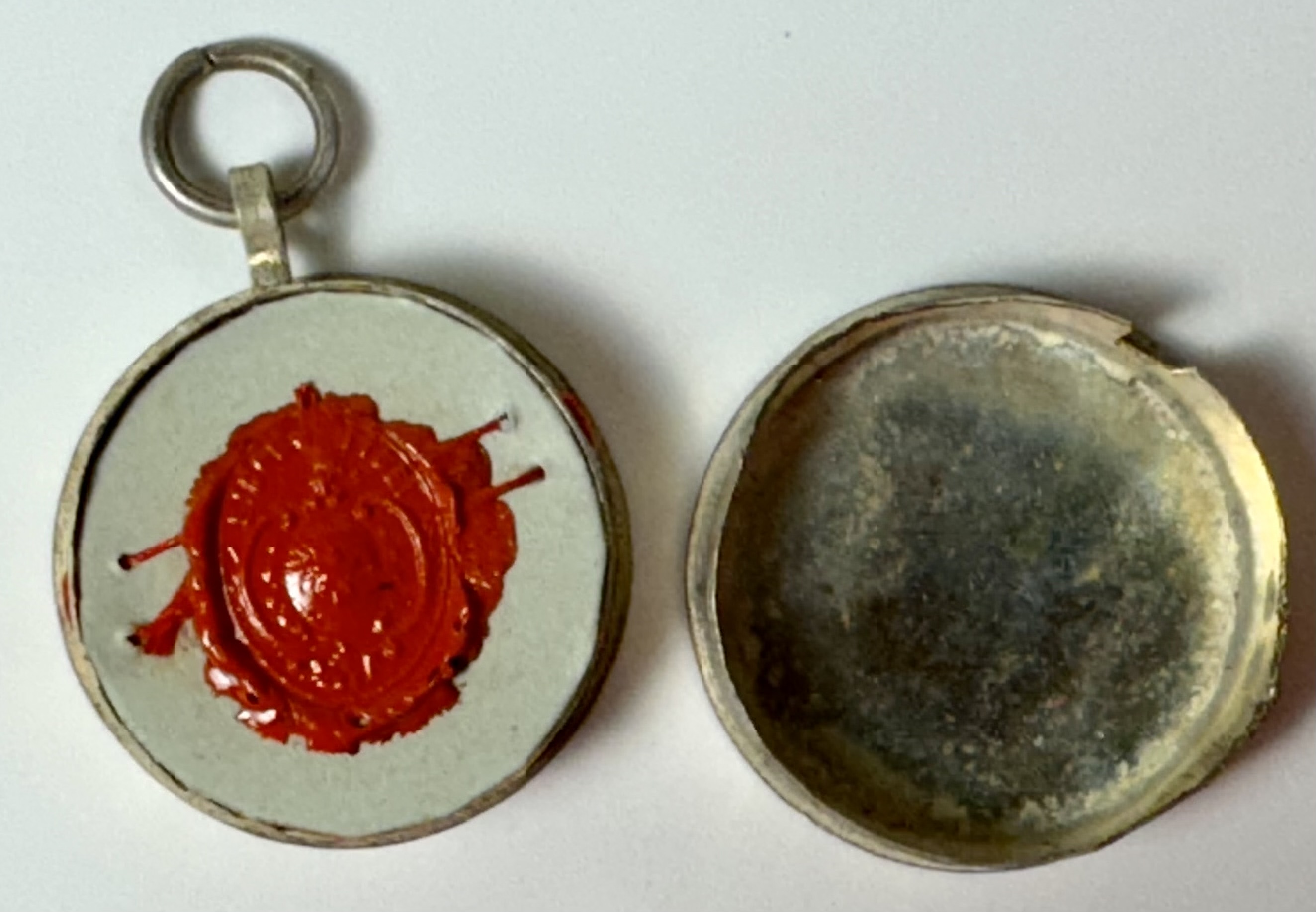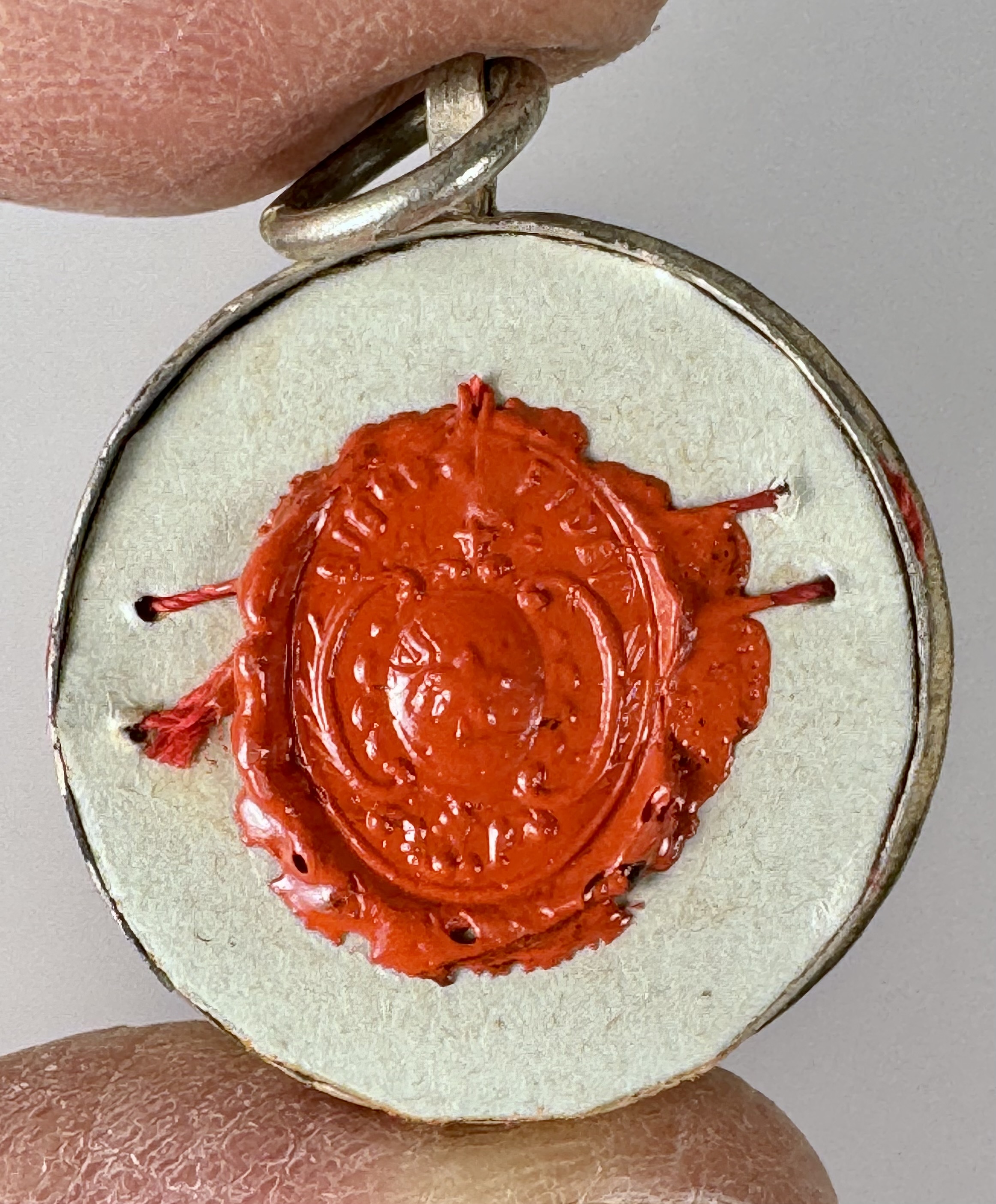 Small round white-metal glass-fronted reliquary theca housing first-class ex ossibus (of the bone) relic of Saint Jean-Baptiste de La Salle. The relic is affixed to a red silk ground and identified in Latin on a typeset cedula label as Ex Ossibus // S. J. B. de La Sall[e] (of the bone of Saint Jean-Baptiste de La Salle). On the back, under a protective cap, the theca is secured with a seal of red Spanish wax bearing an imprint of a coat of arms of the Institute of the Brothers of the Christian Schools. The reliquary is accompanied by an impressive original matching authentics document issued by the Postulator General in 1989.