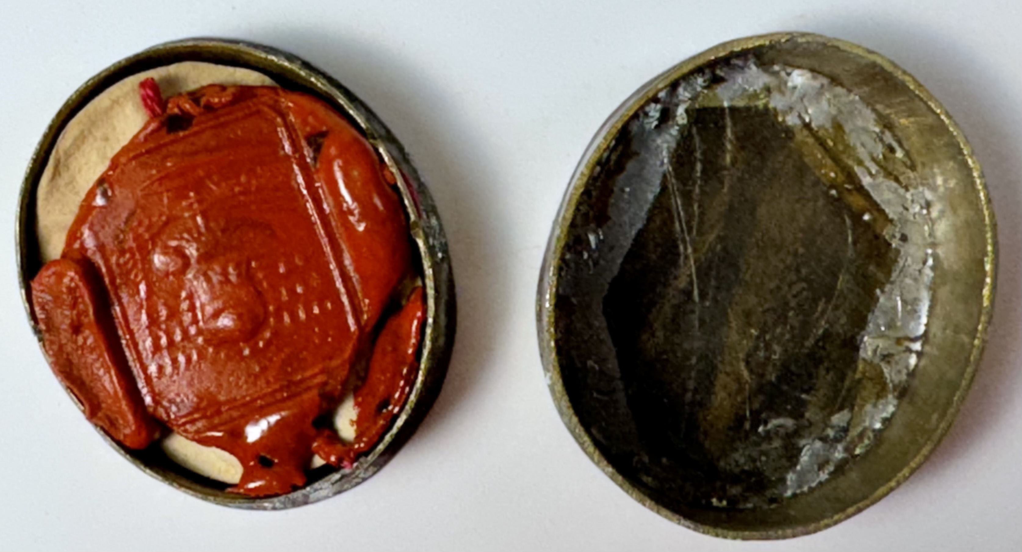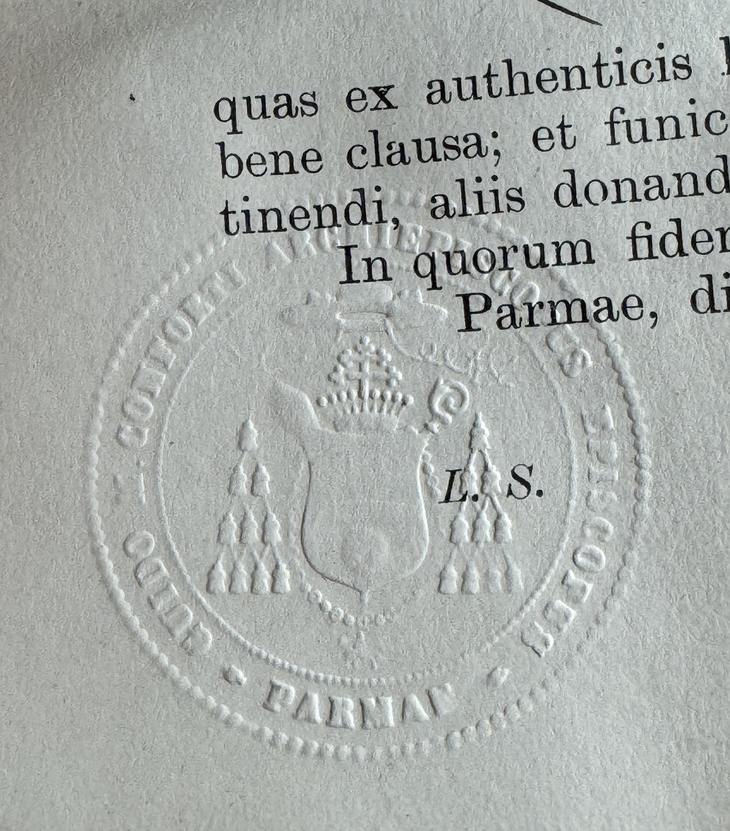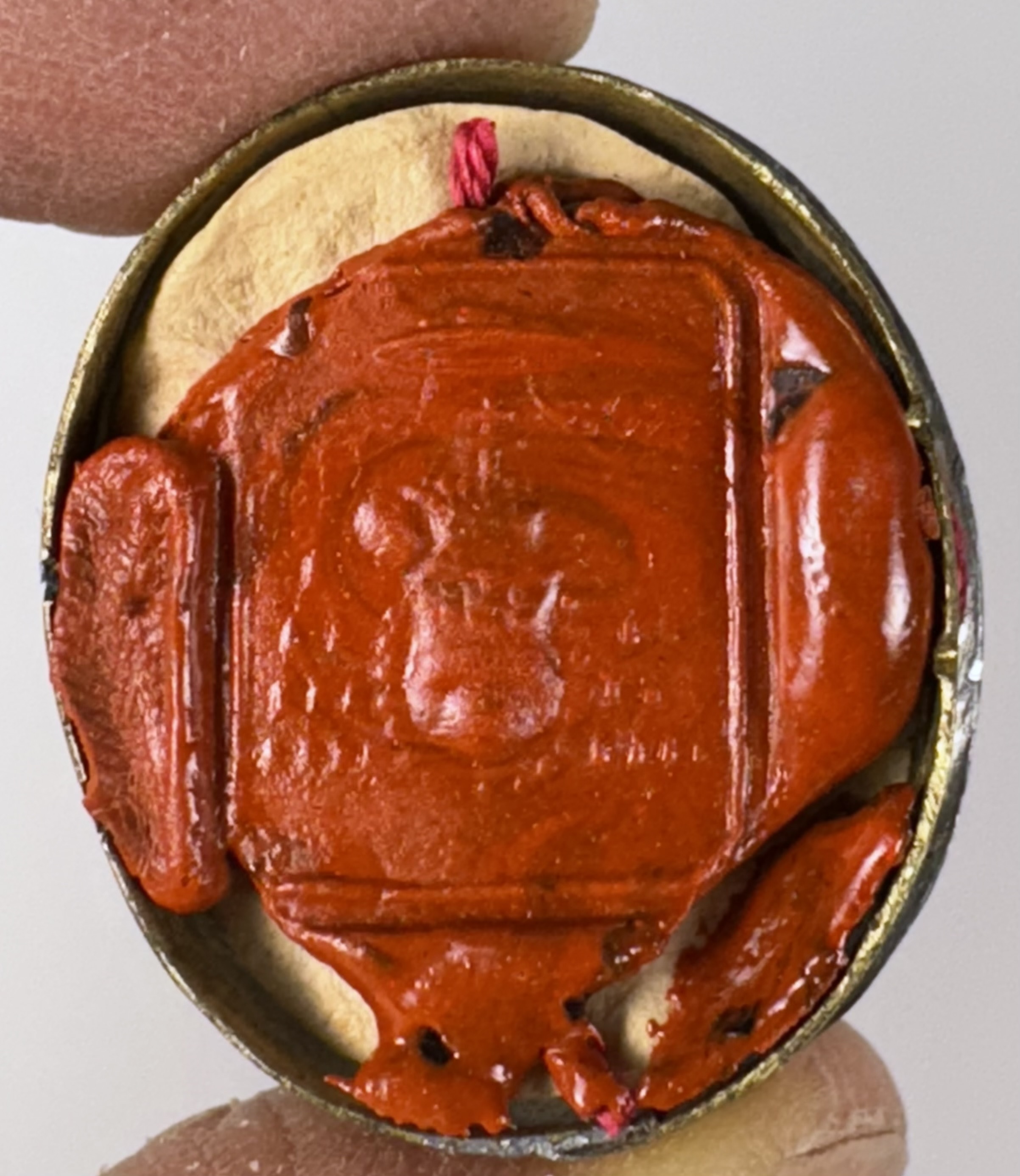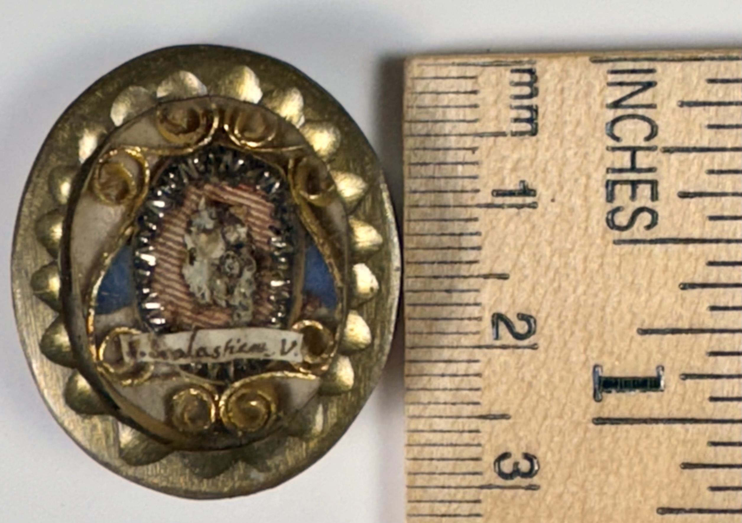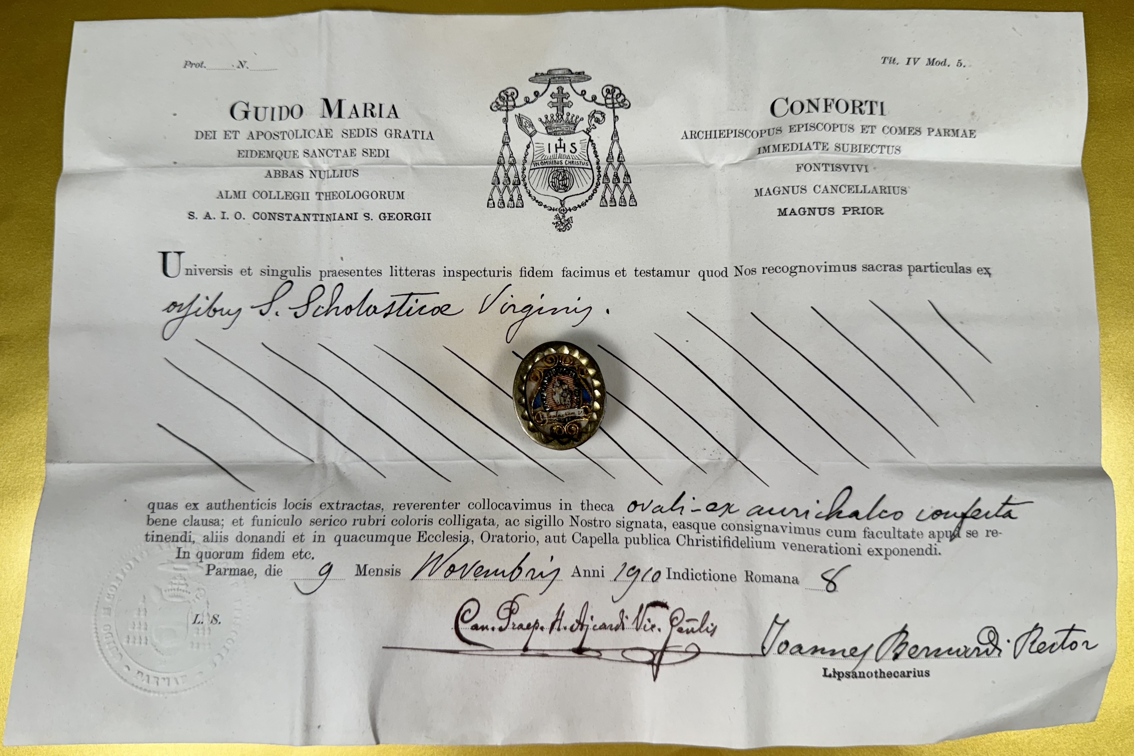 Oval glass-fronted brass pendant reliquary theca housing the first-class ex ossibus (of the bone) relic of Saint Scholastica.  The relic is affixed to a multicolor silk ground surrounded by gilt silver wire and gilt paperolle ornamentation and identified in Latin on a manuscript cedula label as S. Scholasticae V. (Saint Scholastica, Virgin).  On the back, under a protective cap, the theca is secured with a seal of red Spanish wax bearing an imprint of a coat of arms of Archbishop St. Guido Maria Conforti (†1931), Bishop of Parma, Italy (1907-1931), who himself was canonized as a Saint in 2011 by Pope John Paul II on account of his life of heroic virtue. The relic is accompanied by the original matching authentics document issued and sealed by the order of Monsignor Conforti in 1910.