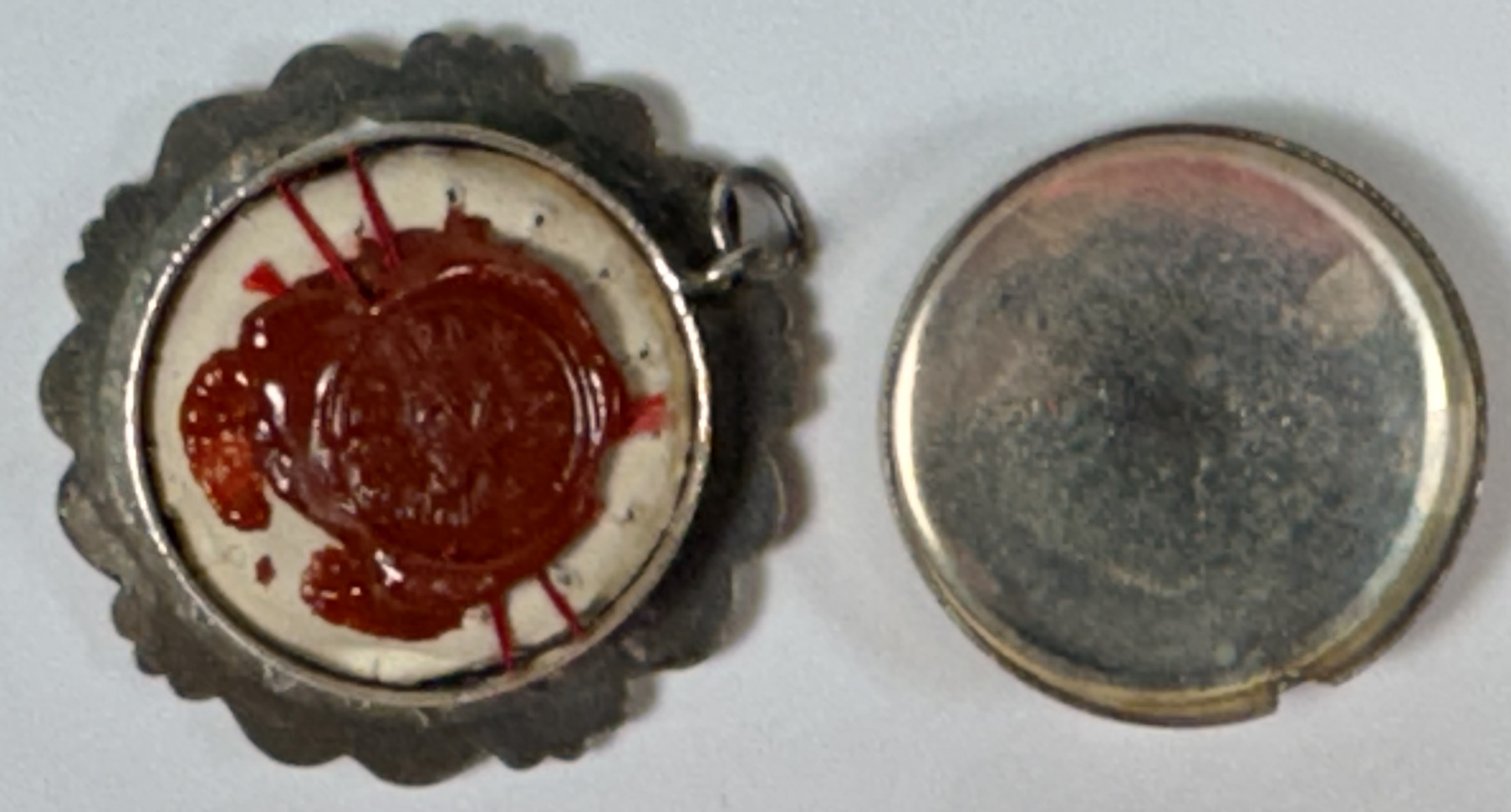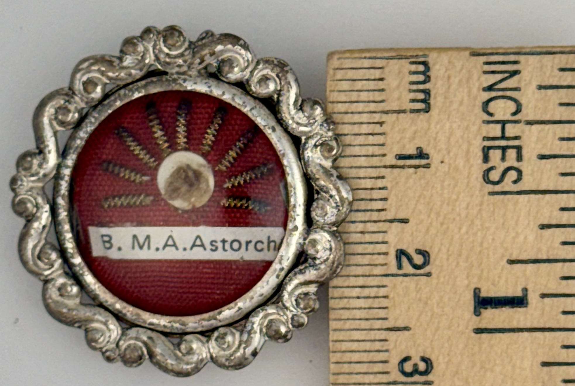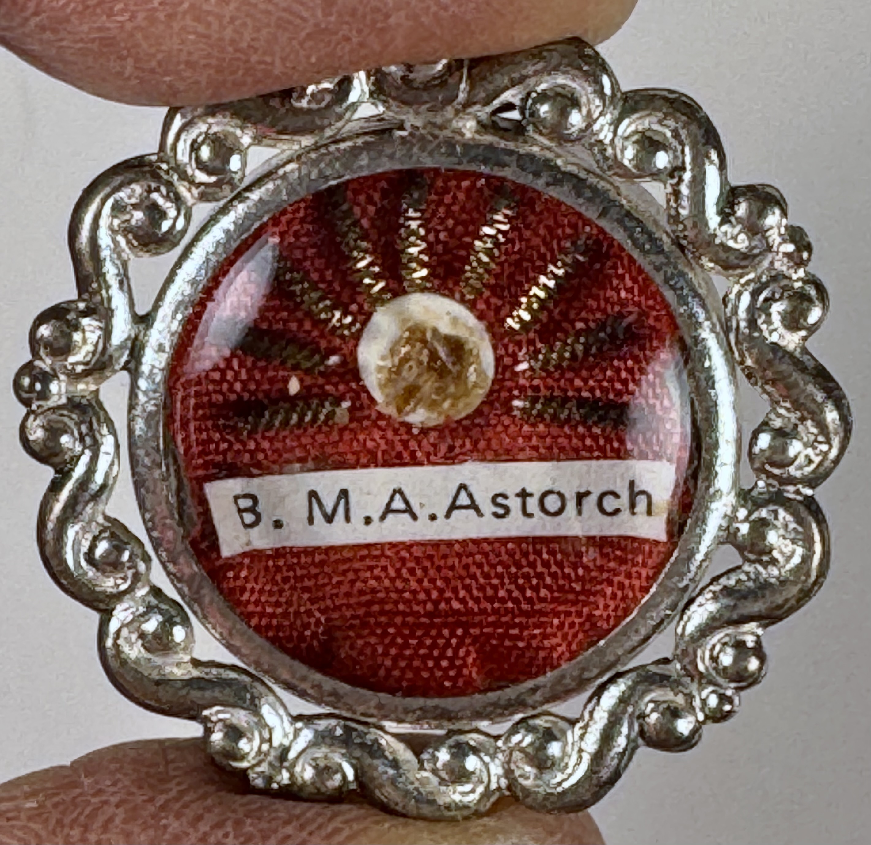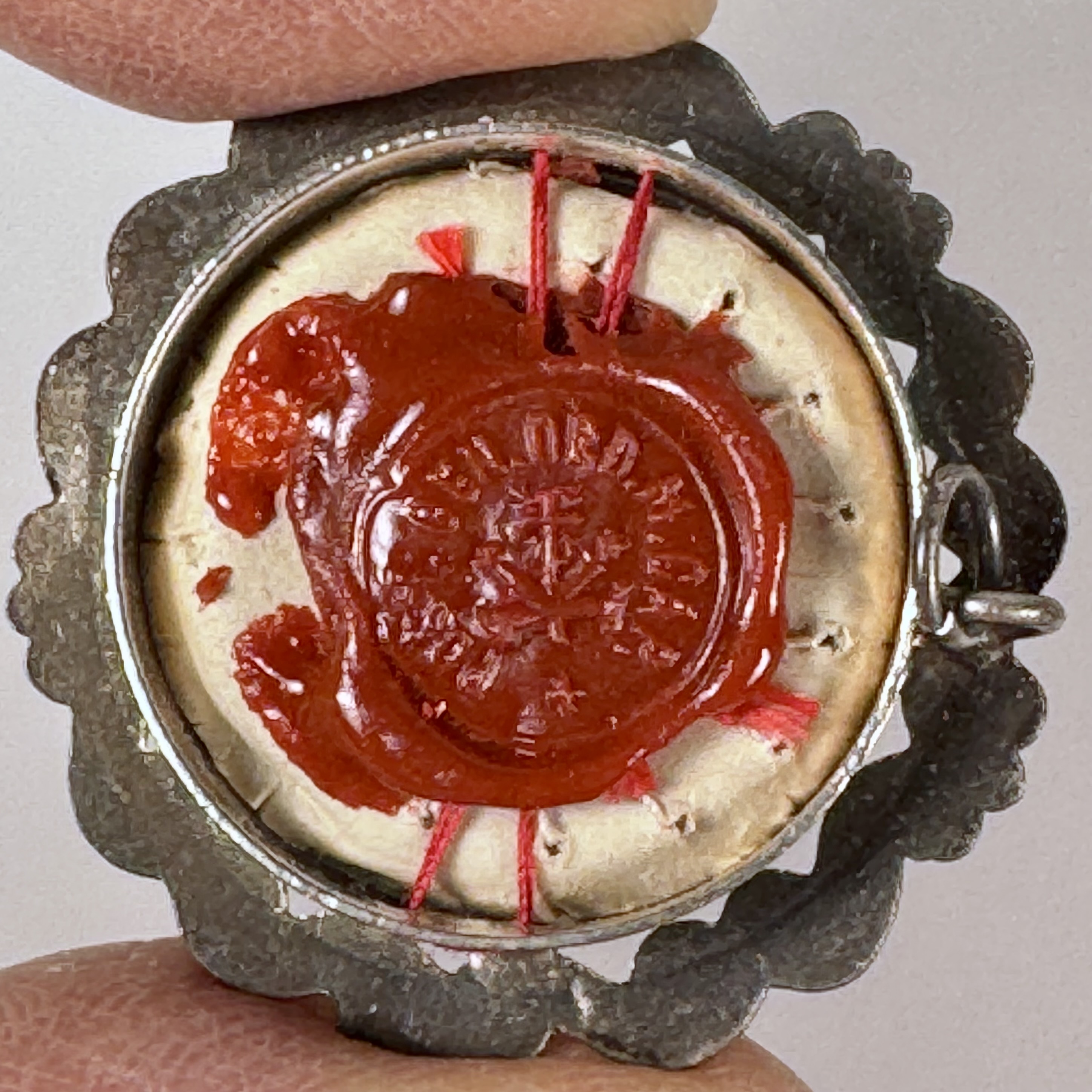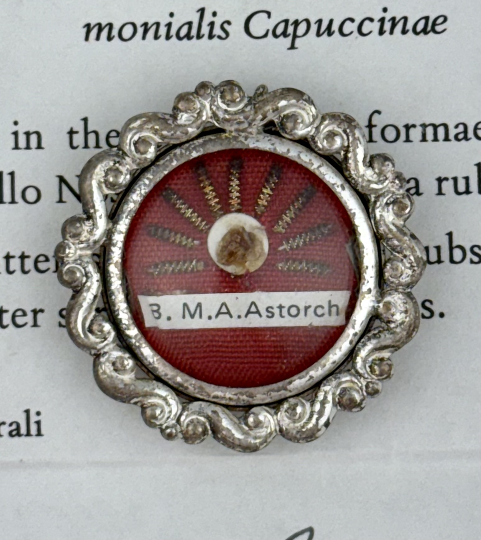 Round white-metal glass-fronted reliquary theca housing first-class ex ossibus (of the bone) relic of Blessed Maria Angela Astorch. The relic is affixed to a red silk ground adored by silver wire ornamentation and identified in Latin on a typeset cedula label as B. M.A. Astorch (Blessed Maria Angela Astorch). On the back, under a protective cap, the theca is secured with a seal of red Spanish wax bearing an imprint of a coat of arms of Order of Friars Minor Capuchin. The reliquary is accompanied by the original matching authentics document issued by the Postulator General of the Order on May 20, 1982, at the time of her beatification.