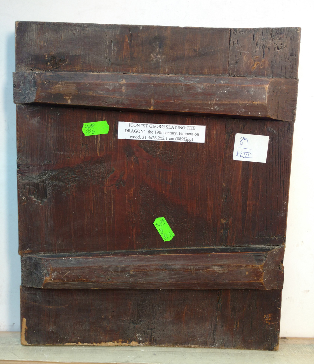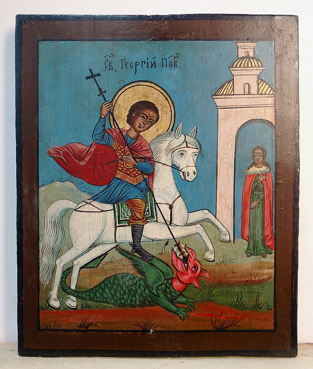 The Great Martyr Saint George is depicted as a mounted soldier striking with a lance a dragon beneath his horse. On the right is the town of Silene with a princess Elisaba, whose fate is in George’s hands, standing at the gate. The scene is titled in Old Slavonic as "Saint George the Victorybearer." The oldest icons depicting Saint George as a horseman killing the dragon date to the 12th century. The motif becomes popular especially in Georgian and Russian tradition, but it is also found in Greek icons.