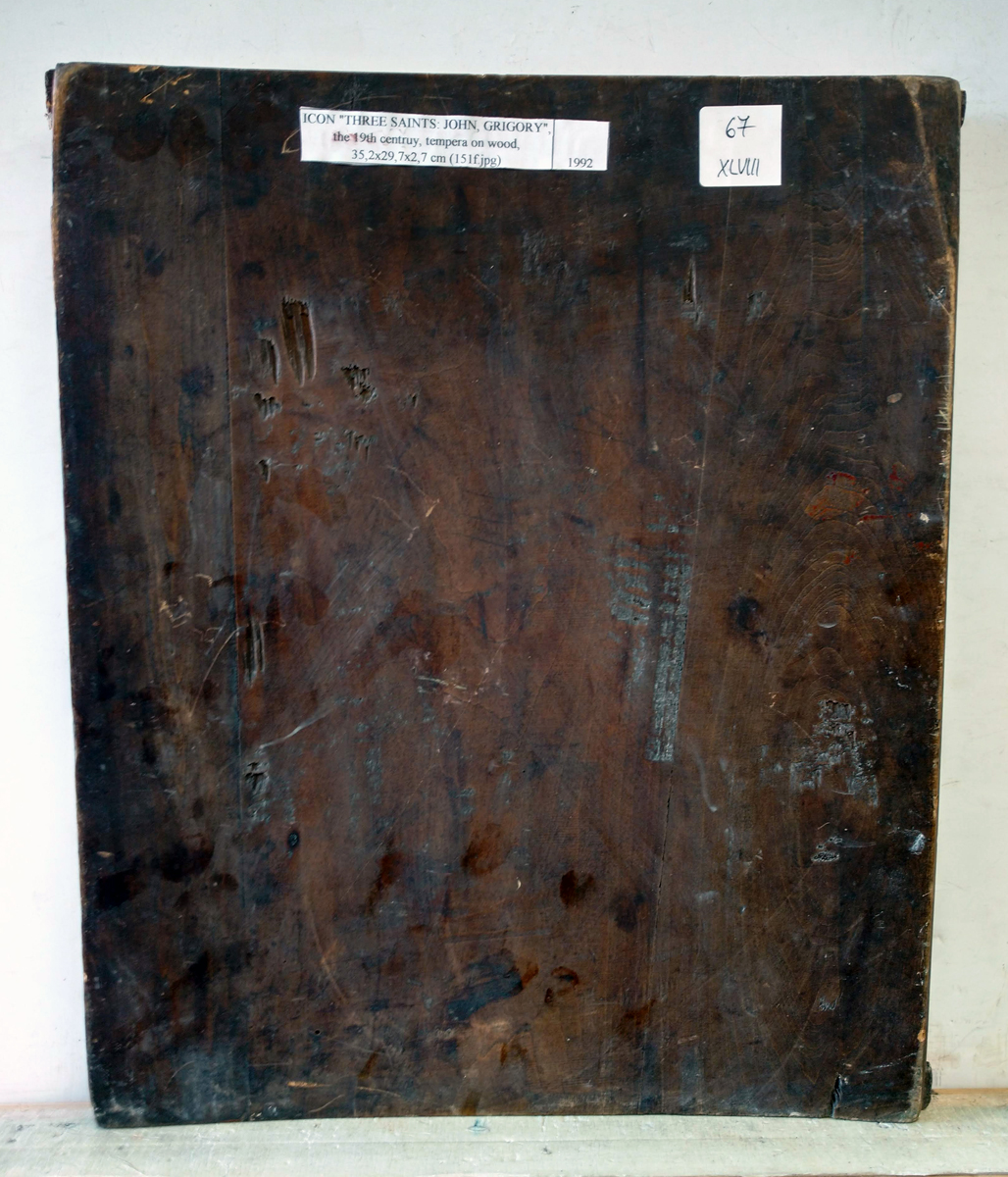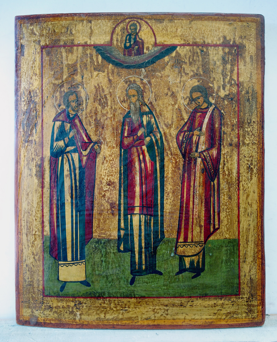 The icon depicts the Three Holy Fathers of Orthodox Christianity - St. Gregory the Theologian (known as Gregory of Nazianzus), St. Basil the Great (known as Basil of Caesarea), and St. John Chrysostom, painted full-figured surmounted by the Christ blessing from Heavens.