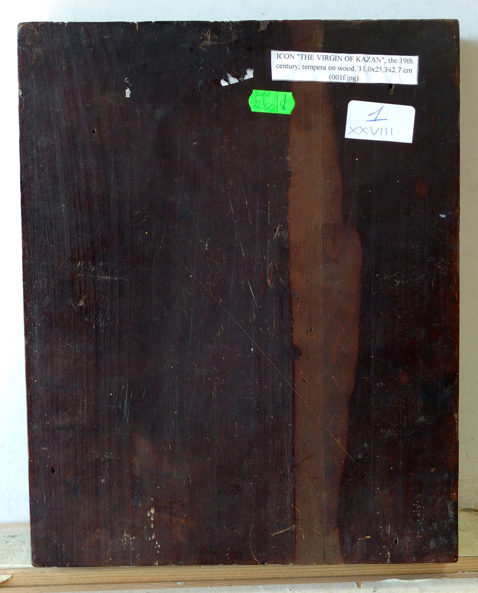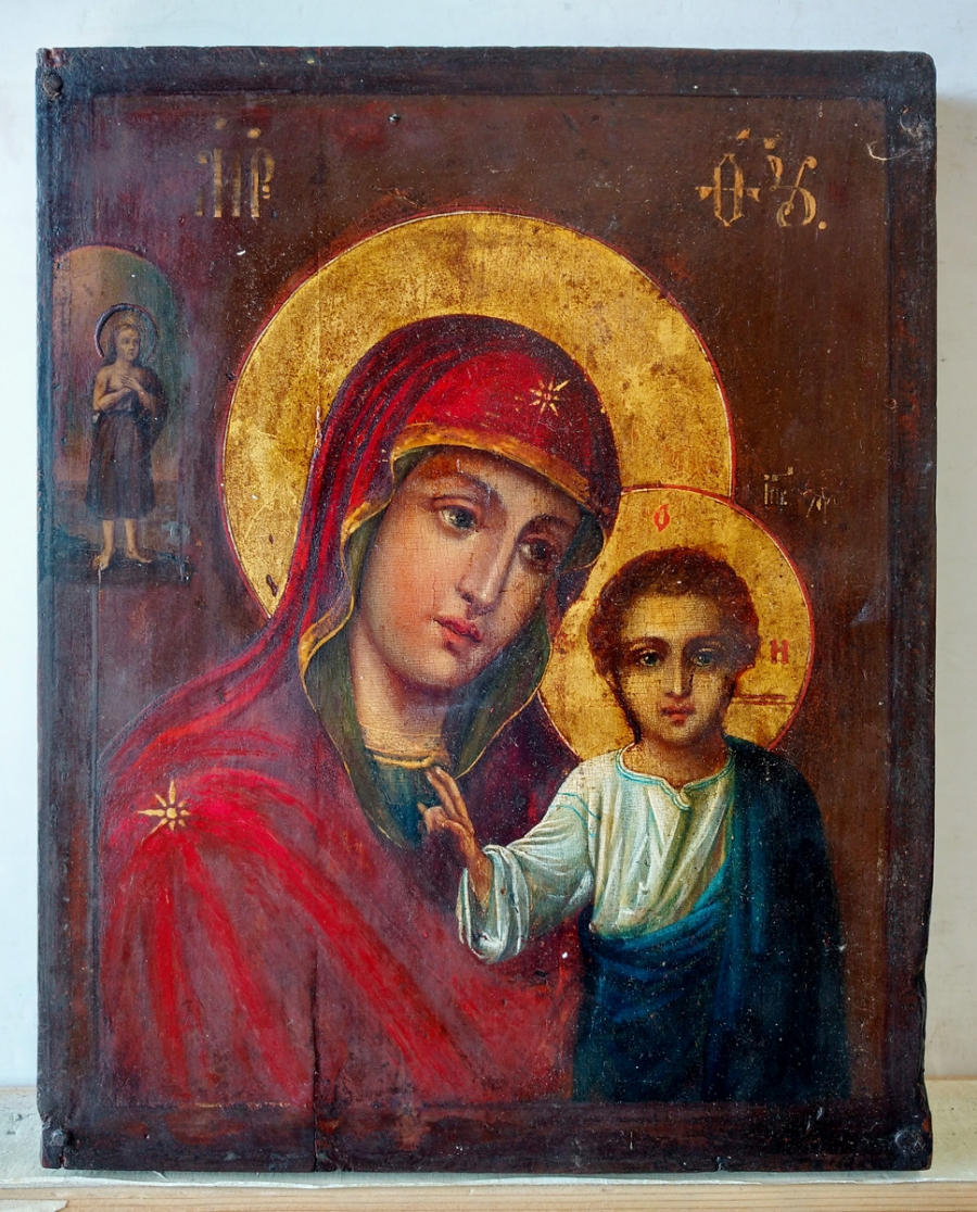 Our Lady of Kazan, is a holy icon of the highest stature within the Russian Orthodox Church and considered a palladium of Russia for centuries, until its theft and likely destruction in 1904. The icon represents the Virgin Mary as the protector and patroness of the city of Kazan. It is a close-up variant of the Hodegetria (Directress) style, it is noted mainly for the Child standing, with the Virgin chest-length. The Kazan icons are traditionally small, following the original. The Kazan icon was very popular in Russia, especially as a wedding gift, and many copies were made in the design of the original. Two major Kazan Cathedrals, in Moscow and St. Petersburg, are consecrated to Our Lady of Kazan, as are numerous churches throughout the land. Her feast days are July 21 and November 4.