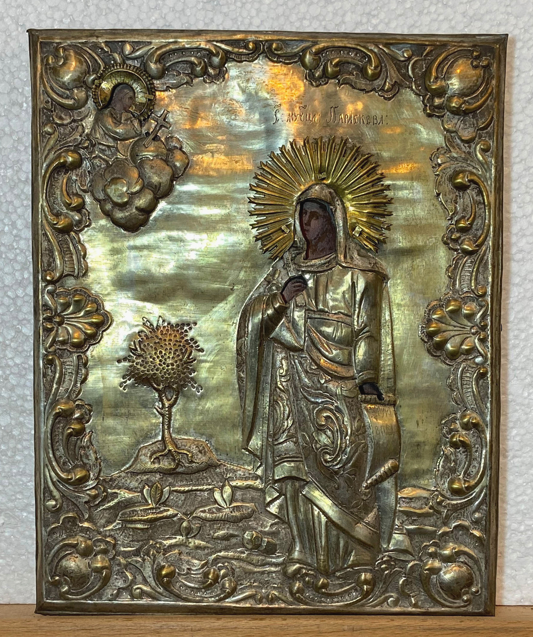 Saint Paraskevi of Iconium (also known as Paraskeva Pyatnitsa) is venerated as a Christian virgin martyr. Her parents were Christian, and Paraskevi was named as such (the name means “Friday” in Greek) because she was baptized on a Friday and because Friday was the day of Christ's Passion. She became a preacher, and according to tradition, converted Emperor Antoninus Pius to Christianity, but, subsequently martyred at Iconium during the persecutions of Diocletian. Saint Paraskevi-Pyatnitsa developed a personality and functions of her own on Russian soil. She is traditionally depicted as an ascetic figure wearing the red of martyrdom. She holds an Eastern cross in one hand and a scroll professing her faith in another. In Russia, Paraskeva-Pyatnitsa is the patroness of traders and fairs, and of the Holy Matrimony.