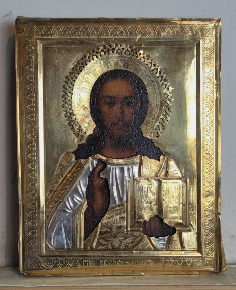 Christ Pantocrator refers to a specific depiction of Christ. The most common translation of Pantocrator is "Almighty" or "All-powerful". In this understanding, Pantocrator is a compound word formed from the Greek words for "all" and the noun "strength" (κρατος). This is often understood in terms of potential power, i.e., the ability to do anything, omnipotence. The iconic image of Christ Pantocrator was one of the first images of Christ developed in the Early Christian Church and remains a central icon of the Eastern Orthodox Church. In the half-length image, Christ holds the Gospels in his left hand and makes the blessing gesture with his right. The Gospels are opened on Matthew 11:28 “Come unto me, all ye that labor and are heavy laden, and I will give you rest.”