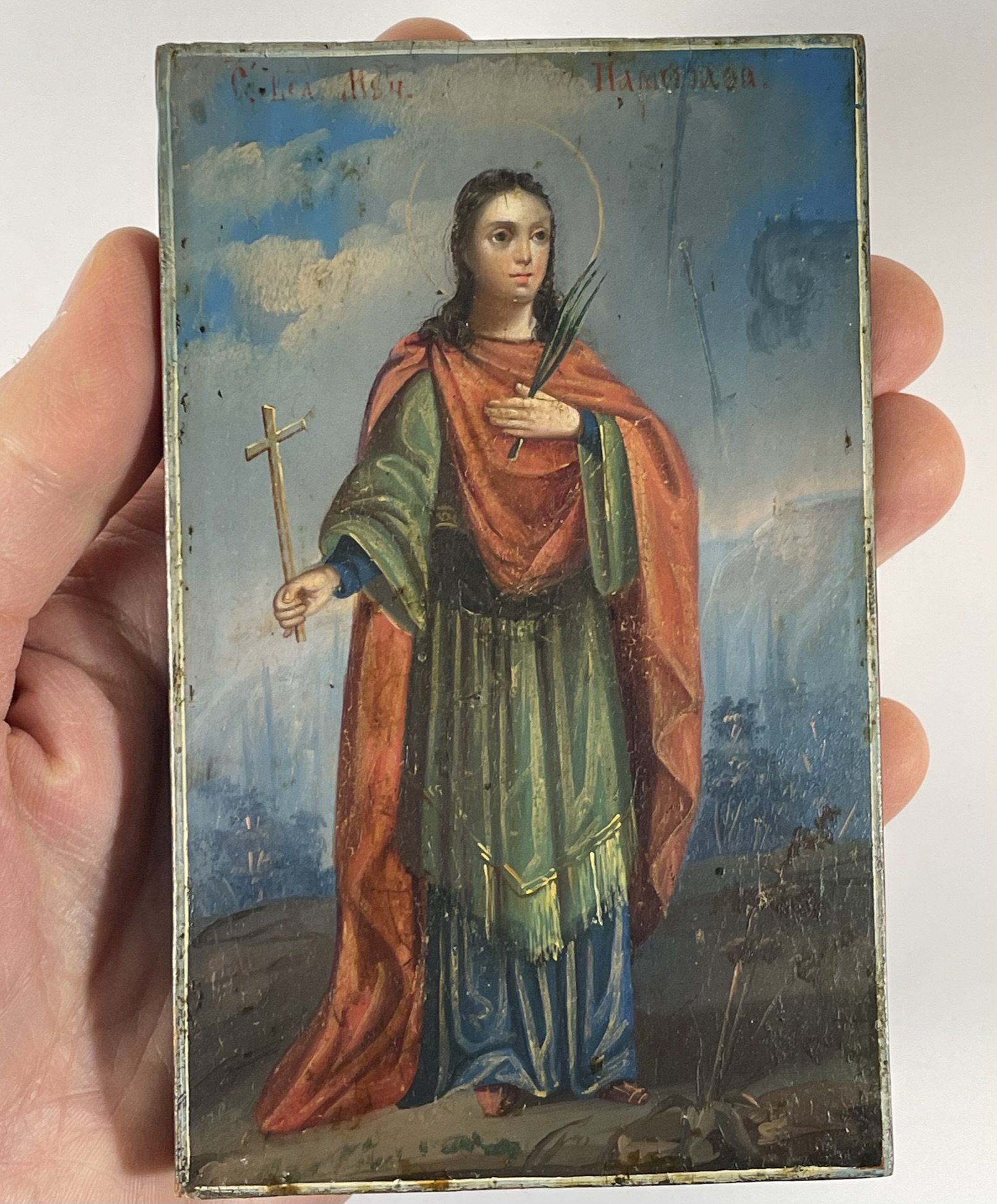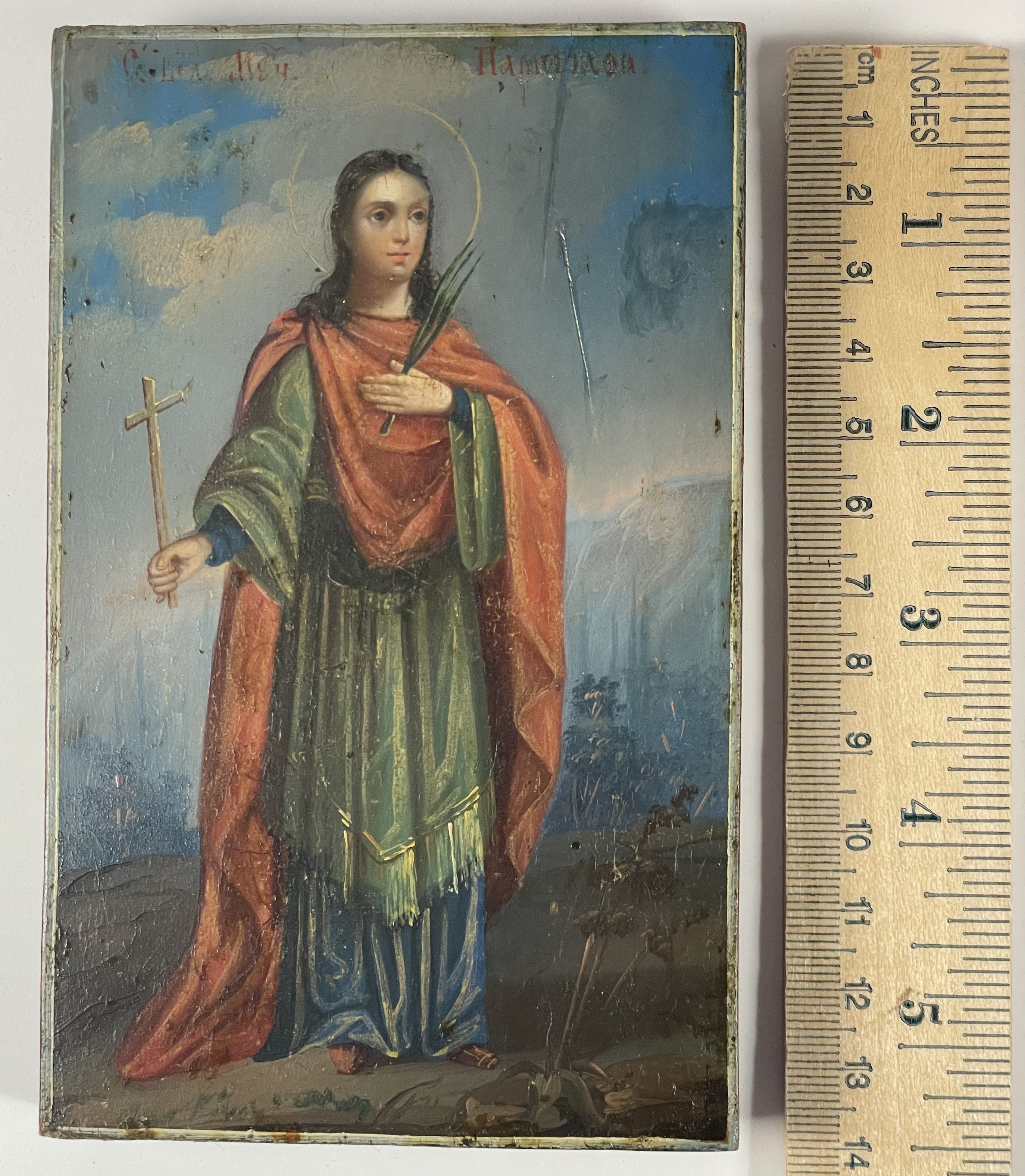 The icon depicts St. Martyr Pelagia of Tarsus (Greek: Πελαγία, † early 4th century), a legendary Christian saint and martyr who lived in Tarsus in Cilicia (southeastern Asia Minor) during the reign of Roman emperor Diocletian. According to her vita, Pelagia was born in the 3rd century in Tarsus (the Cilician region of Asia Minor) in a family of noble pagans. The girl was distinguished by her extraordinary beauty, received a good education, and the emperor Diocletian decided to make her the wife of his adopted heir, who was captivated by her beauty. Pelagia, who heard about Christians, their faith and martyrdom, was baptized by Bishop Clinon in Tarsus. After that, she refused to marry the adopted son of Diocletian and was brought by her mother to the Emperor, who, after seeing her beauty, wanted to make her his wife. Pelagia refused Diocletian, confessed herself as a Christian, and was executed by being burned in a red-hot copper bull. The bones of the saint were collected by local Christians and buried on one of the hills in the vicinity of the city. Emperor Constantine I the Great built a holy church over the relics of Pelagia.