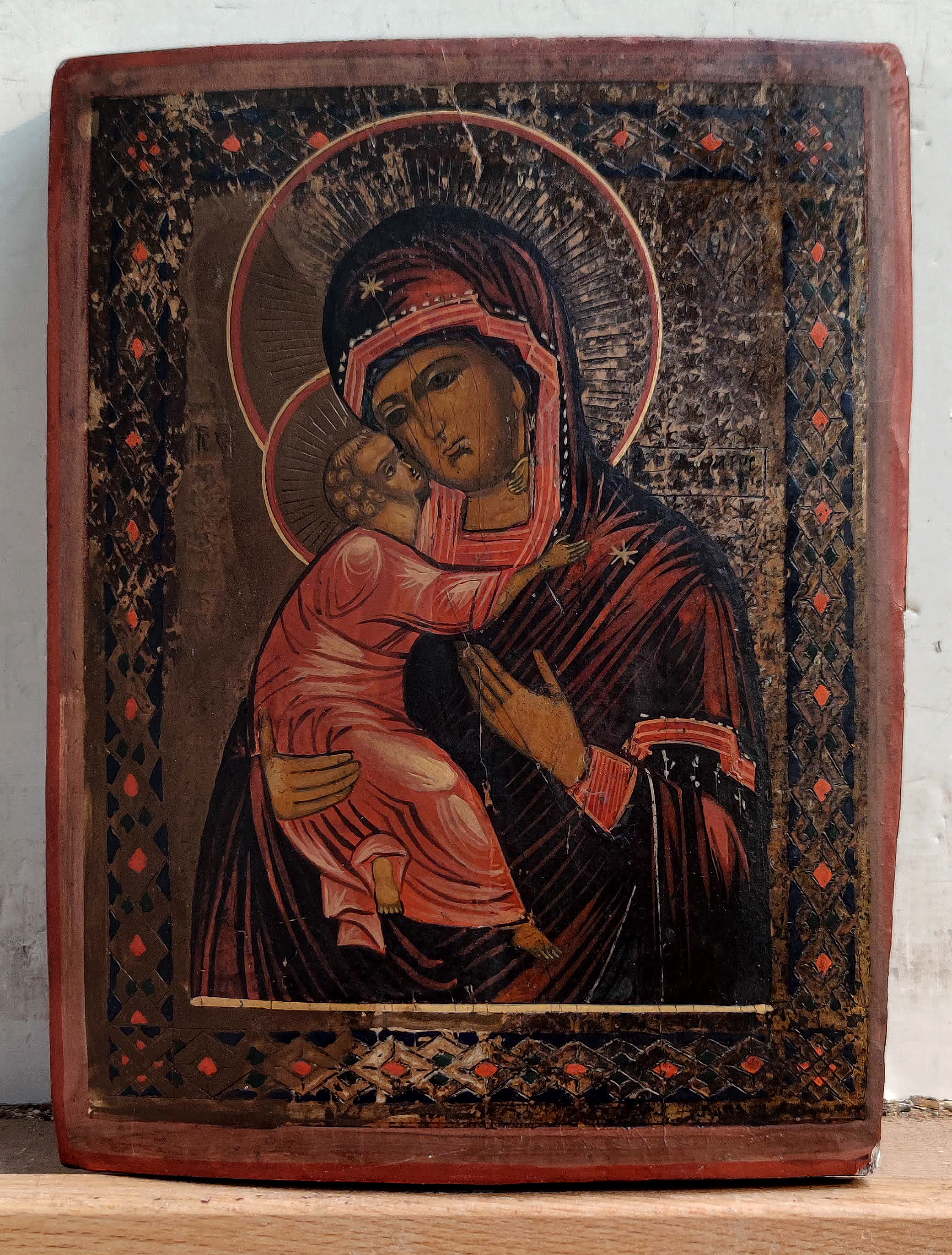 Our Lady of Vladimir is one of the most highly venerated Orthodox icons and a typical example of Byzantine iconography. The original 12th-century icon survived and is displayed in the Tretyakov Gallery museum in Moscow. Even more than most famous icons, the original has been copied repeatedly for centuries and many copies now have considerable artistic and religious significance of their own. The icon is a version of the Eleusa (Tenderness) type, with the Christ child snuggling up to his mother's cheek. The venerated image was used to celebrate the coronations of tsars, the elections of patriarchs, and other important ceremonies of the Russian state. Her feast day is June 3.