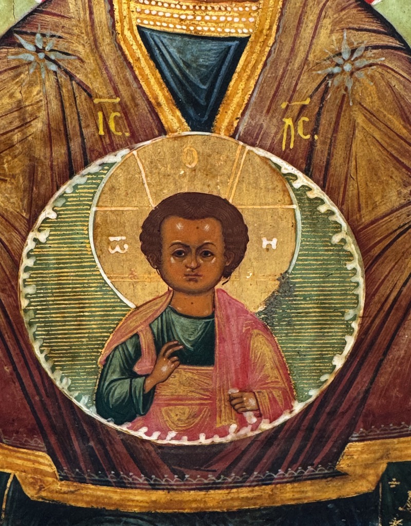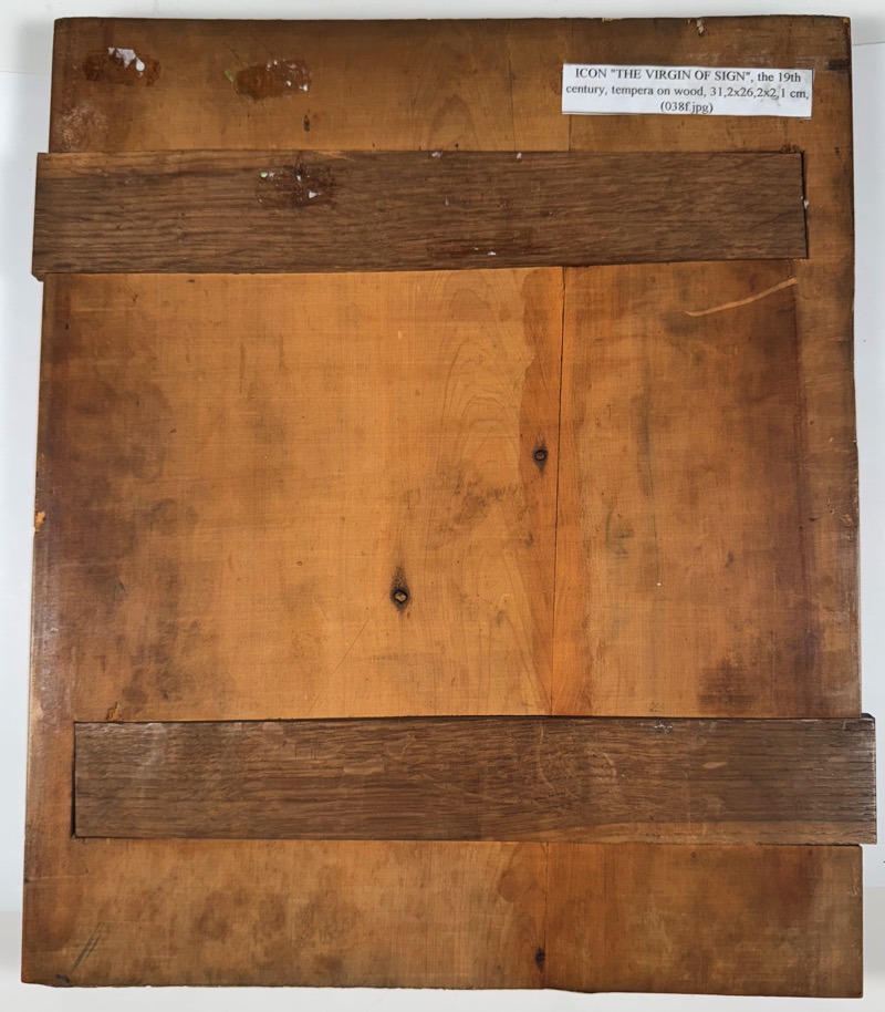 Our Lady of the Sign is one of the most beloved Russian miracle-working icons of Theotokos. The icon depicts Her during the Annunciation at the moment of saying, "May it be done to me according to your word." (Luke 1:38). The Virgin Mary is depicted frontally half-length, with her hands raised in a praying position, and the Child Jesus within a round aureole upon her breast representing him at the moment of his conception. The term Virgin of the Sign is a reference to the prophecy of Isaiah 7:14: "Therefore the Lord himself shall give you a sign; Behold, a virgin shall conceive, and bear a son, and shall call his name Immanuel."