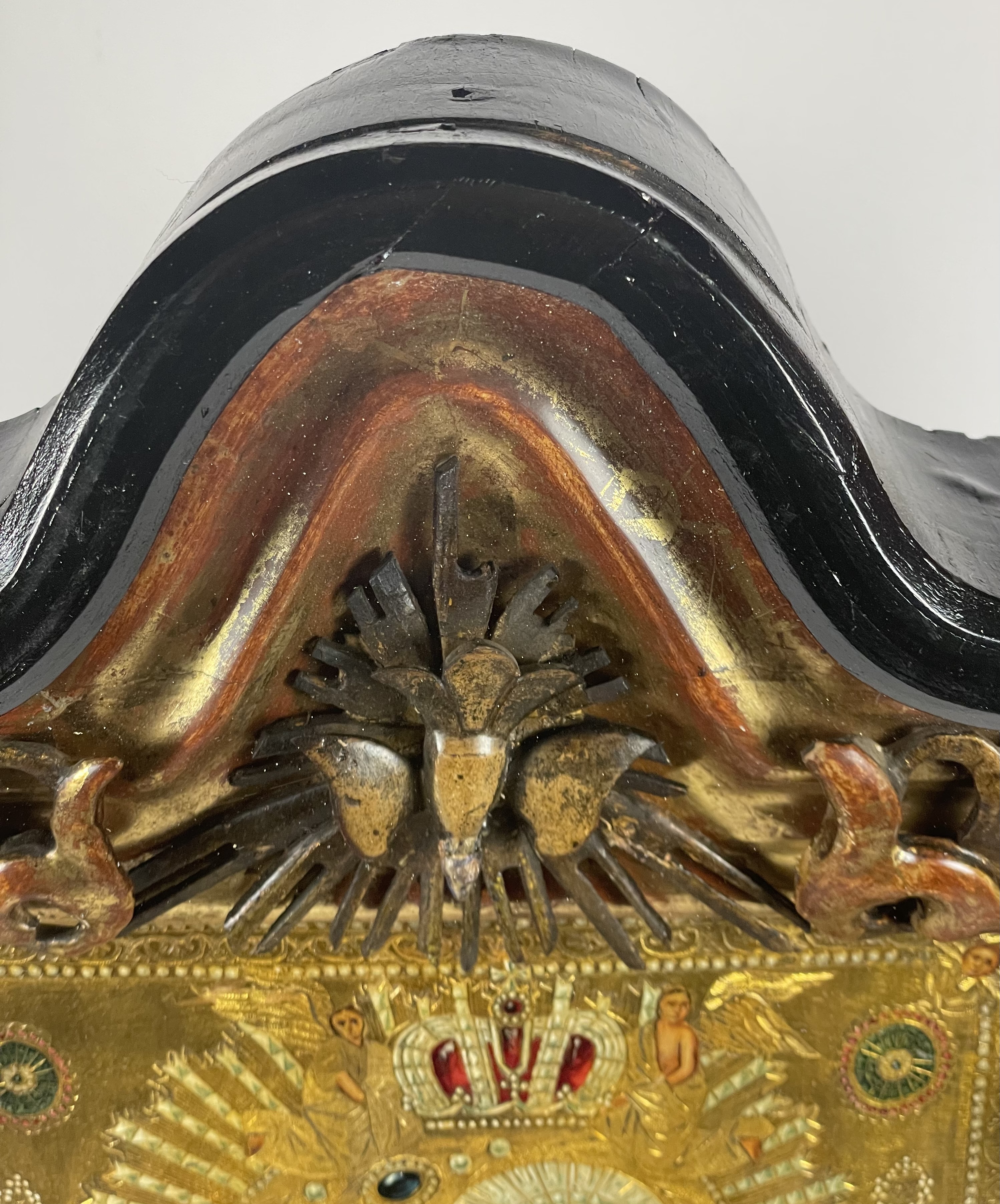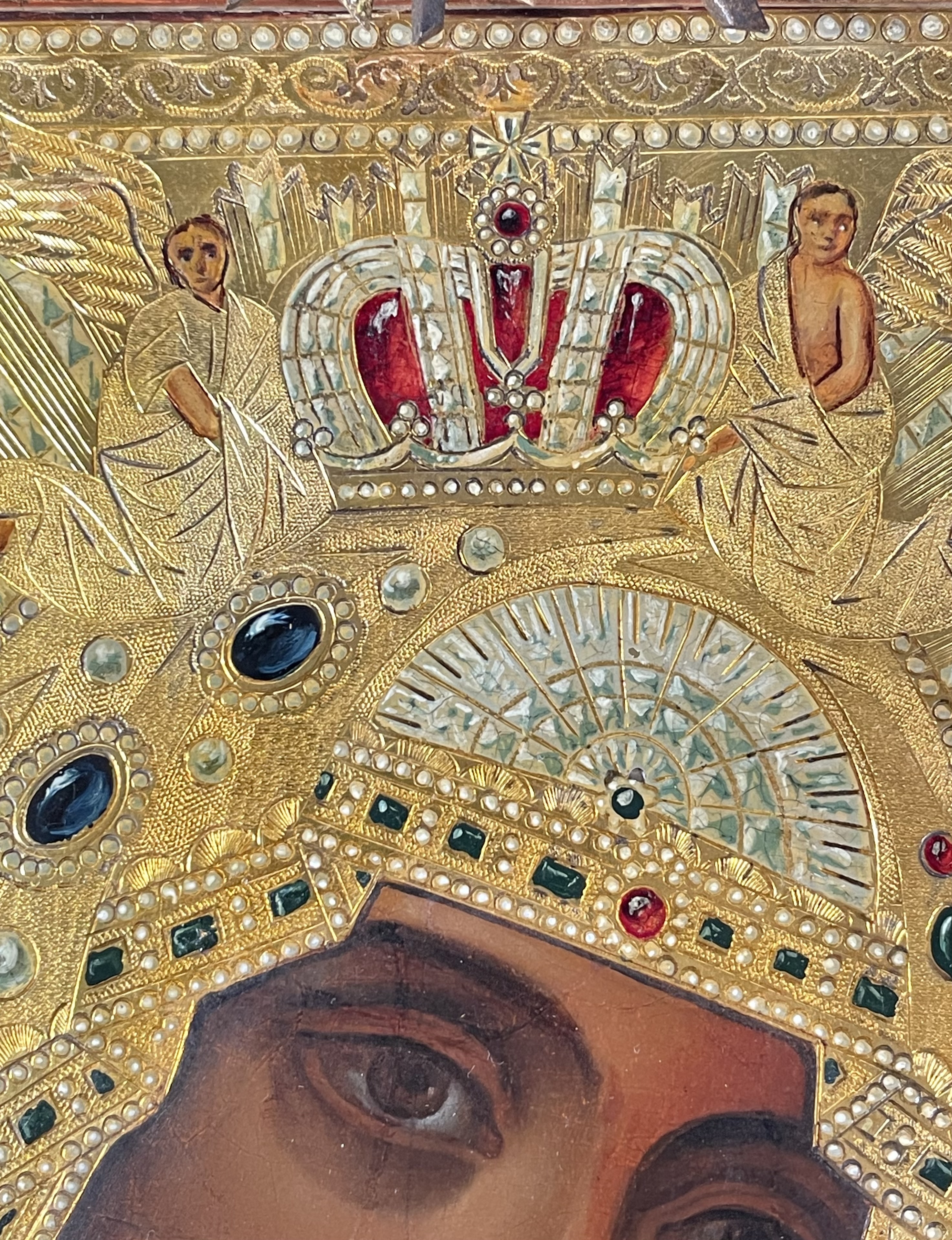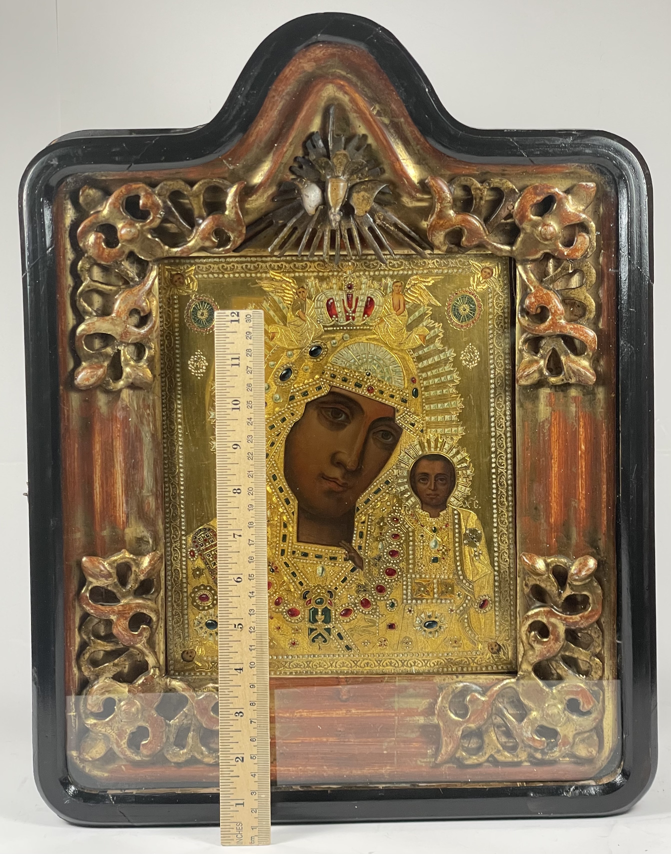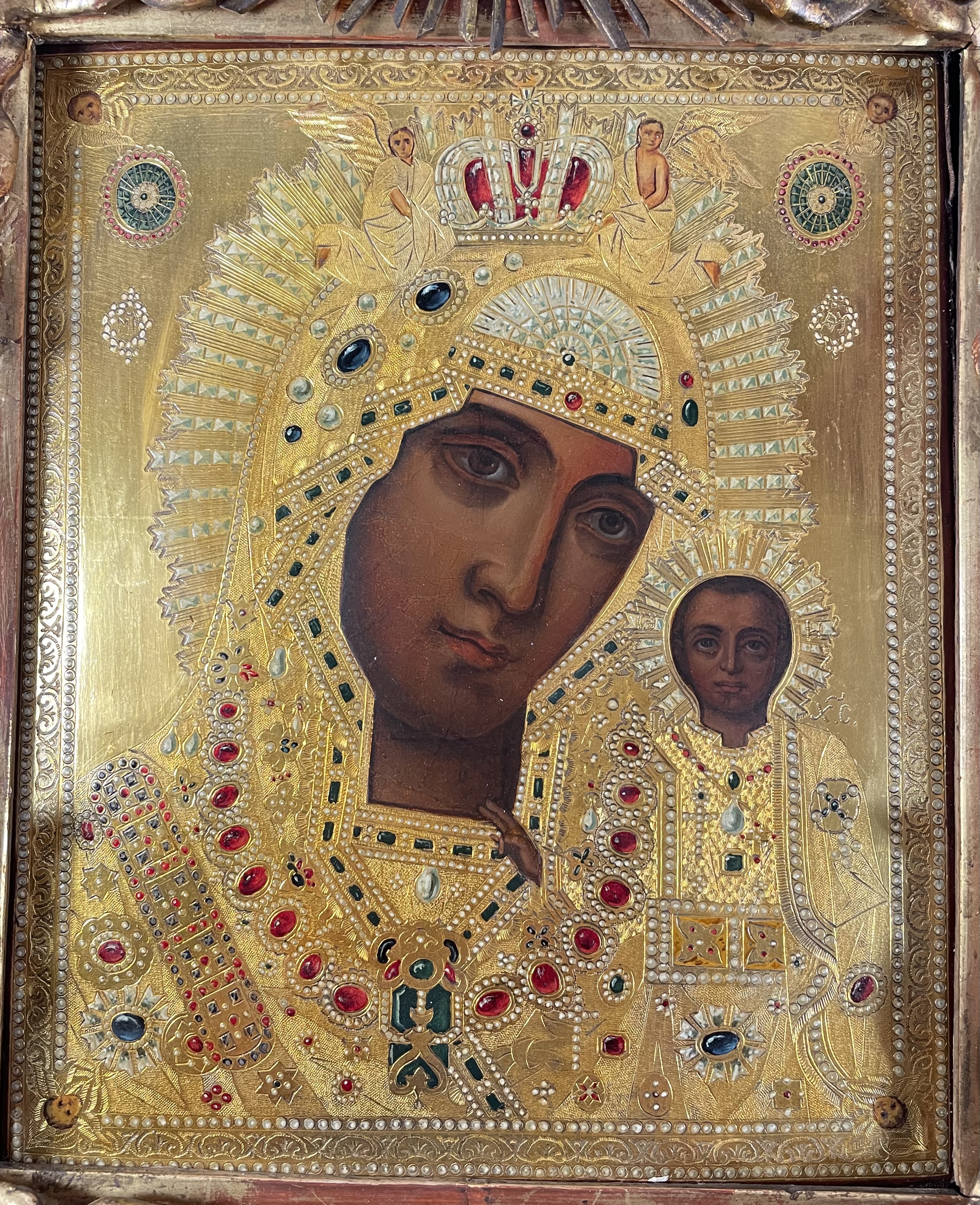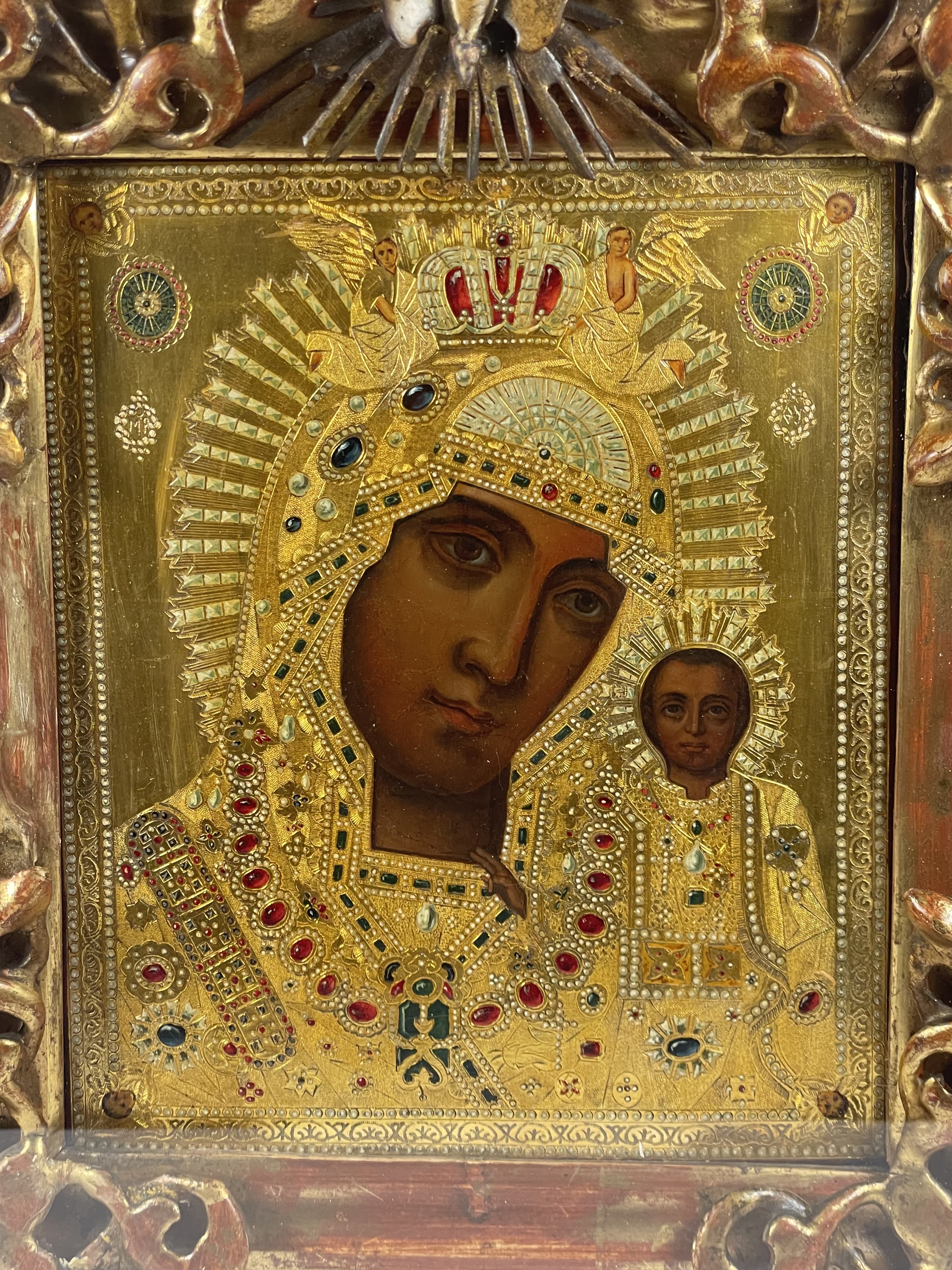 The Teotokos in the iconography of Our Lady of Kazan is depicted on the ground of pure gold imitating the precious revetment cover of the original. The icon is held in a large and ornate glass-fronted shadowbox kiot frame that was painstaikenly restored to near-perfect condition.