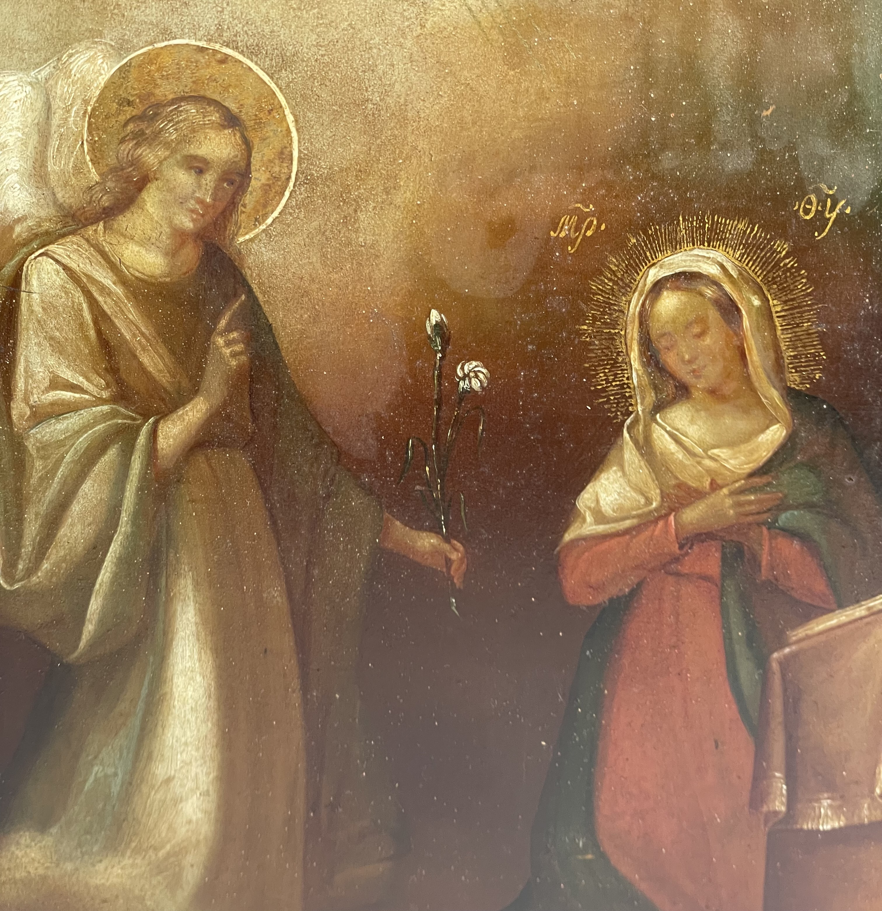 The Annunciation of the Blessed Virgin Mary, is the Christian celebration of the announcement by the angel Gabriel to the Virgin Mary that she would conceive and become the mother of Jesus, the Son of God, marking his Incarnation. Gabriel is shown blessing with one hand and holding a stem of lilies in the other, while the Virgin Mary is depicted turned towards the Angel holding the book of Gospels opened on Luke (1:29): "You will conceive and give birth to a son, and you are to call him Jesus."