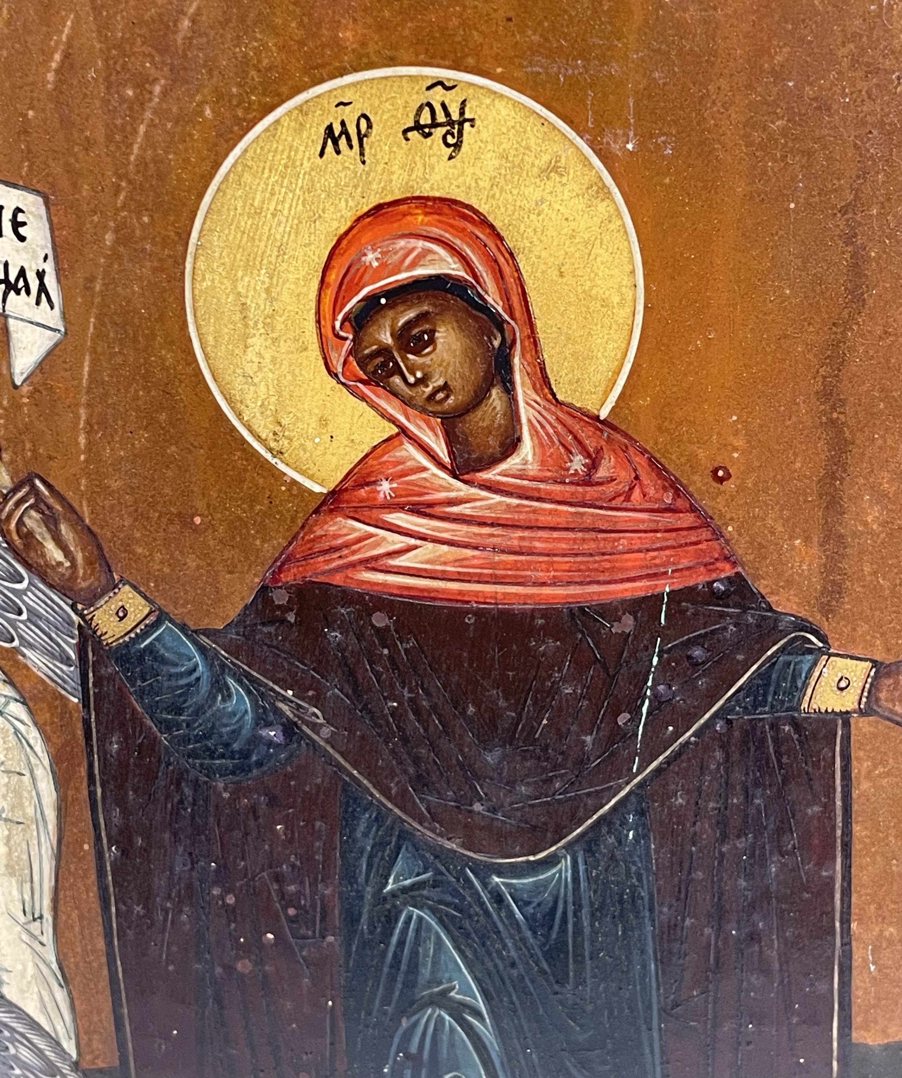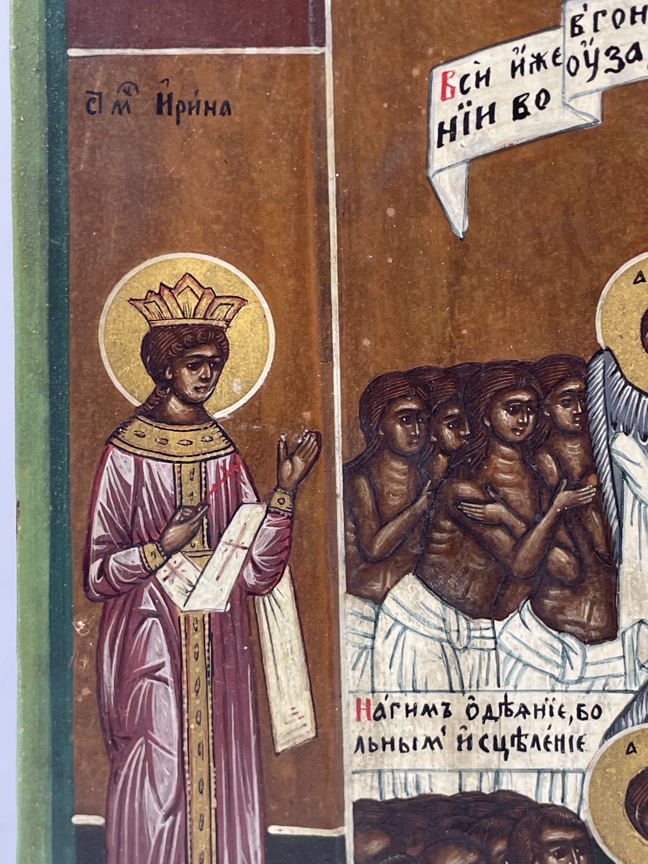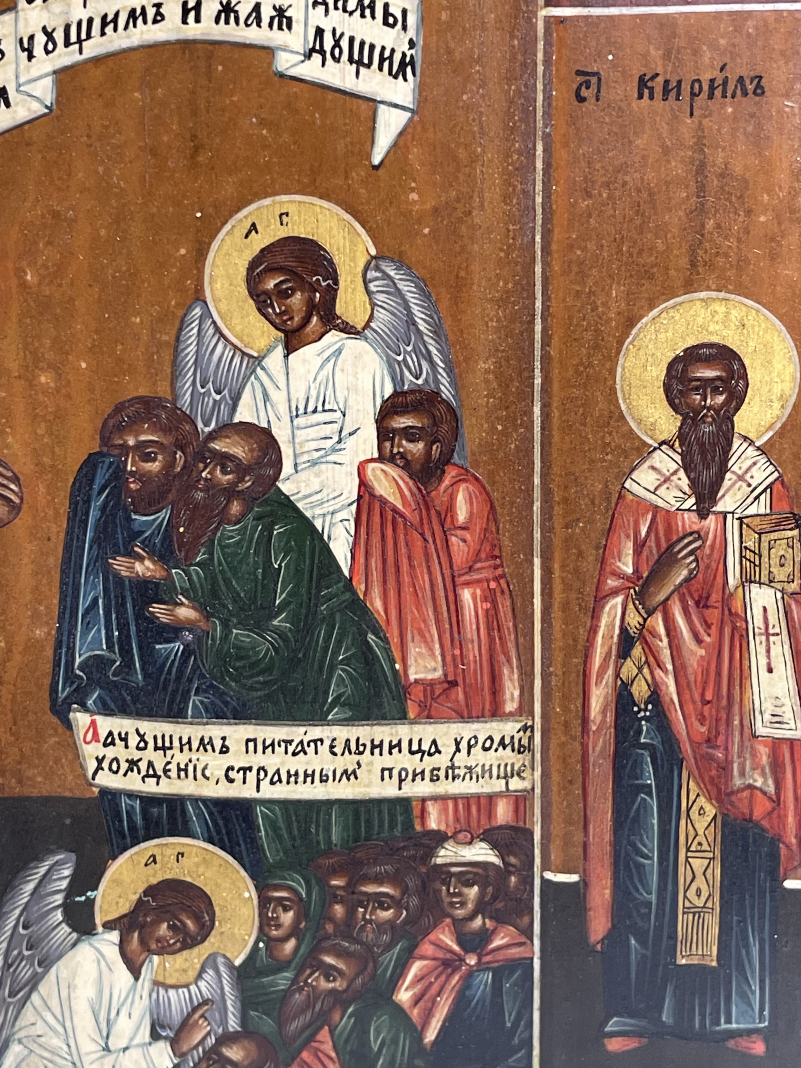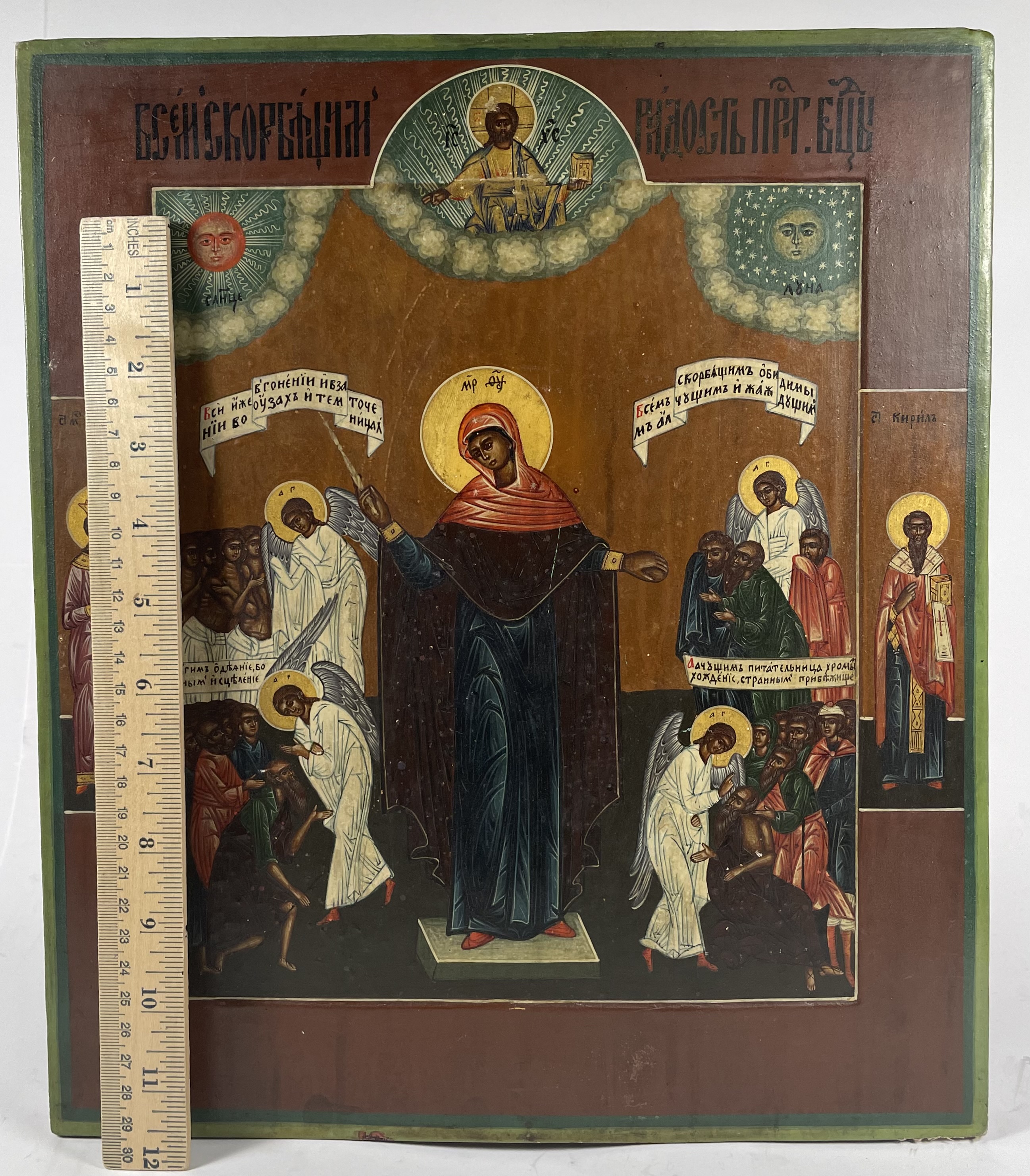 Mother of God, Joy to All Who Sorrow of Moscow is the name of a famous wonderworking Russian Orthodox icon. The icon dates to a miracle that occurred on October 24, 1688, when a woman named Euphemia received healing from sickness after obeying a voice telling her to find this icon and have the priest celebrate a prayer with the blessing of water. The design of this icon depicts the Mother of God, depicted full-figured standing with her Son in Heaven and blessing Christ above her in the clouds. Along both sides of the icon, framing the Mother of God, depicted are many suppliants asking for her intercession assisted by the angels. The tenderness and kindness of a loving mother are evident in her face as She stands in paradise and yet among us.