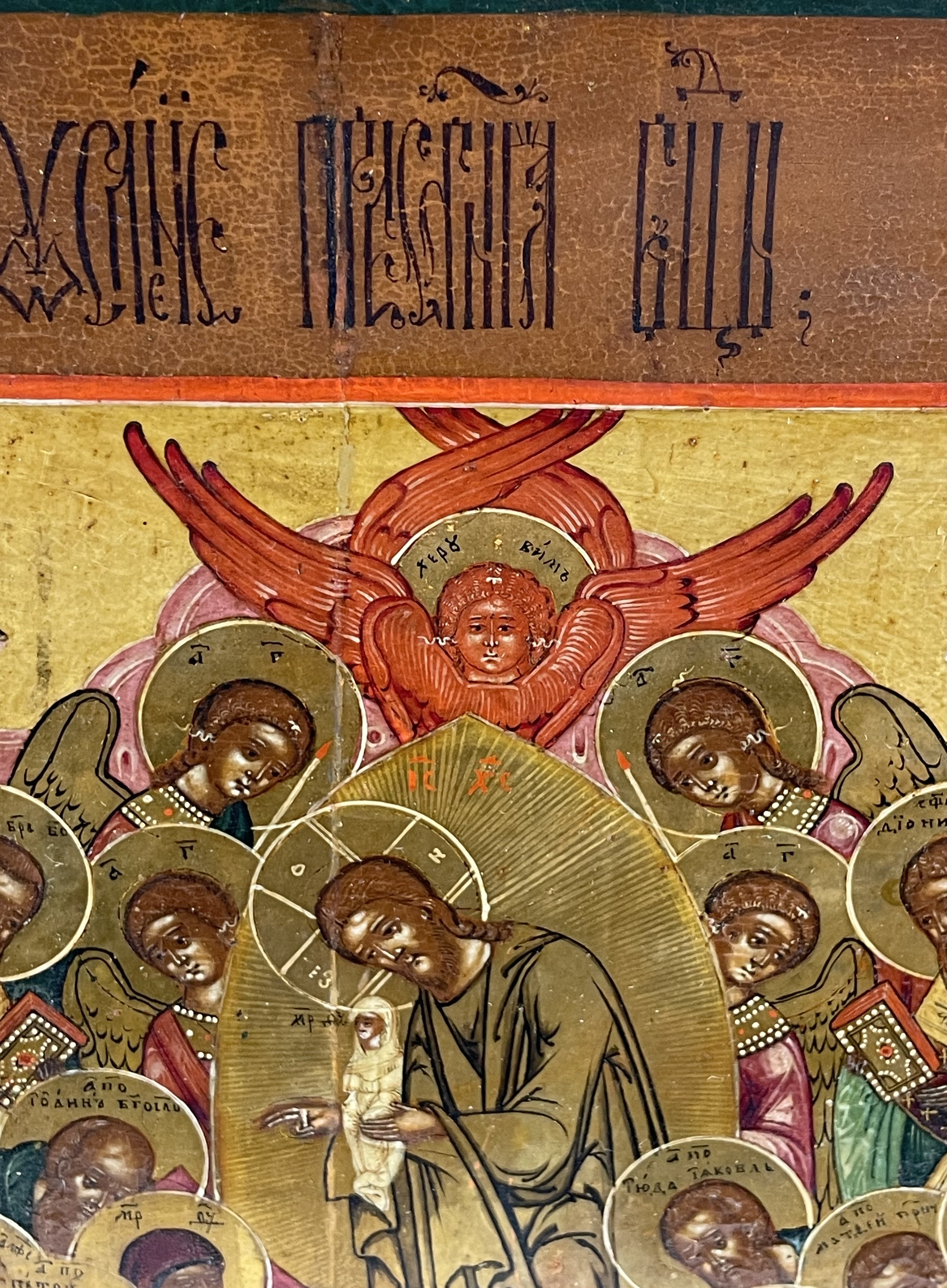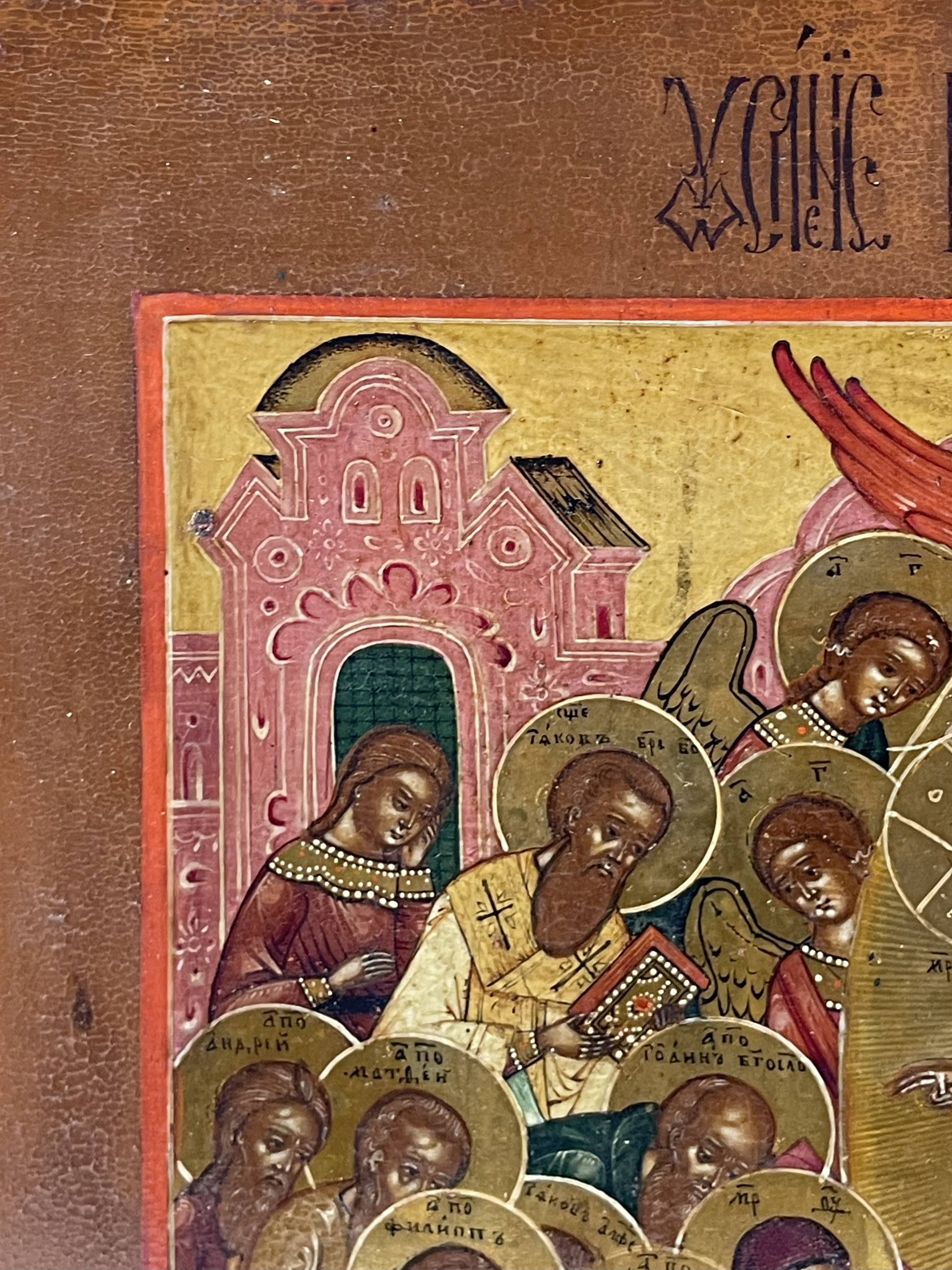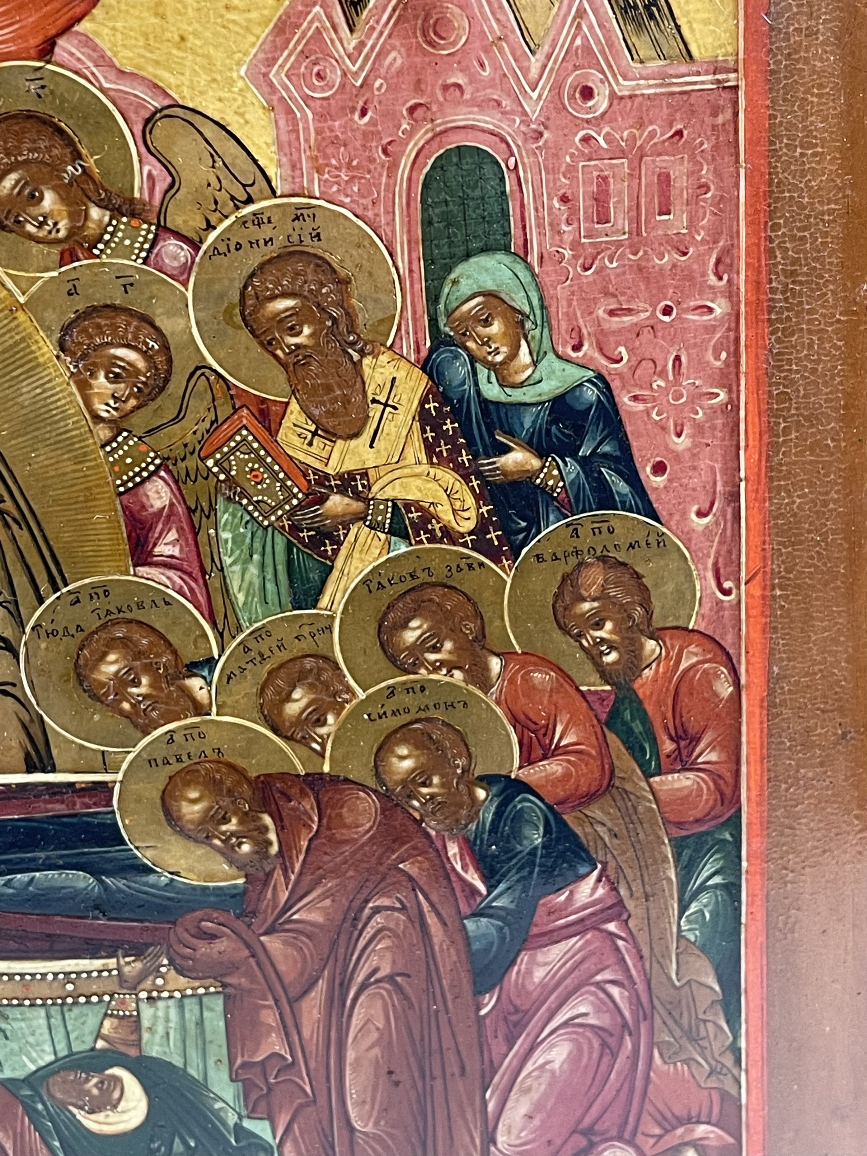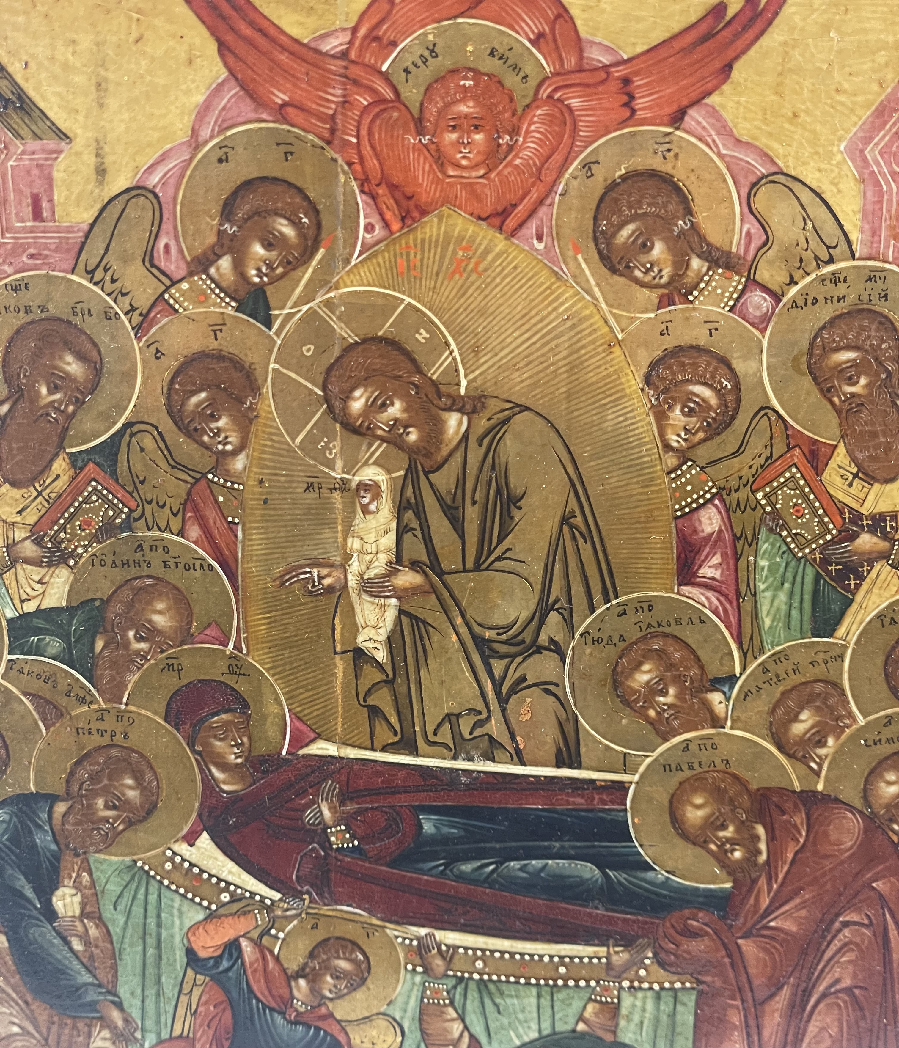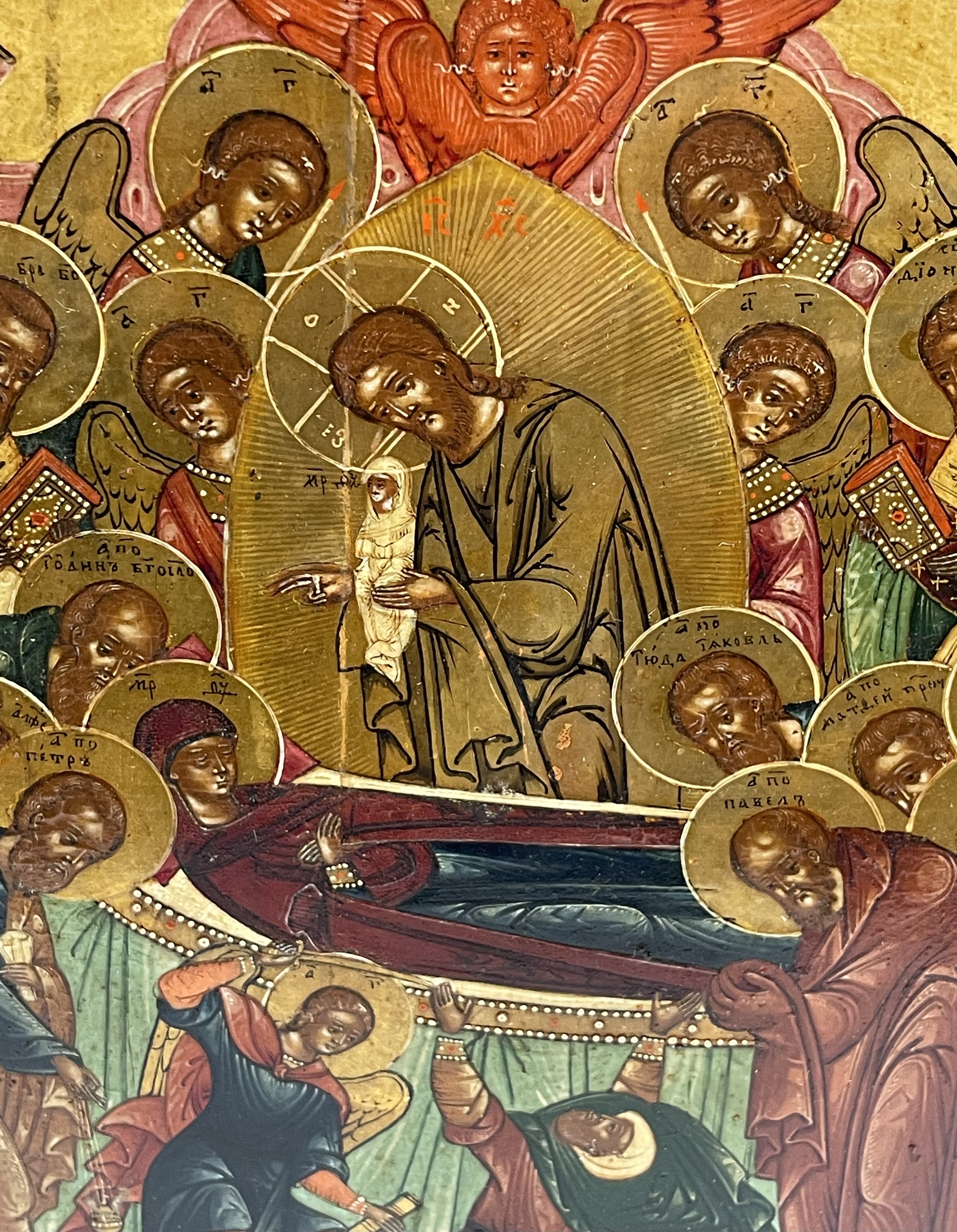 The Dormition of the Most Holy Mother of God is a Great Feast of the Eastern Orthodox Church (corresponding to the Western feast of the Assumption) which commemorates the "falling asleep" or death of the Mother of God, and her bodily resurrection before being taken up into Heaven. The Theotokos is depicted lying on a bier, surrounded by the twelve Apostles. At the center, Jesus Christ is shown in a golden mandorla, swaddling the soul of the Virgin Mary. On the lower center, the assault of the High Priest is depicted in which the Jewish priest's hands were cut off by the Archangel Michael after he unsuccessfully tried to overturn Mary's brier.