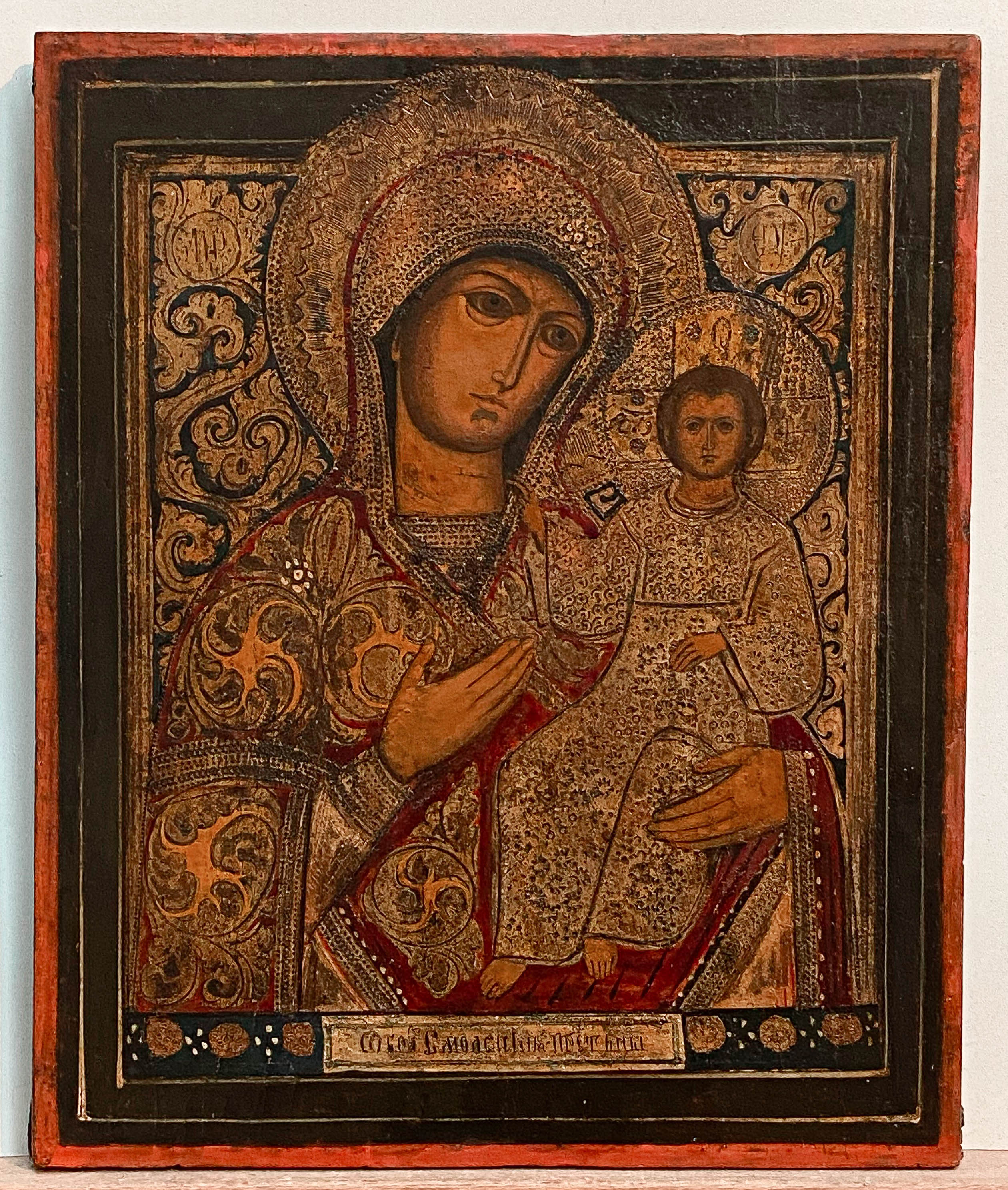 Our Lady of Smolensk is the name of an ancient miracle-working icon and one of Russia's most highly venerated icons. According to tradition, after the fall of Constantinople, the original icon painted by St. Luke surfaced in Russia, where it was placed in the Assumption Cathedral in Smolensk and therefore referred to as Our Lady of Smolensk. The original icon, dated by art historians to the 11th century, is now believed to have been destroyed by fire during the German occupation of Smolensk in 1941, but a great number of copies were made throughout the century, some of considerable historical and artistic value of their own.