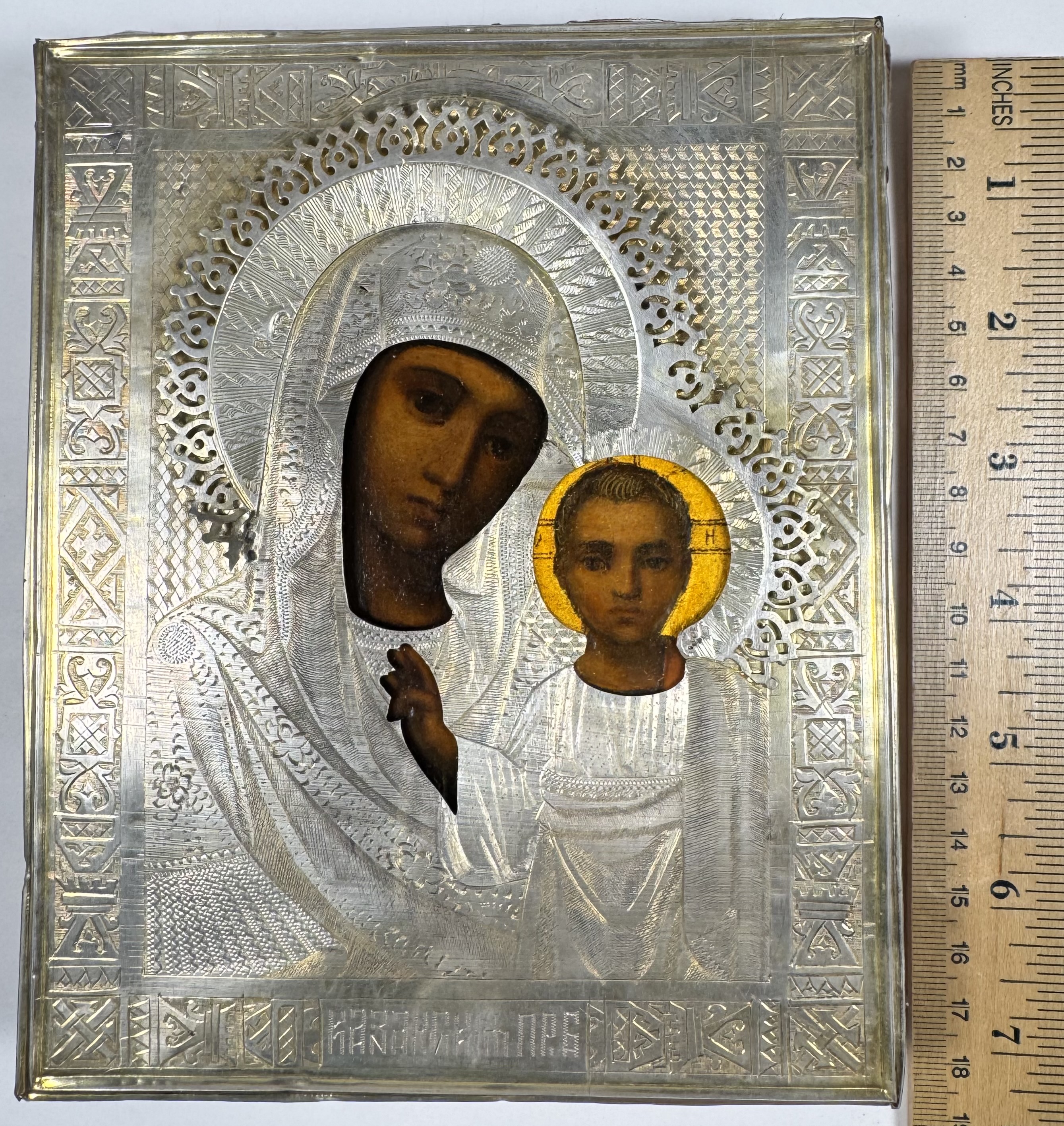 The icon has a silver revetment cover with a Russian 84 zolotniks (875/1000) silver purity marks and СГ maker's mark of Semyon Galkin from Moscow.